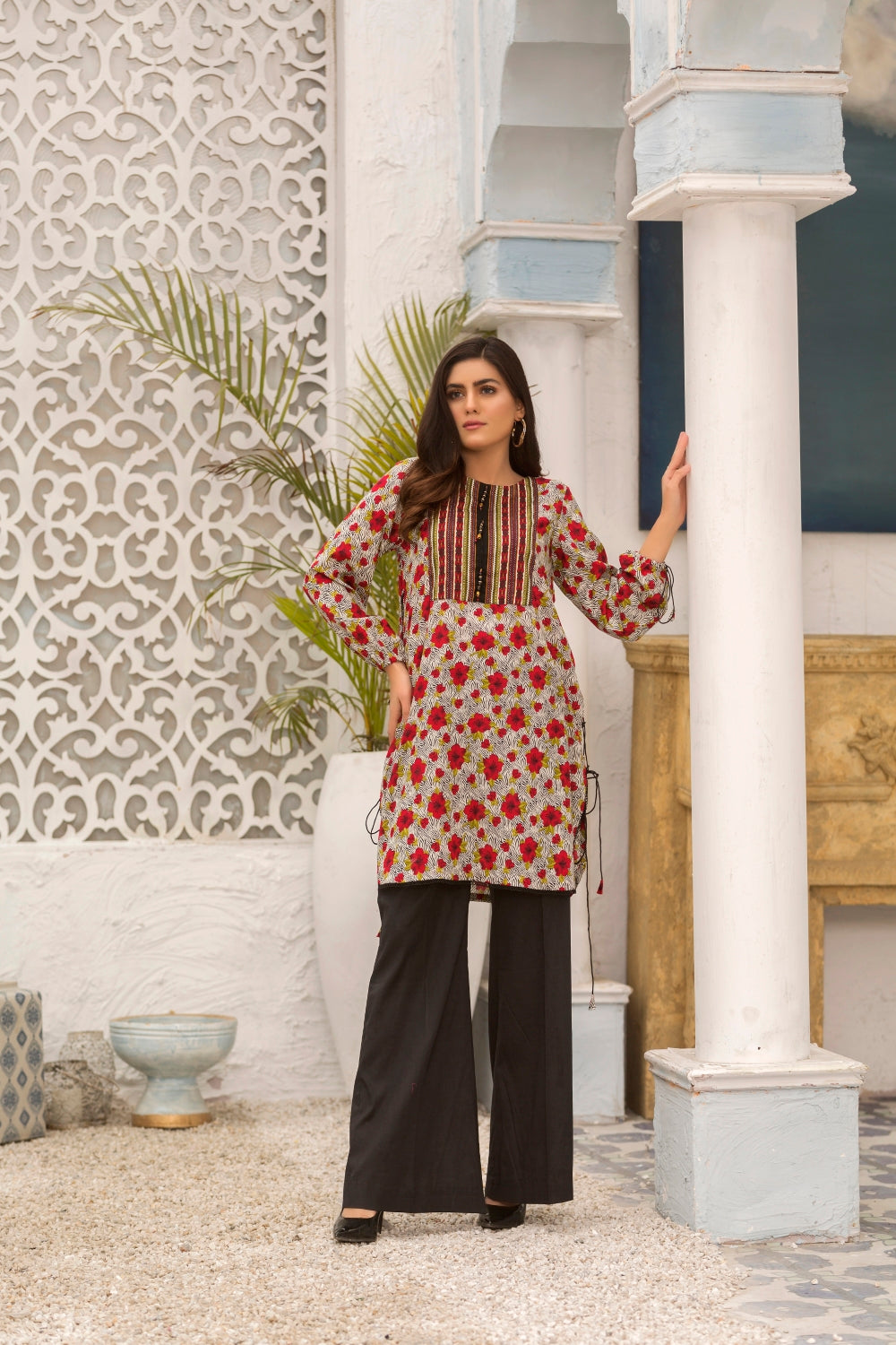 Stitched articles come with trousers tailored to match the unstitched trouser fabric provided. Please note that any appearance of shararas/ghararas in product images is for shoot purposes only unless otherwise specified in product details.