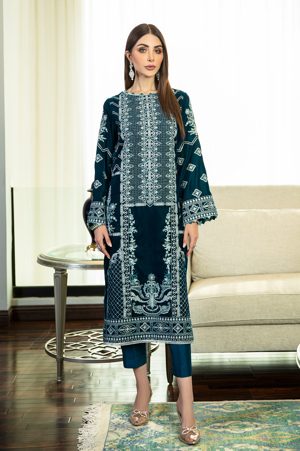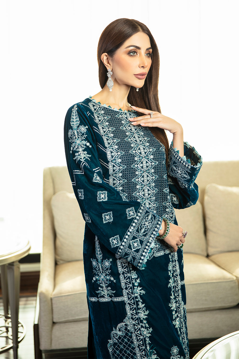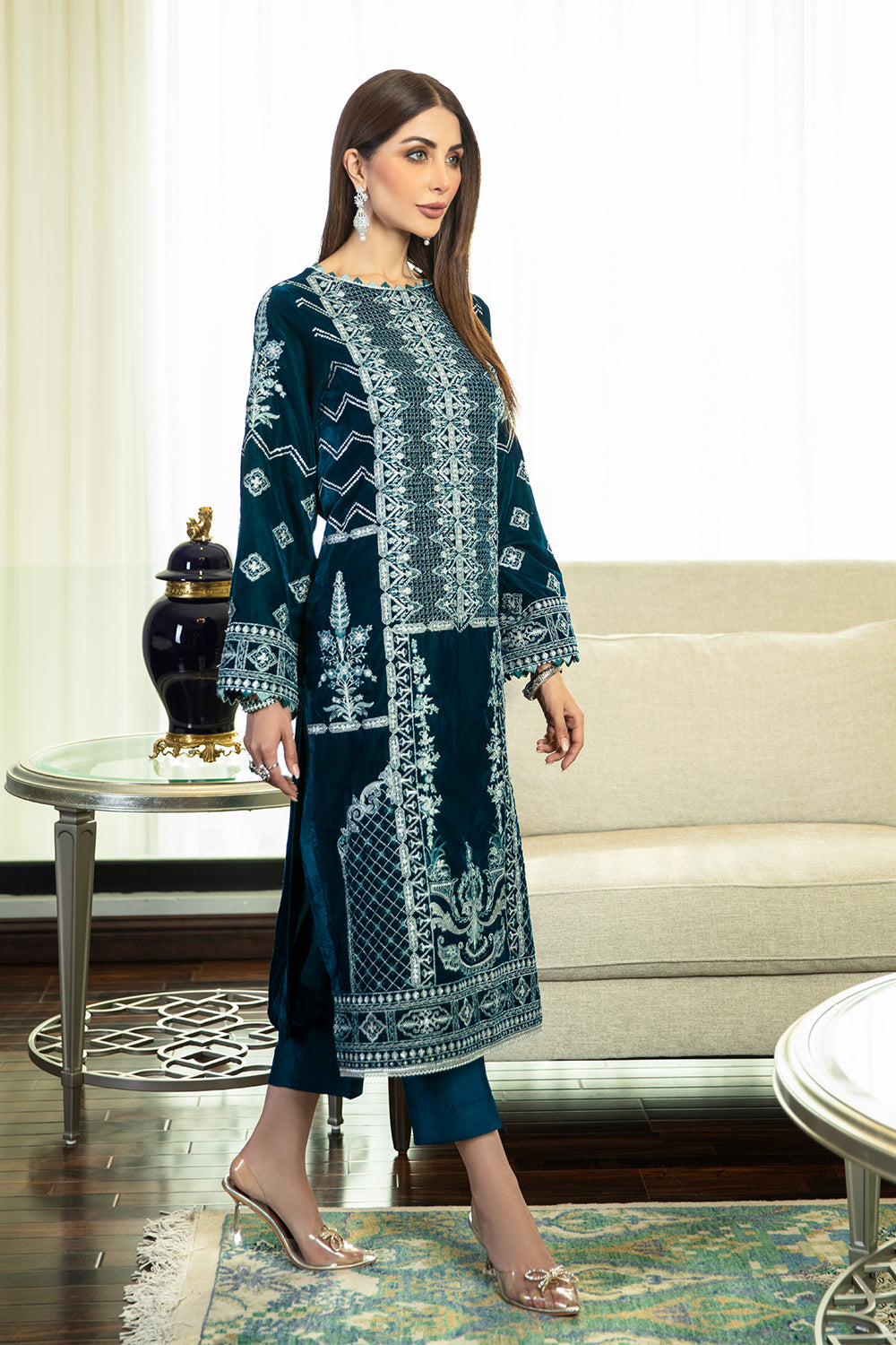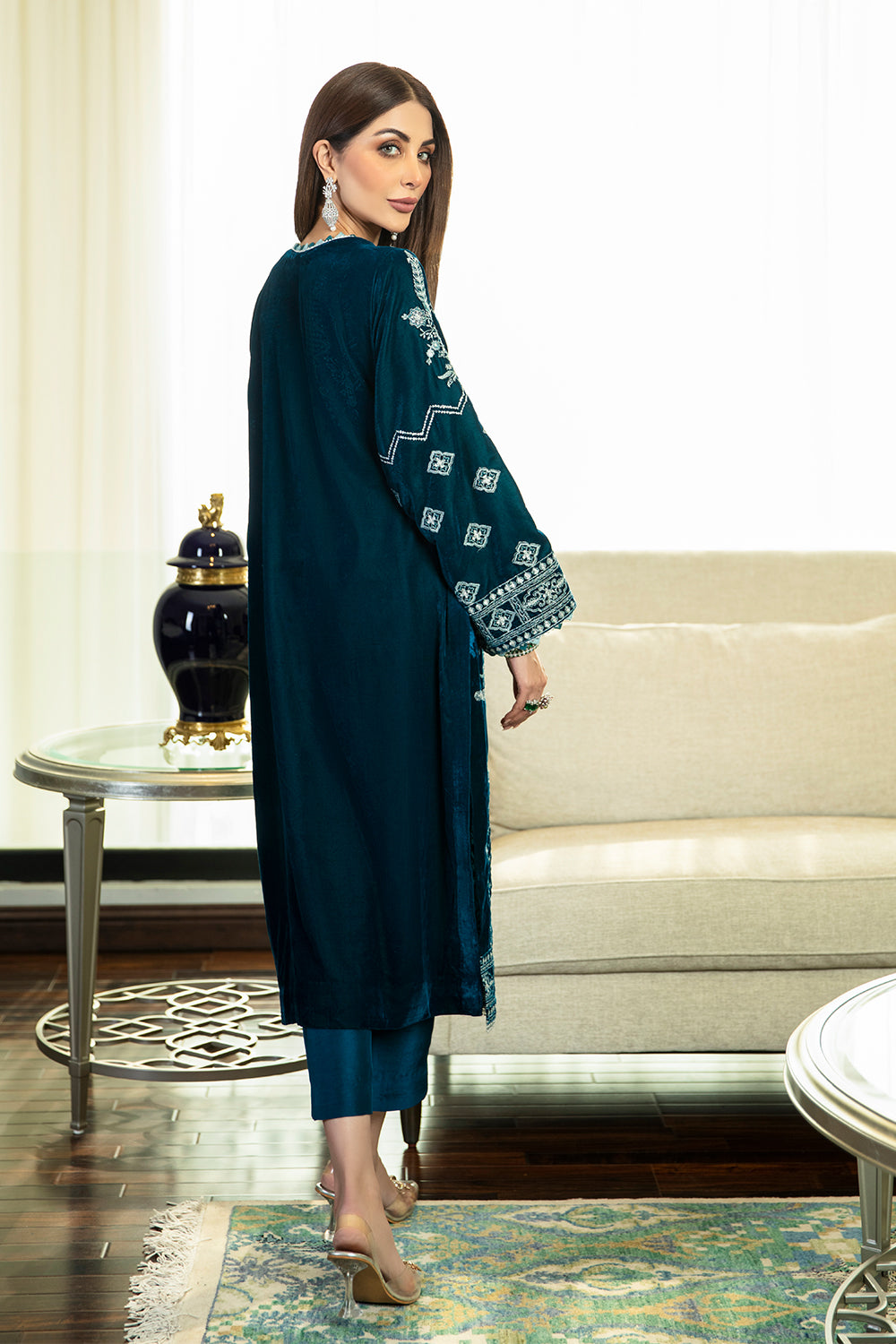 Stitched articles come with trousers tailored to match the unstitched trouser fabric provided. Please note that any appearance of shararas/ghararas in product images is for shoot purposes only unless otherwise specified in product details.