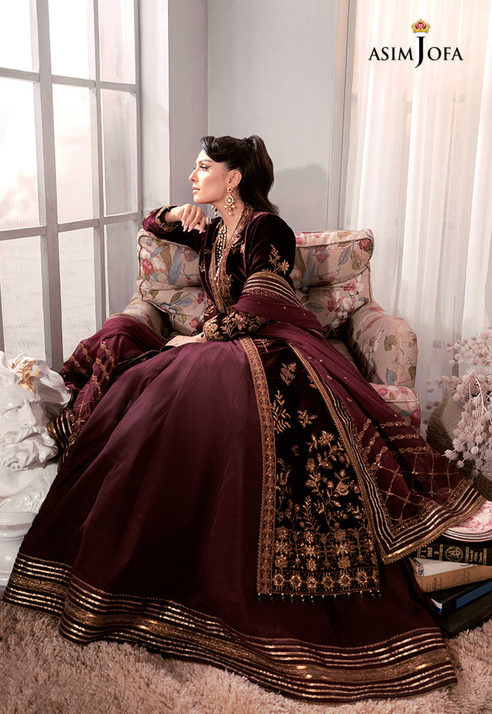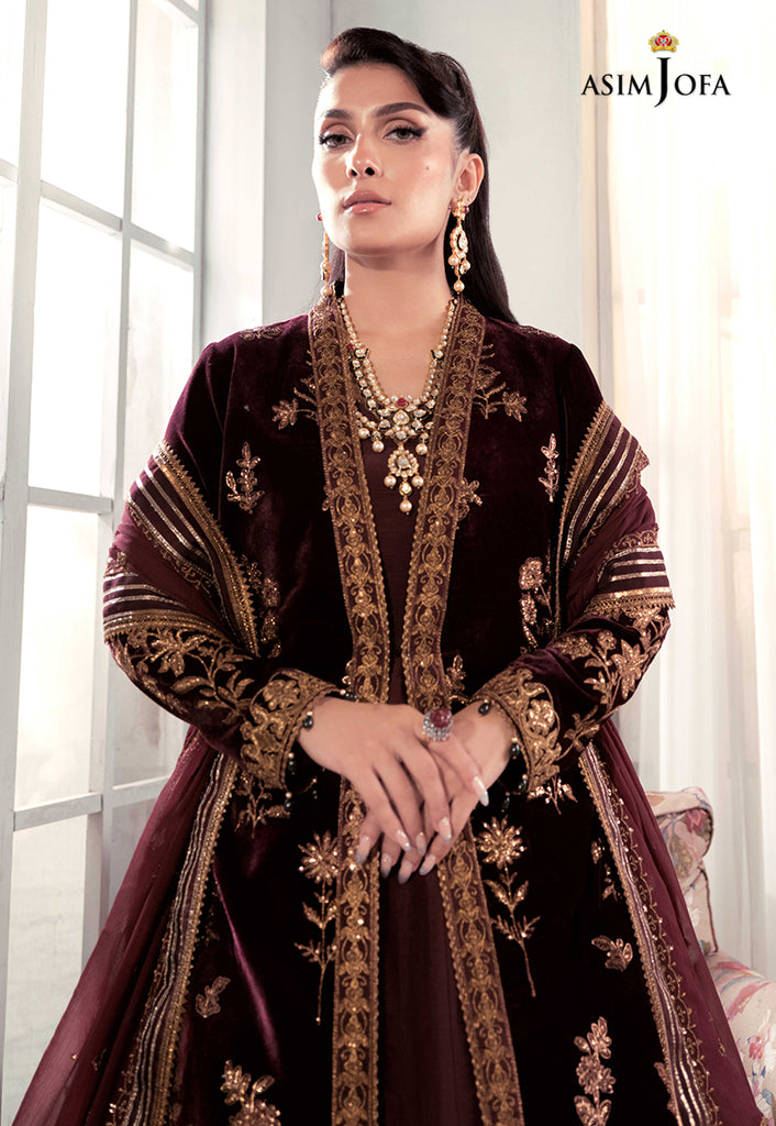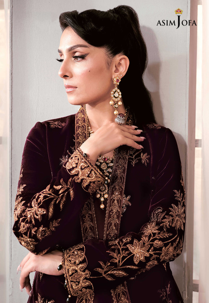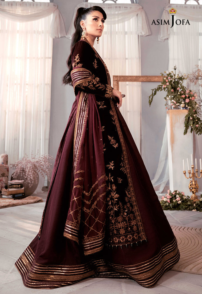 Looking exceptionally regal Ayeza Khan embodies grace decked in this deep mahogany velvet front open jacket, embossed with antique gold dori & lorex embroidered seamlessly with a dose of spangles. A bold pattern is evident in designing reminiscent of vintage era. The jacket is worn over a flared tulle gown & delicately embroidered chiffon dupatta with heavy pallus. This silhouette will be a timeless addition in your formal winter wardrobe.