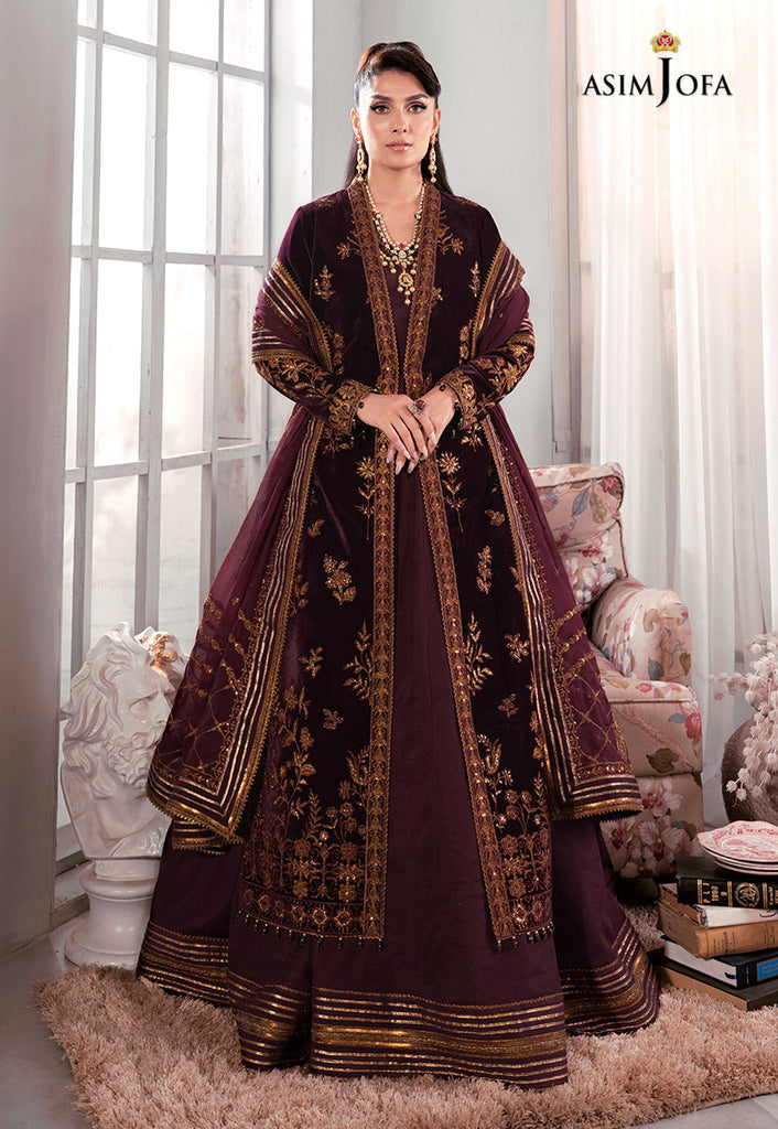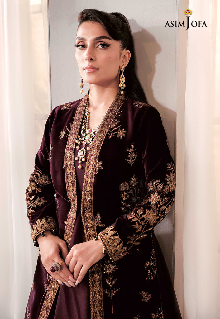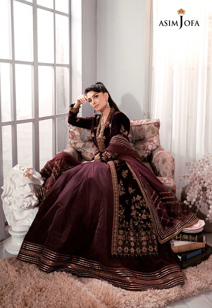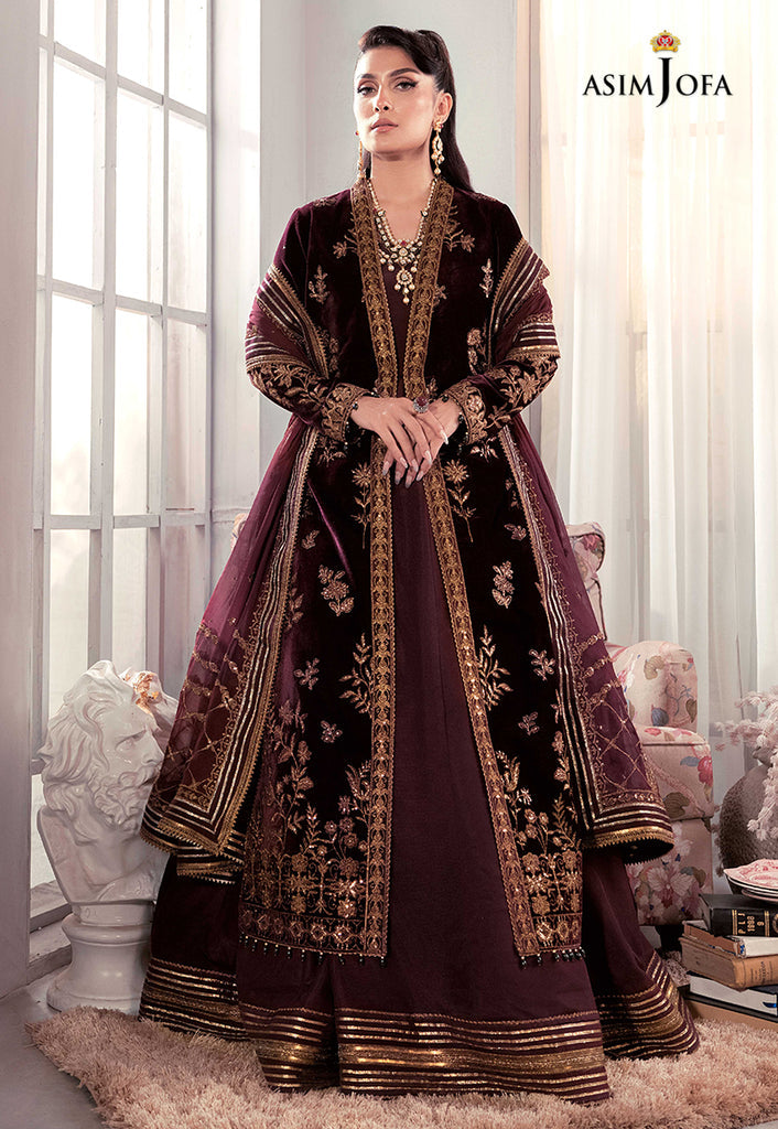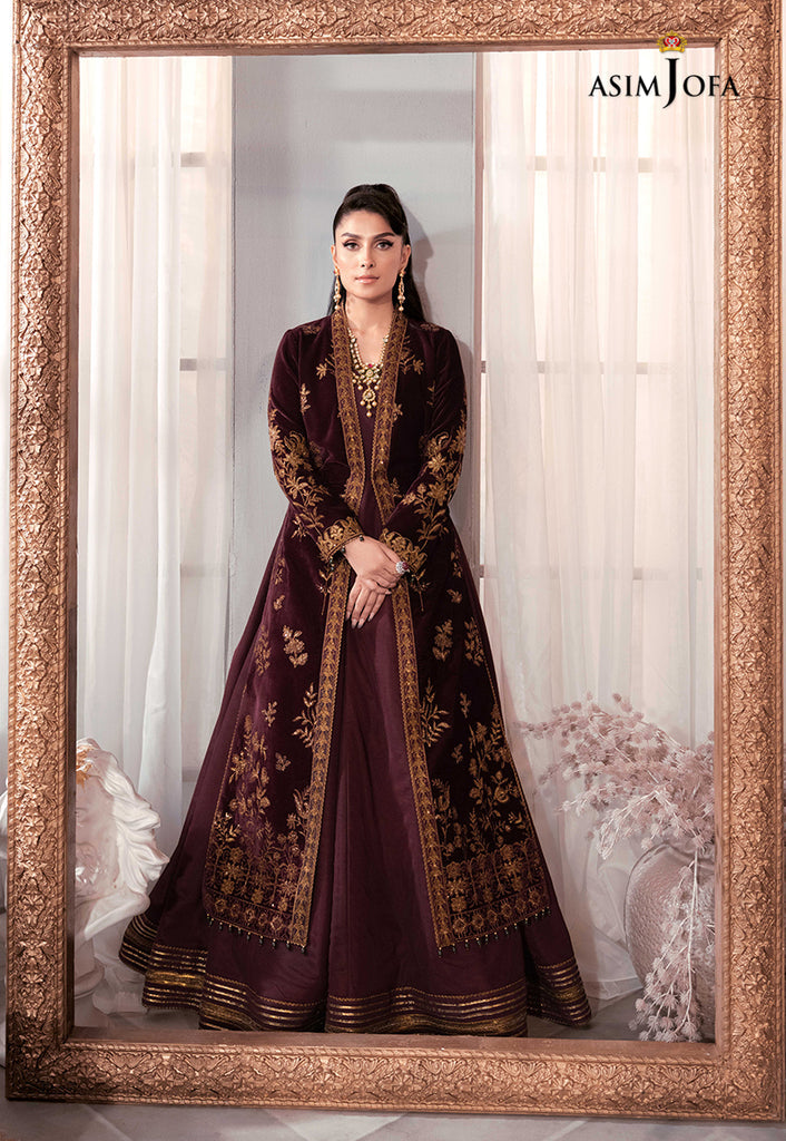 Looking exceptionally regal Ayeza Khan embodies grace decked in this deep mahogany velvet front open jacket, embossed with antique gold dori & lorex embroidered seamlessly with a dose of spangles. A bold pattern is evident in designing reminiscent of vintage era. The jacket is worn over a flared tulle gown & delicately embroidered chiffon dupatta with heavy pallus. This silhouette will be a timeless addition in your formal winter wardrobe.