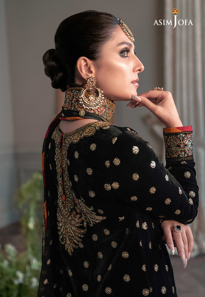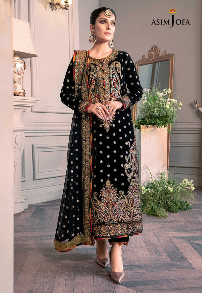 Obsidian: Winters never looked this beautifull. A rich design on obsidian velvet base fashioned in a sleek long shirt heavily worked in filigree embroidery with accents of beige, maroon, rust and aqua threads illuminated but expansive use of light gold sequins giving this design a glittering shine with every turn. To top it off equally heavy embroidered chiffon dupatta elevates this design to another level. It comes with solid dyed silk pants.