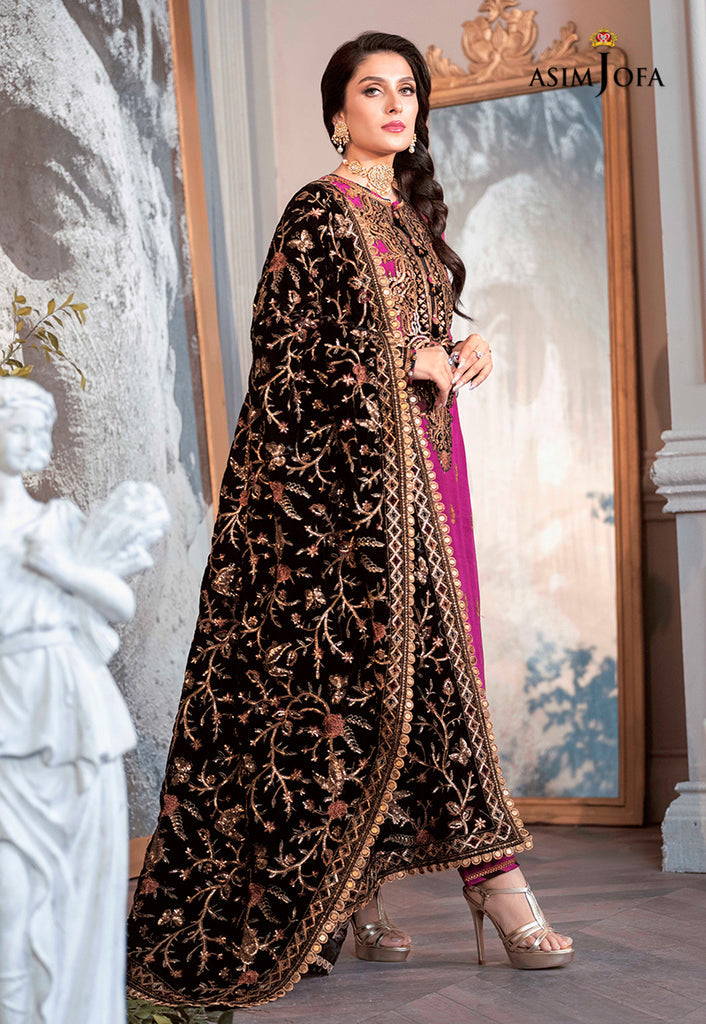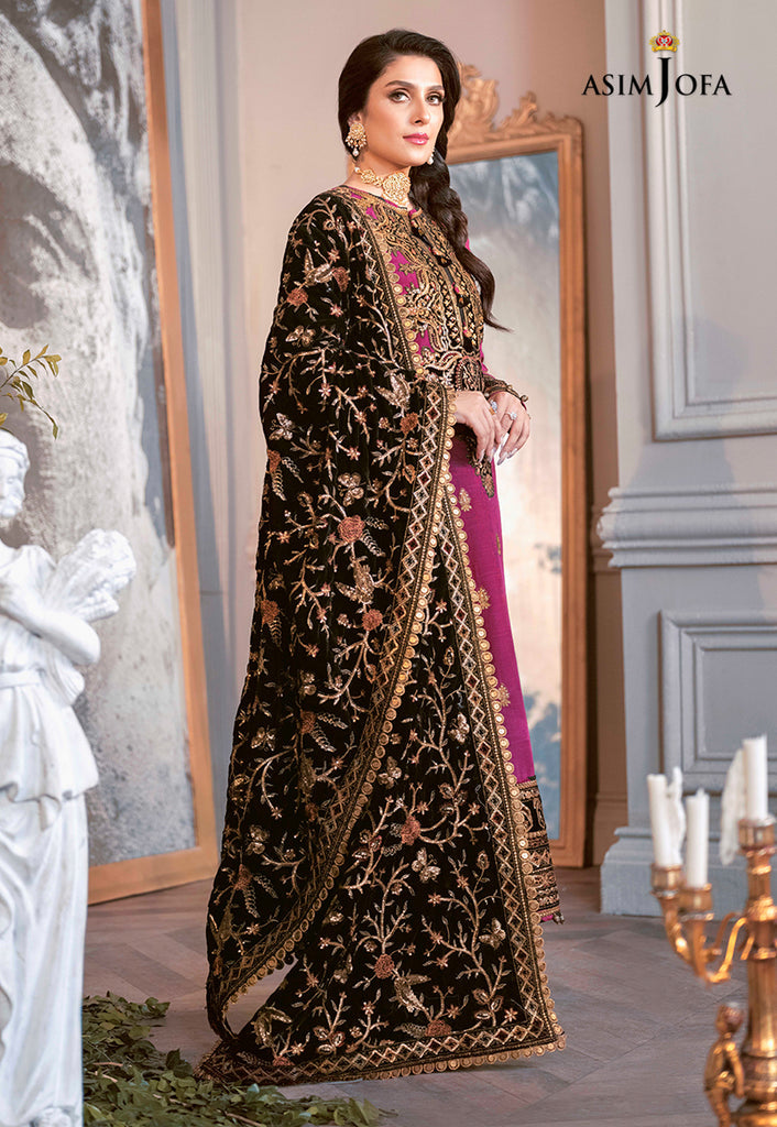 Eudialyte: A splash of beautiful colors are enlivened by statement embroidery on magenta silk base complemented by contrast velvet borders and neckline with threadwork and matte cupped Indian gold sequins adding character to this compelling design. It comes with a black heavily embroidered shawl in a seamless pattern making it a perfect choice for winter weddings.