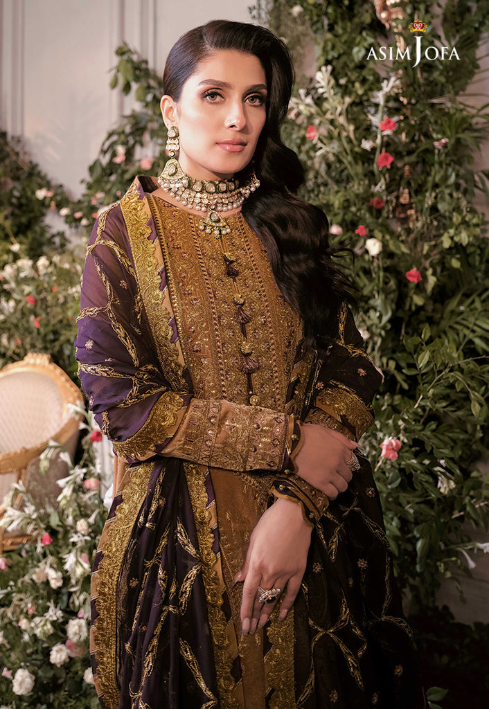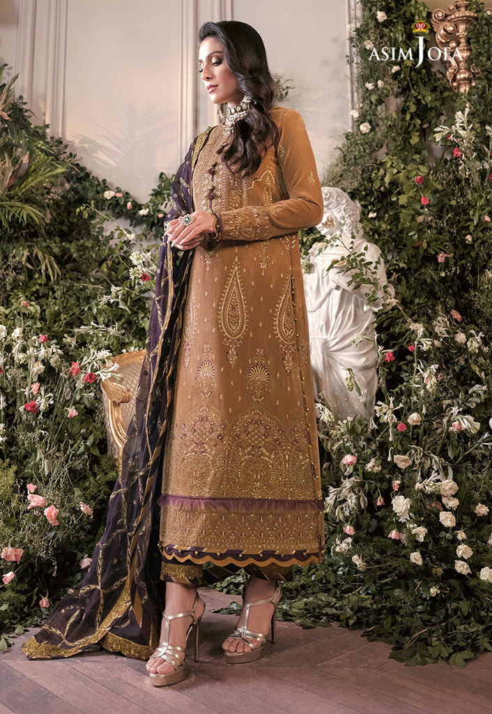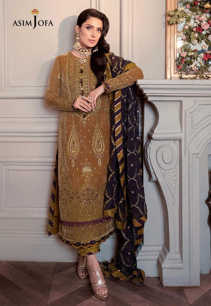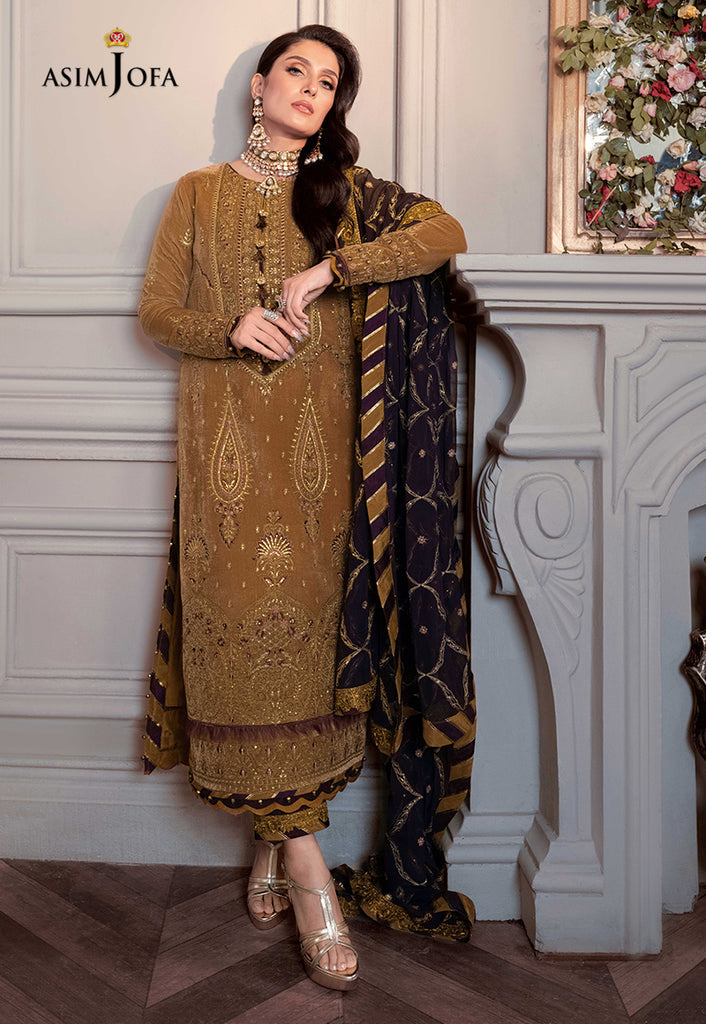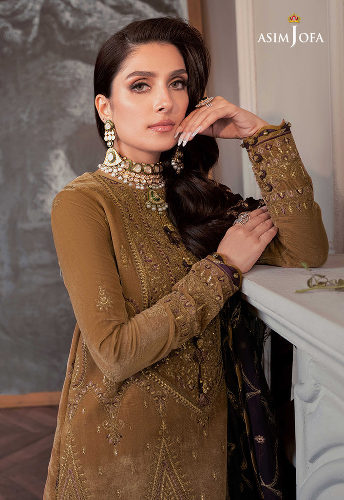 Topaz: A beautiful burnished gold hue of this unique velvet long shirt creates an intriguing contrast with deep raisin threadwork uplifted by tinted gold zari and cupped sequins crafted into this attractive piece. The deep hued chiffon dupatta embroidered in heavy seamless pattern looks picture perfect for any winter festive affair. It comes with solid dyed silk pants.