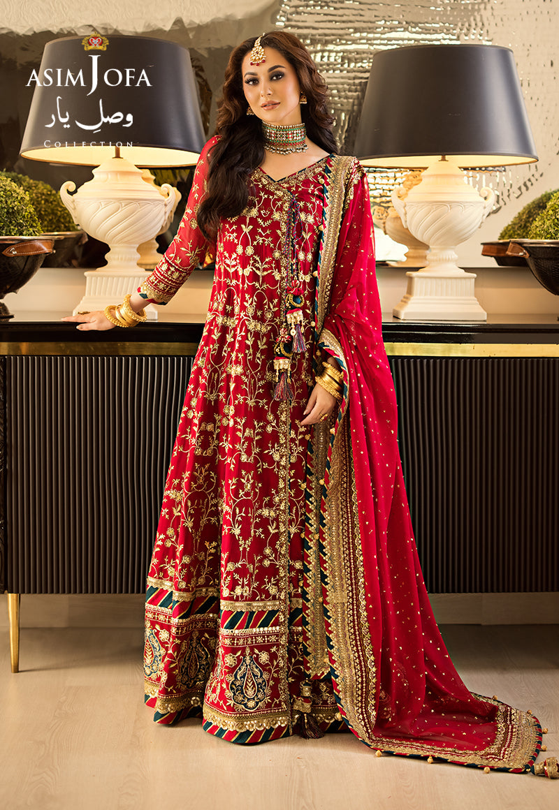 Unveil the gorgeous appeal of red with our Ruby Regalia ensemble from the “VASL-E-YAAR” collection by Asim Jofa. Celebrating the essence of femininity, this outfit drapes gracefully with its soft fall. The peshwas features heavy kalis, intricately embroidered in a flowing vines style, giving it an elegant and sophisticated appeal. A touch of teal color adds a distinctive flair that captures attention. The intricately embroidered bodice brings luxury to your appearance, radiating classic elegance and charm. The rhythmic sequins adorning the dupatta add a final touch of allure.