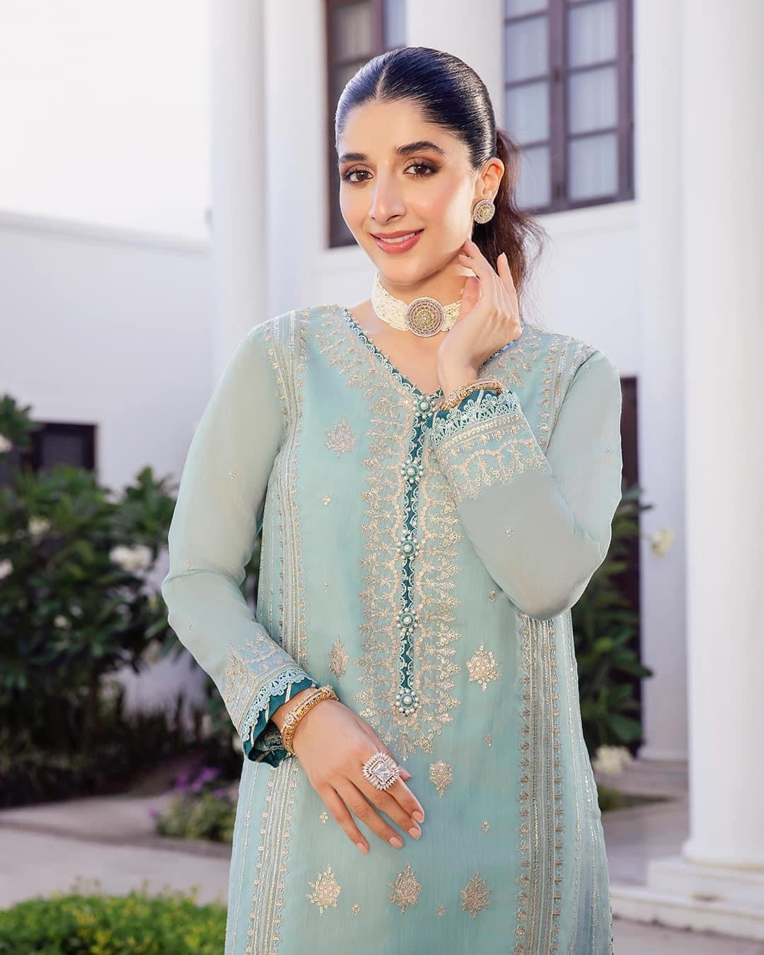 Step into a world of heavenly beauty as Mawra Hocane graces the scene, draped in the luminous 'ZARI SITARA' ensemble, evoking a sense of ethereal wonder. True beauty lies in the weaving of threads! Vibrant and spirited, this mint green shirt will be your instant wardrobe favorite. Endowed with sequins work and white thread embroidery, this is a classy piece crafted from the finest chanderi cotton. Grab this subtle attire and be in sync with your festive vibes.