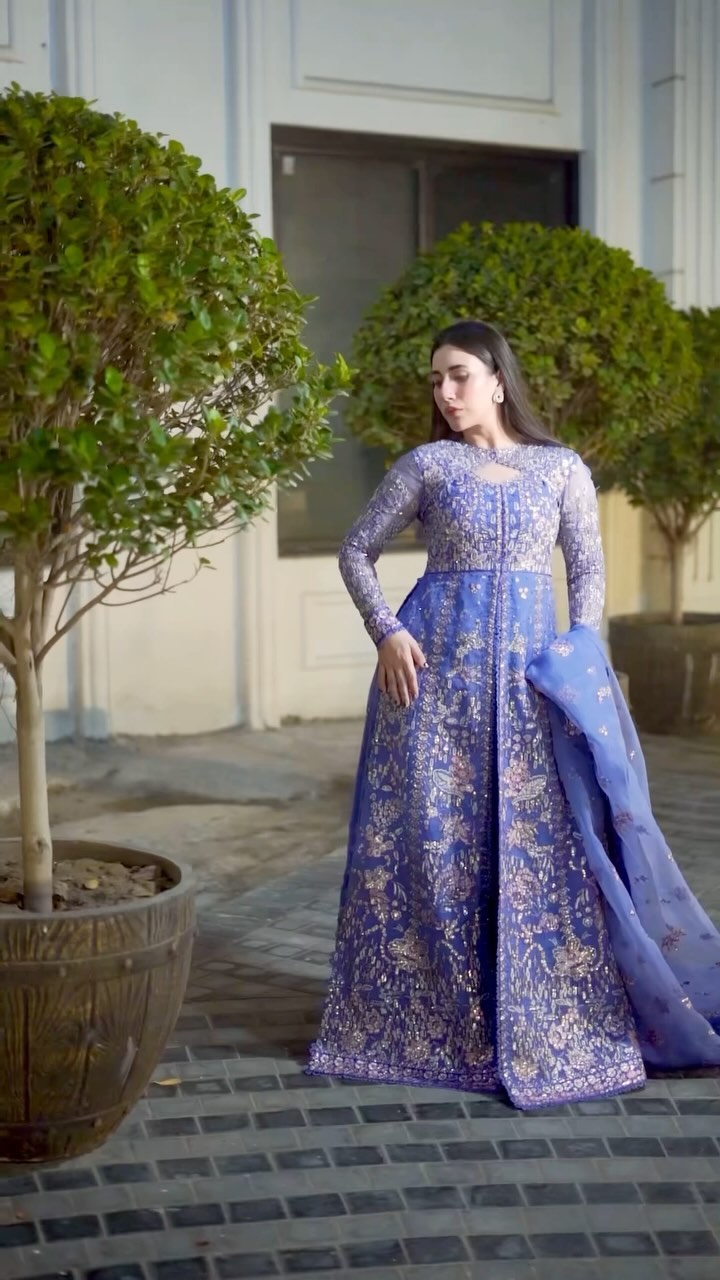 This stunning ink-blue organza shirt showcases a bodice adorned with vibrant floral embroidery, seamlessly blending elegance with contemporary design. The shirt features modern embroidered panels that add a fresh twist to the classic silhouette. It is beautifully paired with raw silk pants and an organza dupatta, which is highlighted by modern floral border details. This ensemble truly embodies sophistication and style, making it a perfect choice for any occasion.