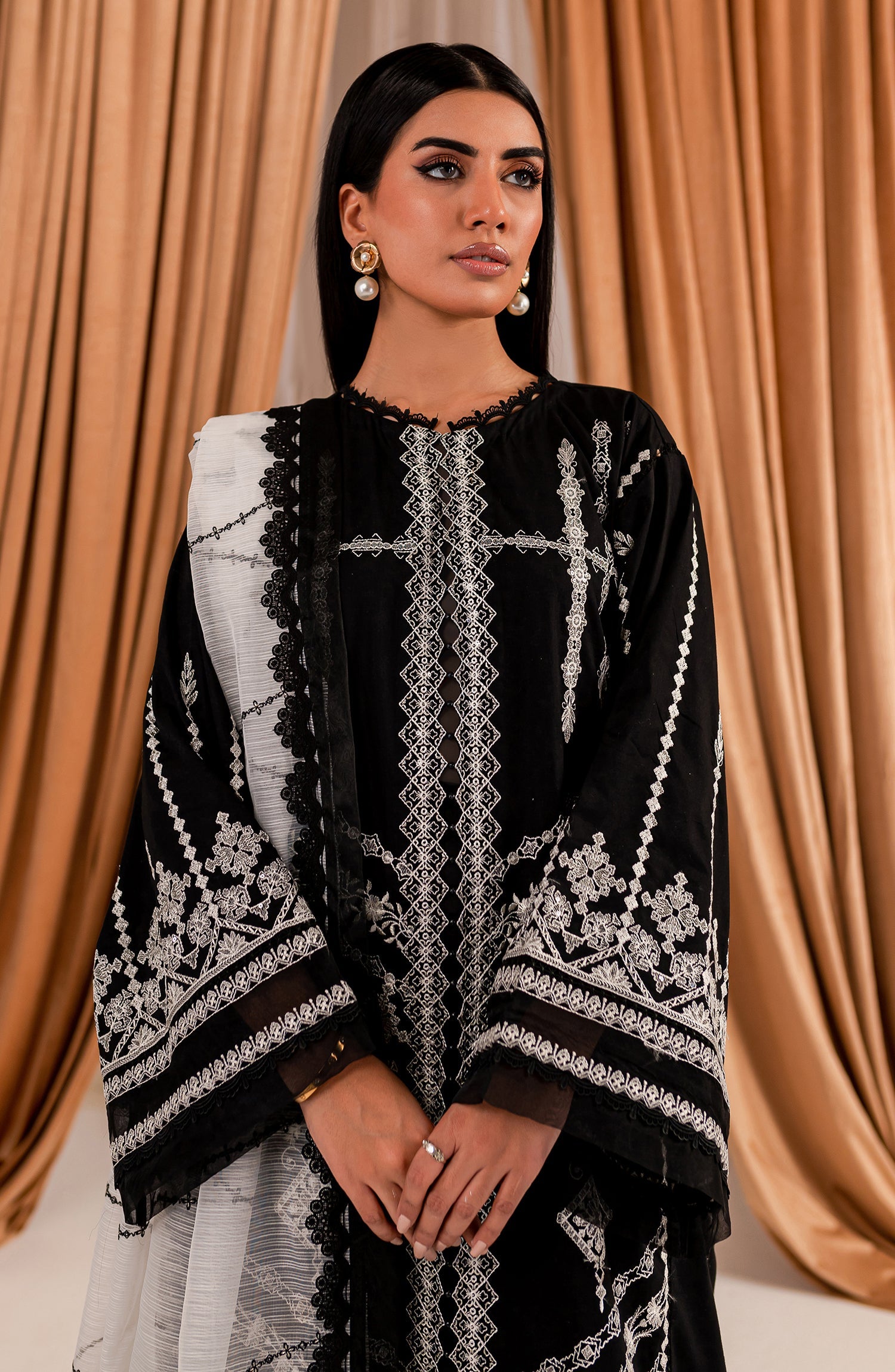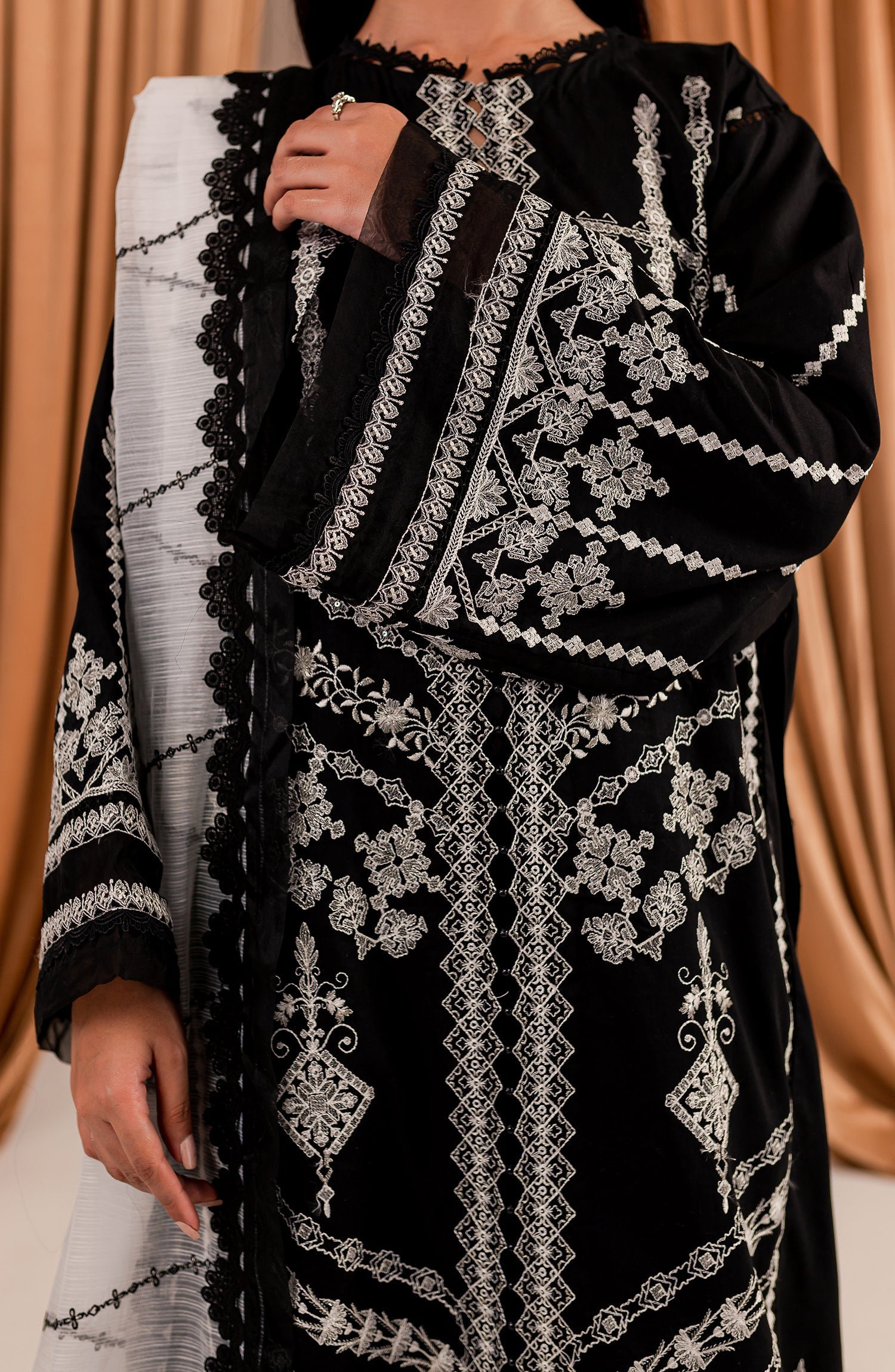 Stitched articles come with trousers tailored to match the unstitched trouser fabric provided. Please note that any appearance of shararas/ghararas in product images is for shoot purposes only unless otherwise specified in product details.