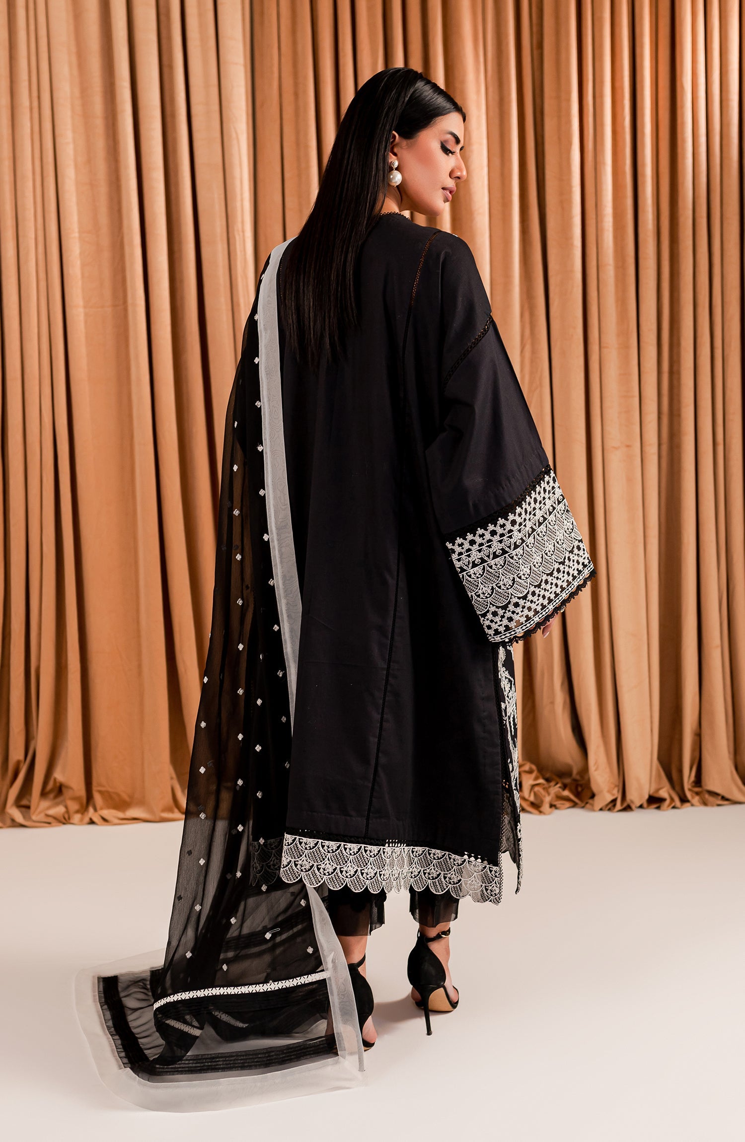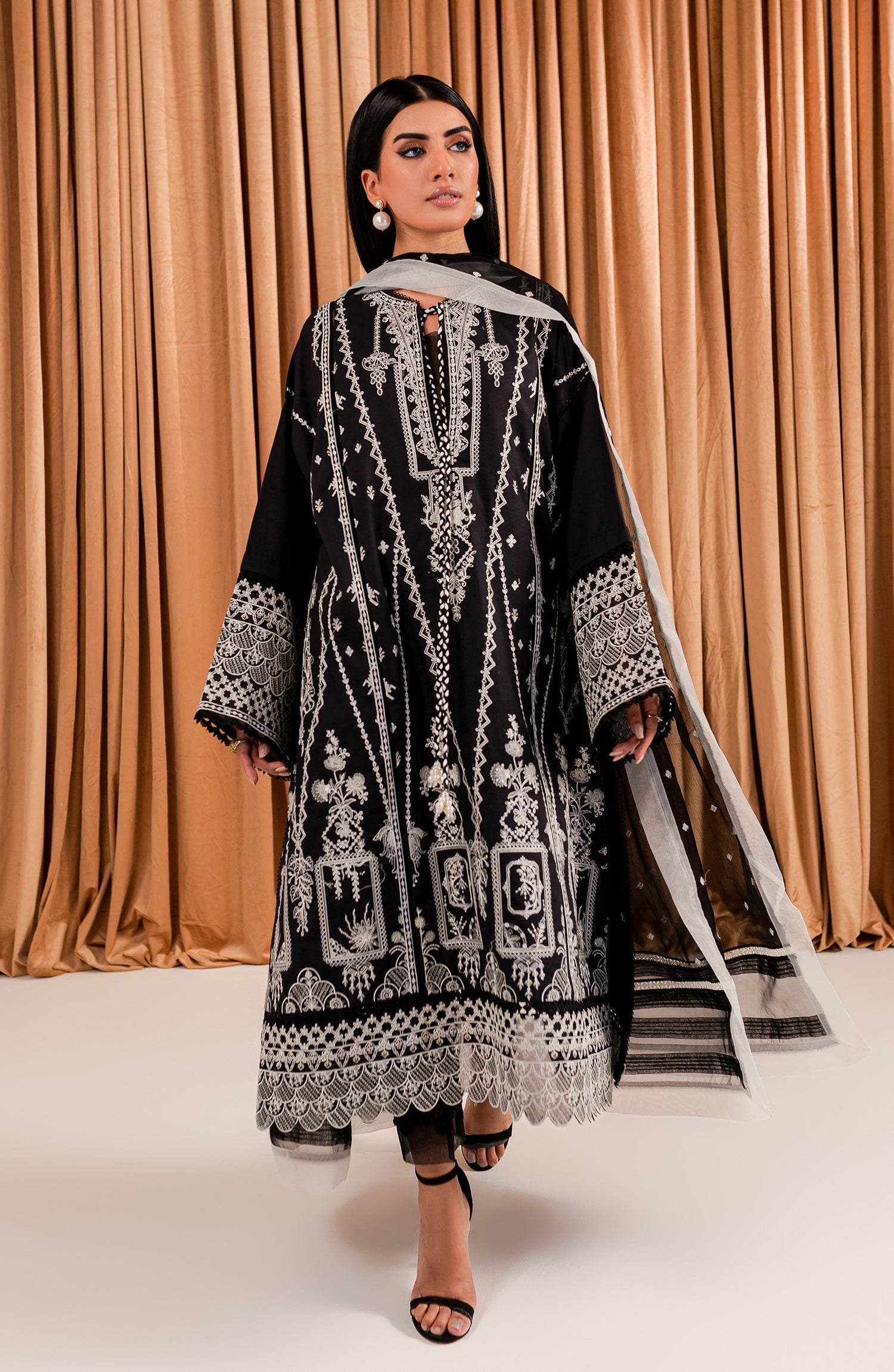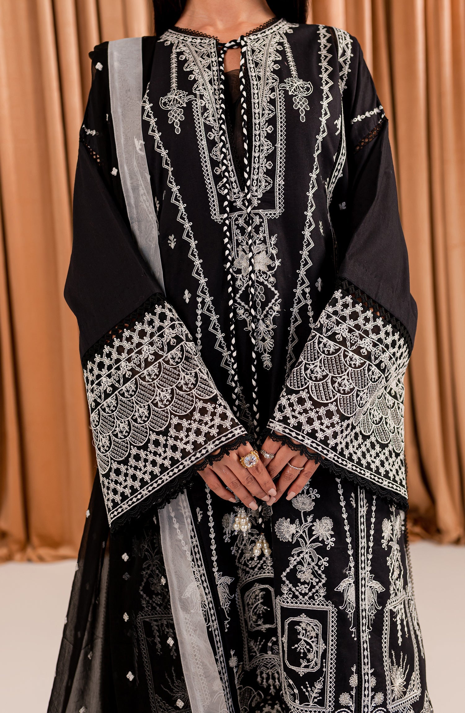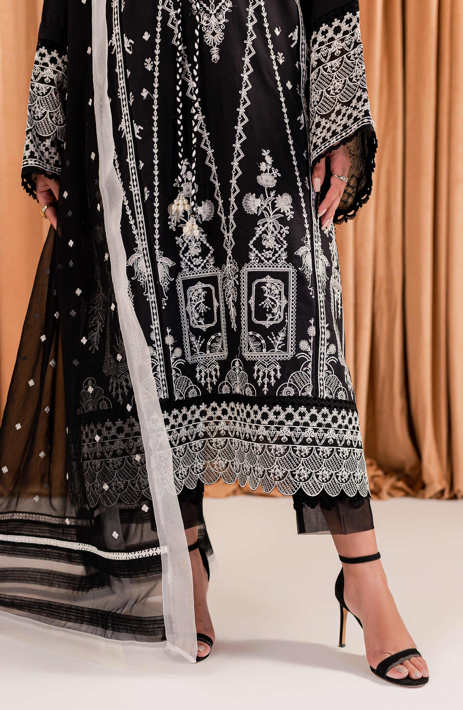 Stitched articles come with trousers tailored to match the unstitched trouser fabric provided. Please note that any appearance of shararas/ghararas in product images is for shoot purposes only unless otherwise specified in product details.
