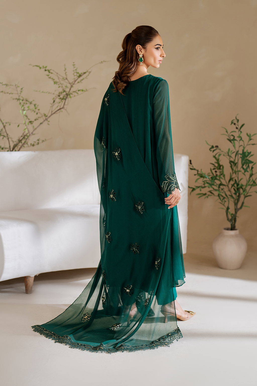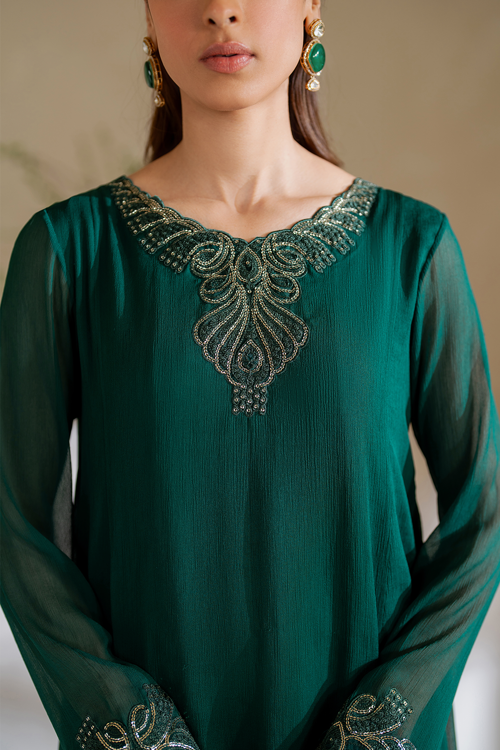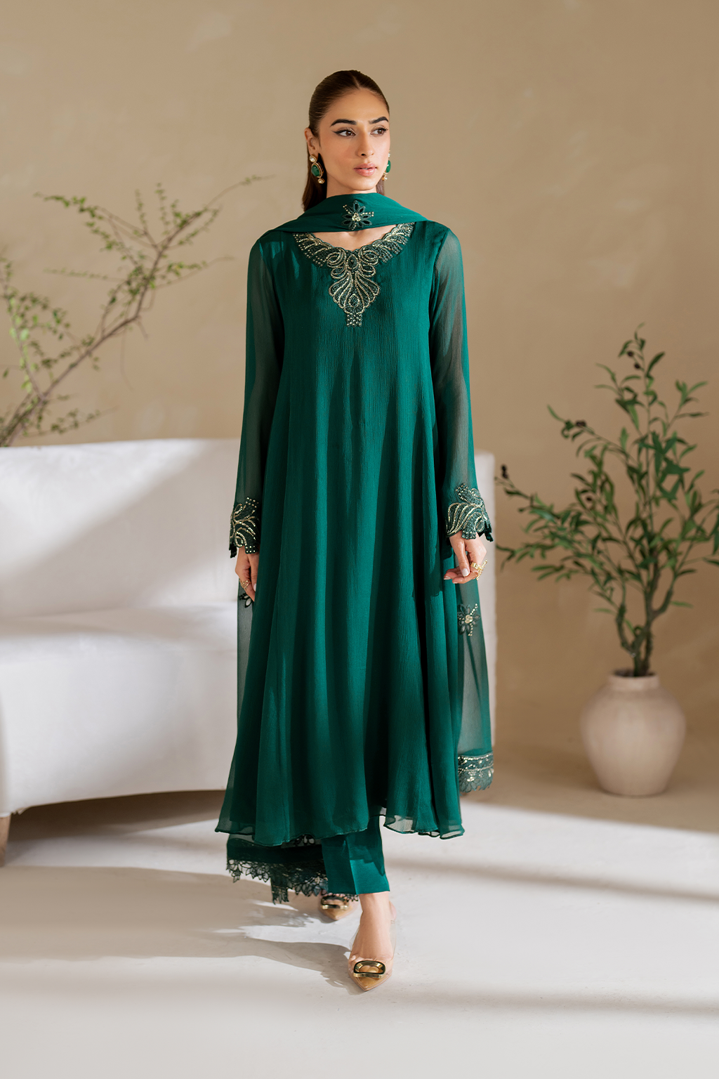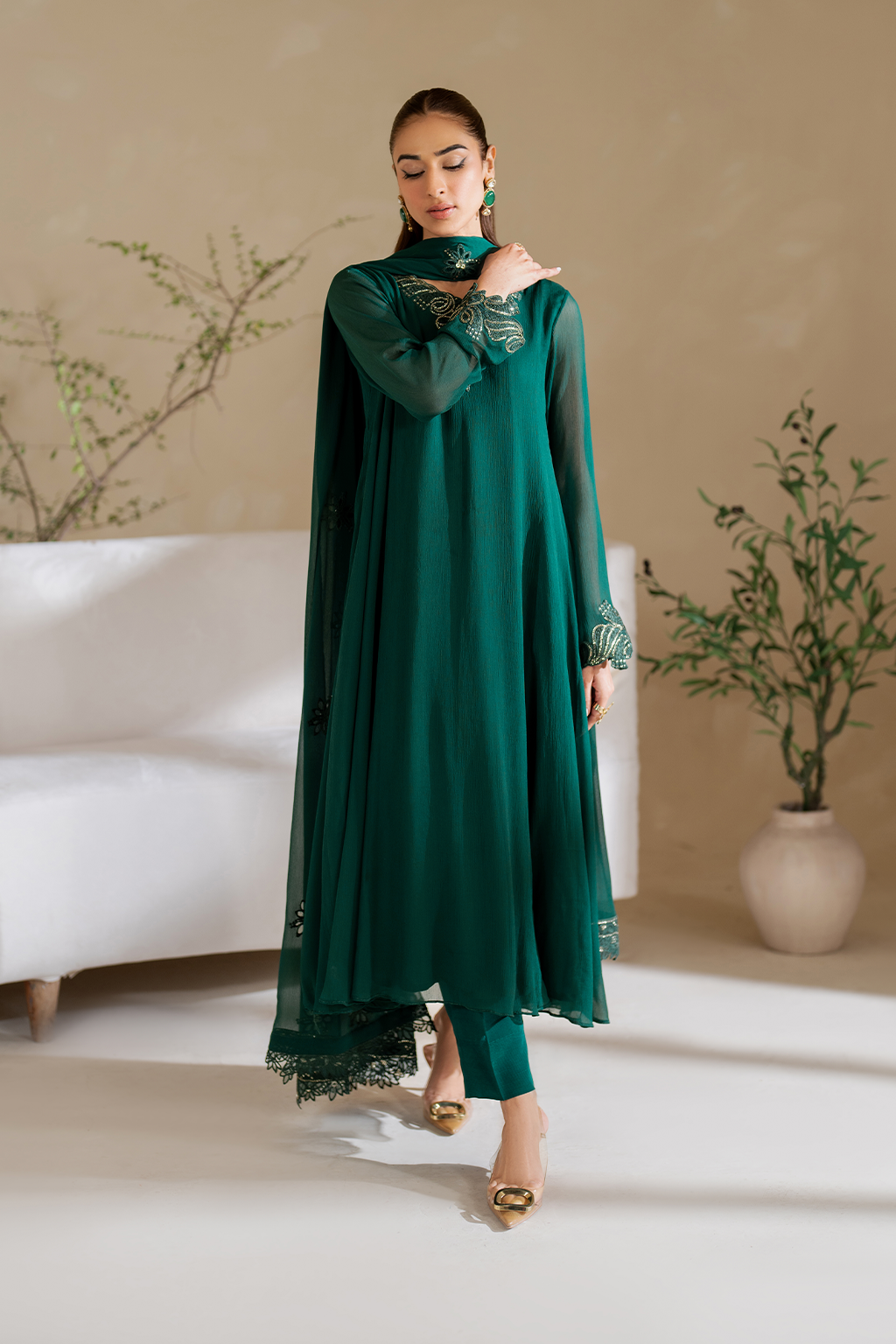 Stitched articles come with trousers tailored to match the unstitched trouser fabric provided. Please note that any appearance of shararas/ghararas in product images is for shoot purposes only unless otherwise specified in product details.