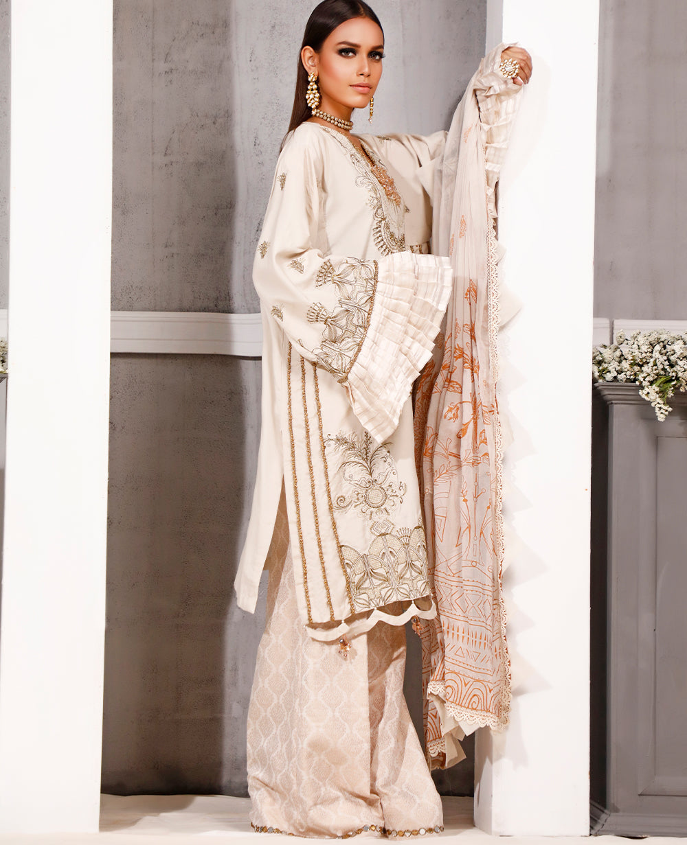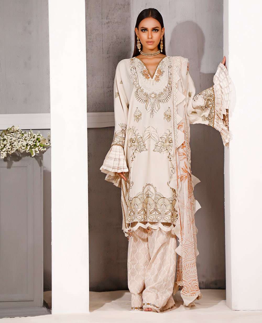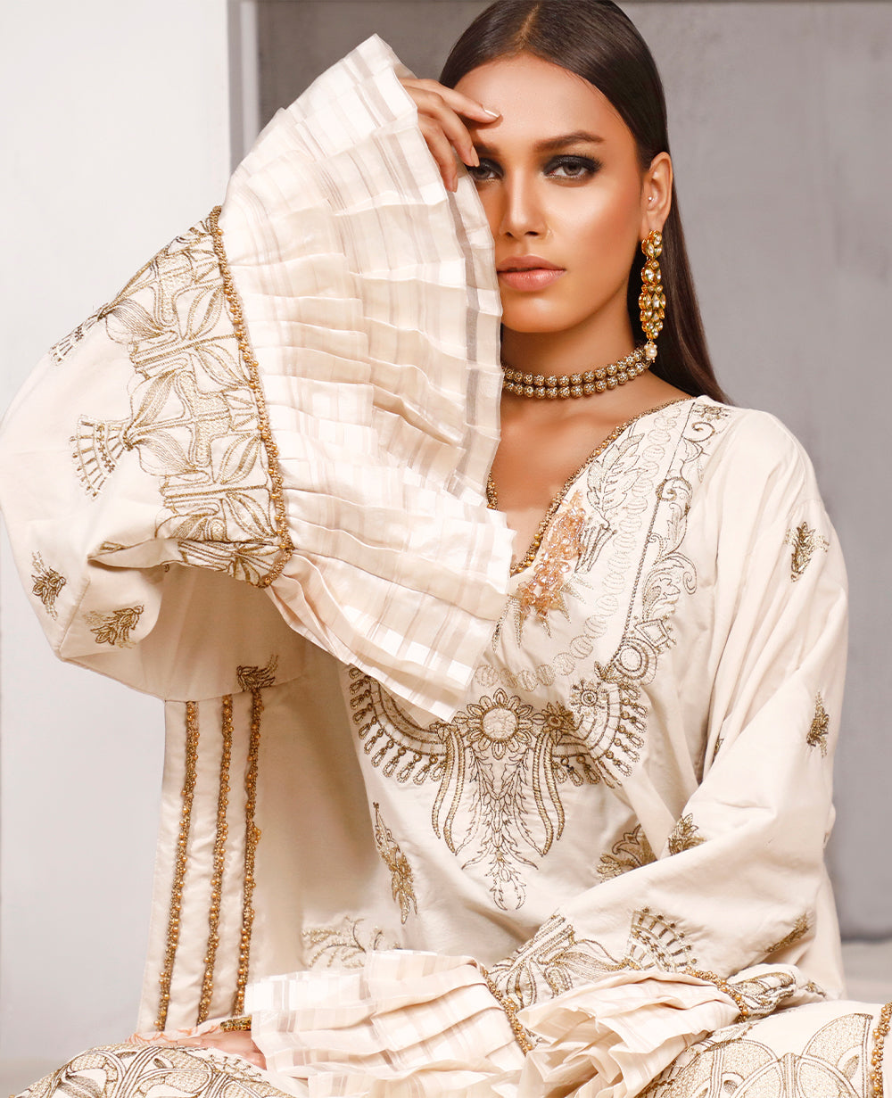 Stitched articles come with trousers tailored to match the unstitched trouser fabric provided. Please note that any appearance of shararas/ghararas in product images is for shoot purposes only unless otherwise specified in product details.