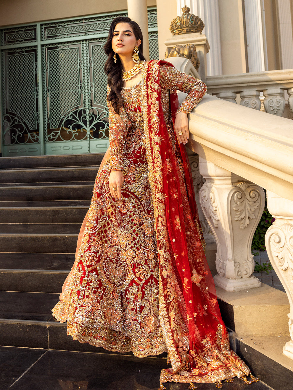 Preserve an everlasting charm in this exceptionally spectacular dress featuring delicate stonework, fine detailing, and a palette of classic hues. The net gown is fully embellished with GOTTA ,DABKA, NAKSHI, PEARLS, PIPES, SHIMMER PANNI BATKI, SEQUINS adding richness to the traditional silhouette giving it a glamourous vibe.