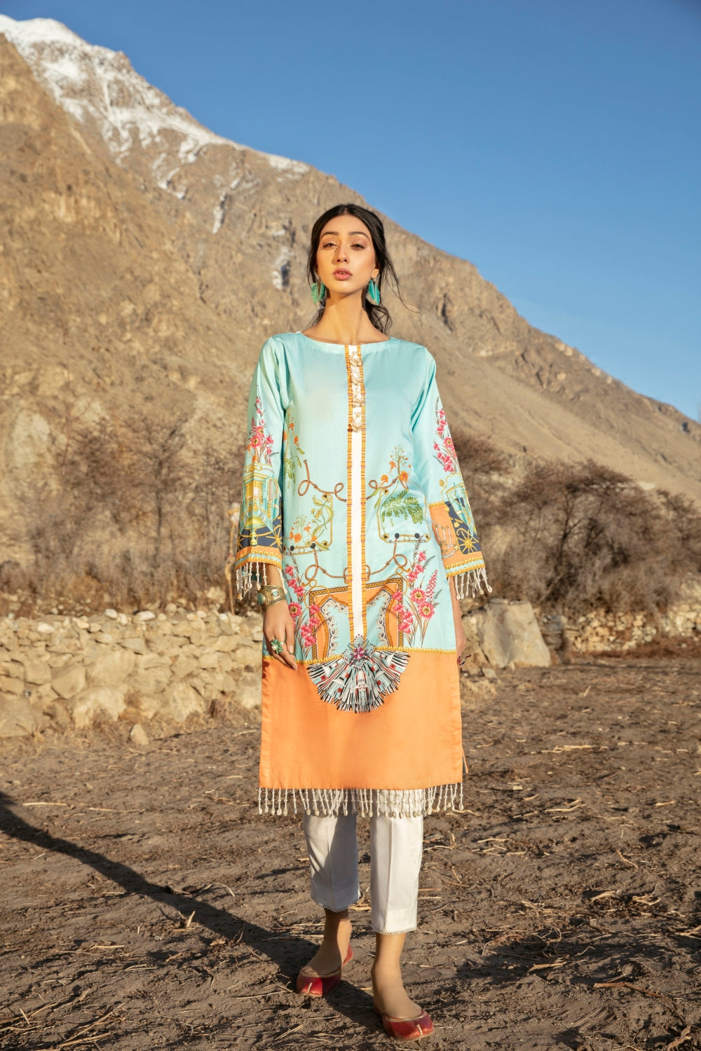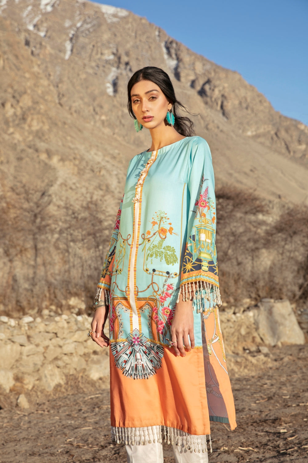 Stitched articles come with trousers tailored to match the unstitched trouser fabric provided. Please note that any appearance of shararas/ghararas in product images is for shoot purposes only unless otherwise specified in product details.