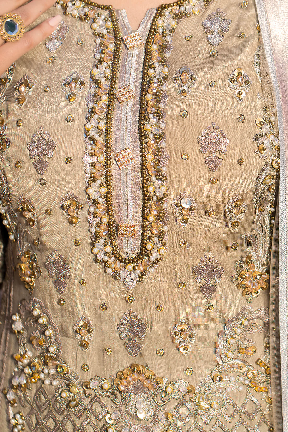 Stitched articles come with trousers tailored to match the unstitched trouser fabric provided. Please note that any appearance of shararas/ghararas in product images is for shoot purposes only unless otherwise specified in product details.