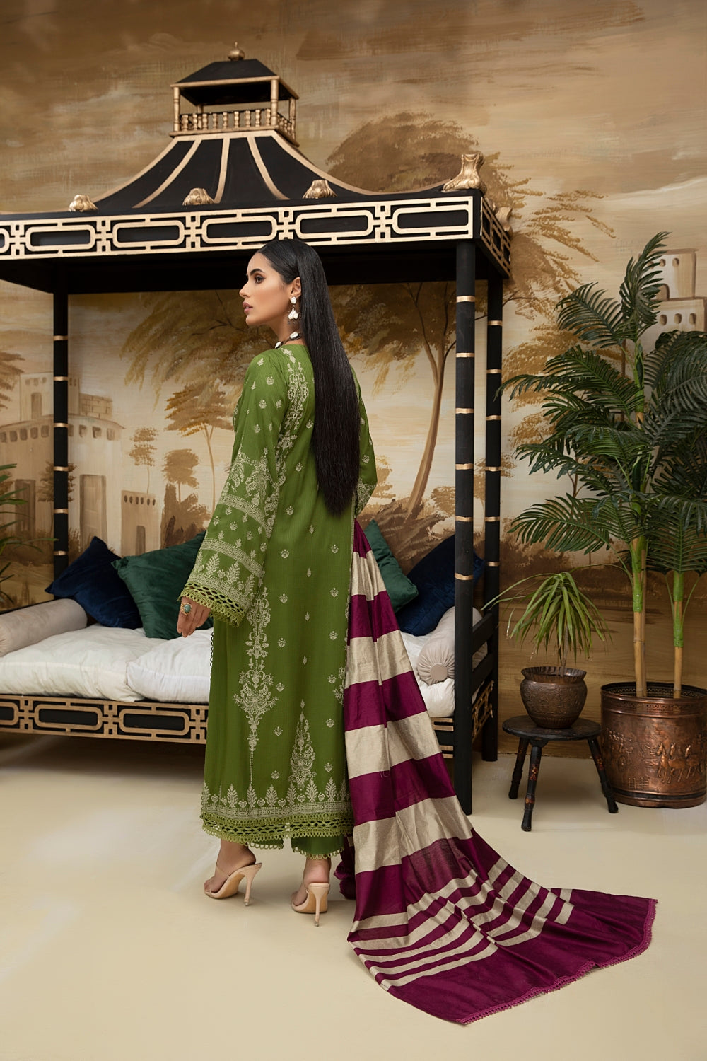 Stitched articles come with trousers tailored to match the unstitched trouser fabric provided. Please note that any appearance of shararas/ghararas in product images is for shoot purposes only unless otherwise specified in product details.