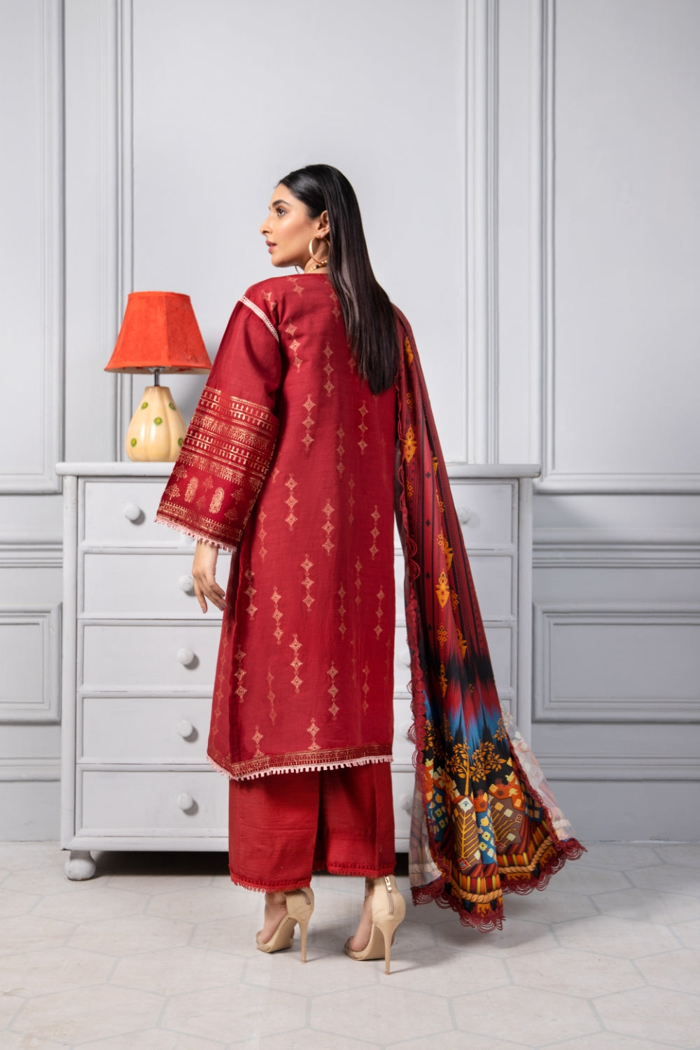 Stitched articles come with trousers tailored to match the unstitched trouser fabric provided. Please note that any appearance of shararas/ghararas in product images is for shoot purposes only unless otherwise specified in product details.