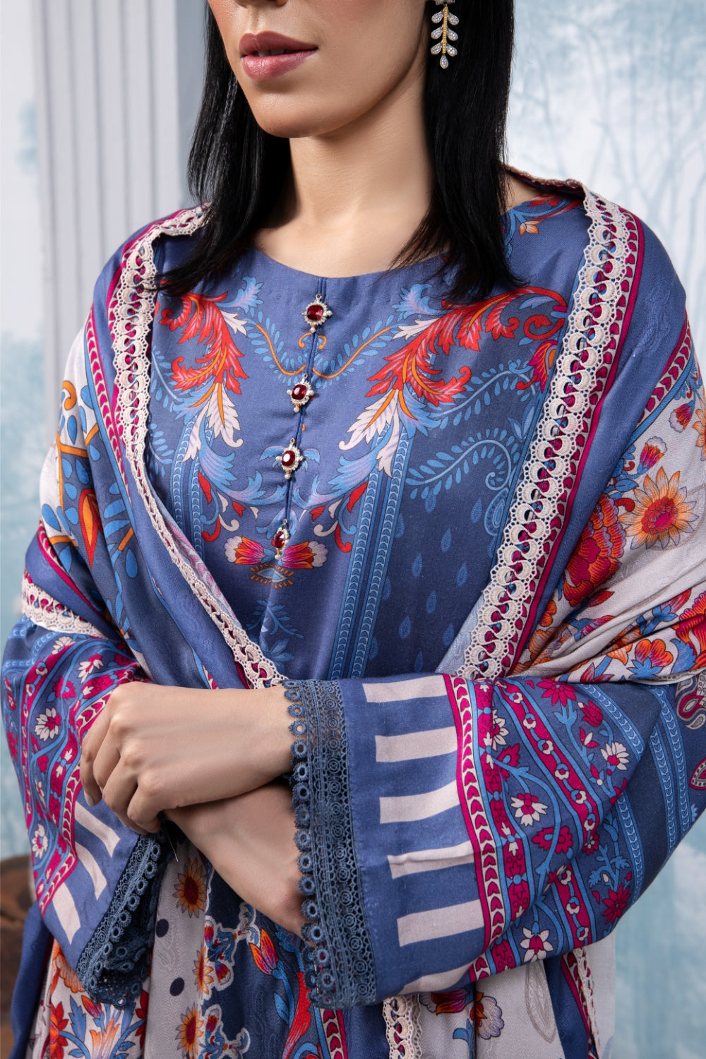 Stitched articles come with trousers tailored to match the unstitched trouser fabric provided. Please note that any appearance of shararas/ghararas in product images is for shoot purposes only unless otherwise specified in product details.