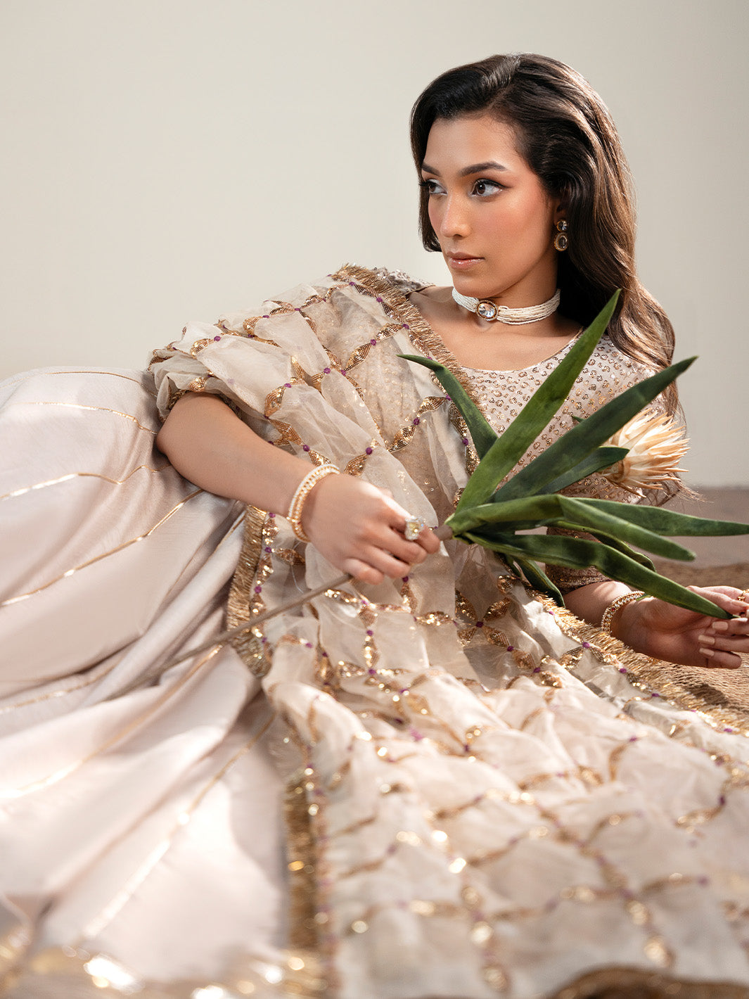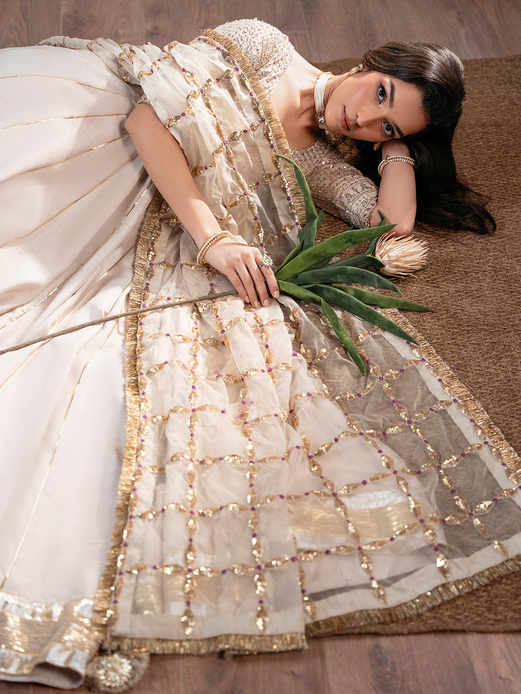 Ivory raw silk pishwas, detailed with sequin, embroidery and ornate lappa at the hem. It is paired with a silk embroidered lehnga and completed with sequin jaal dupatta with accent of pink color.