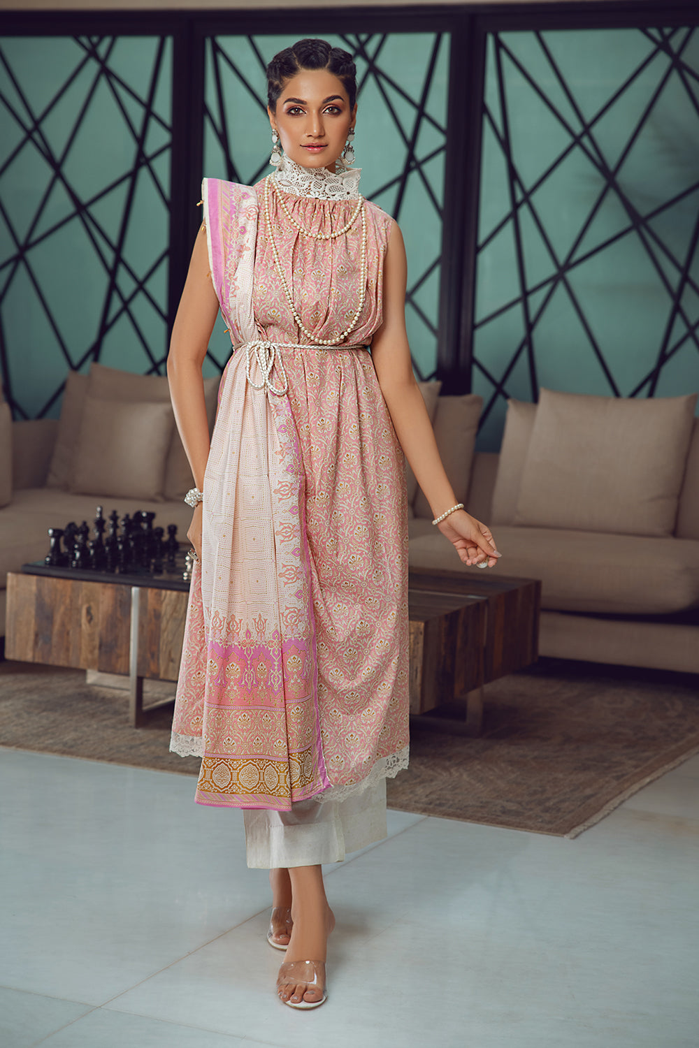 Stitched articles come with trousers tailored to match the unstitched trouser fabric provided. Please note that any appearance of shararas/ghararas in product images is for shoot purposes only unless otherwise specified in product details.