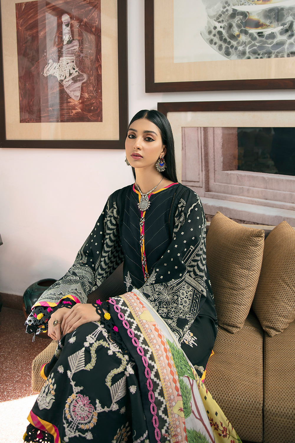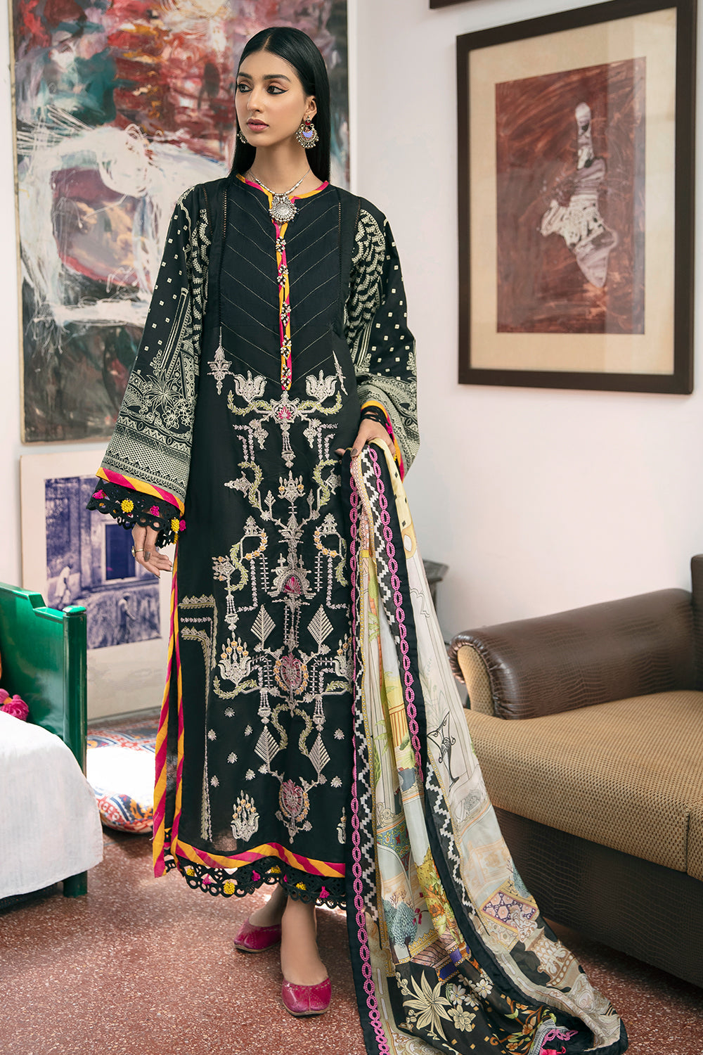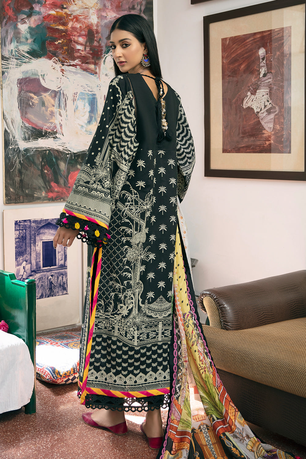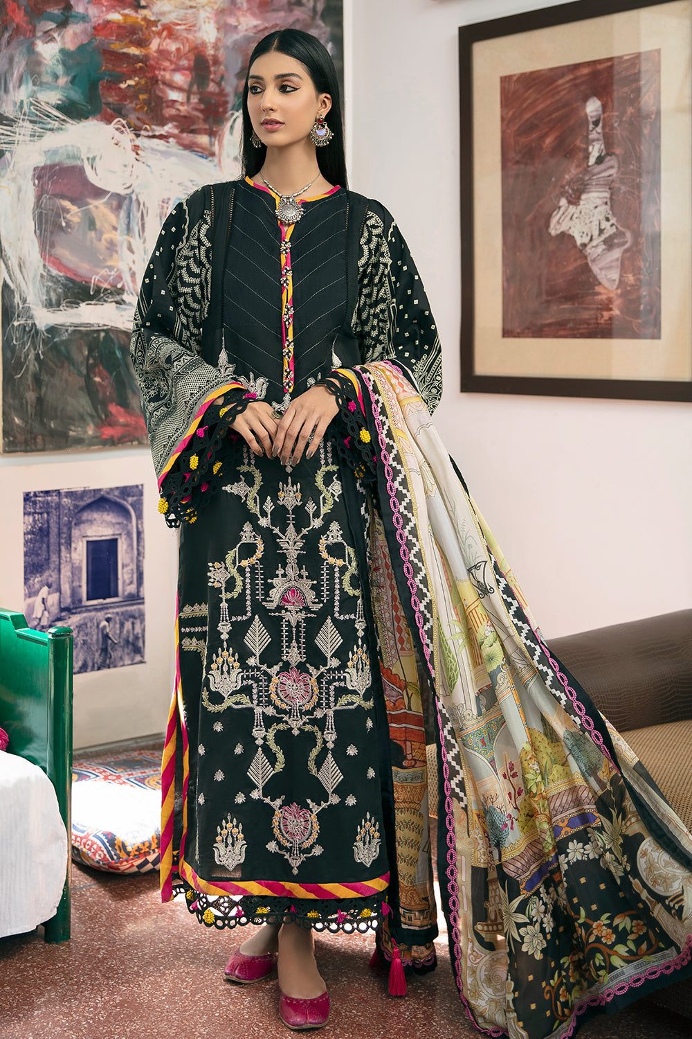 Stitched articles come with trousers tailored to match the unstitched trouser fabric provided. Please note that any appearance of shararas/ghararas in product images is for shoot purposes only unless otherwise specified in product details.