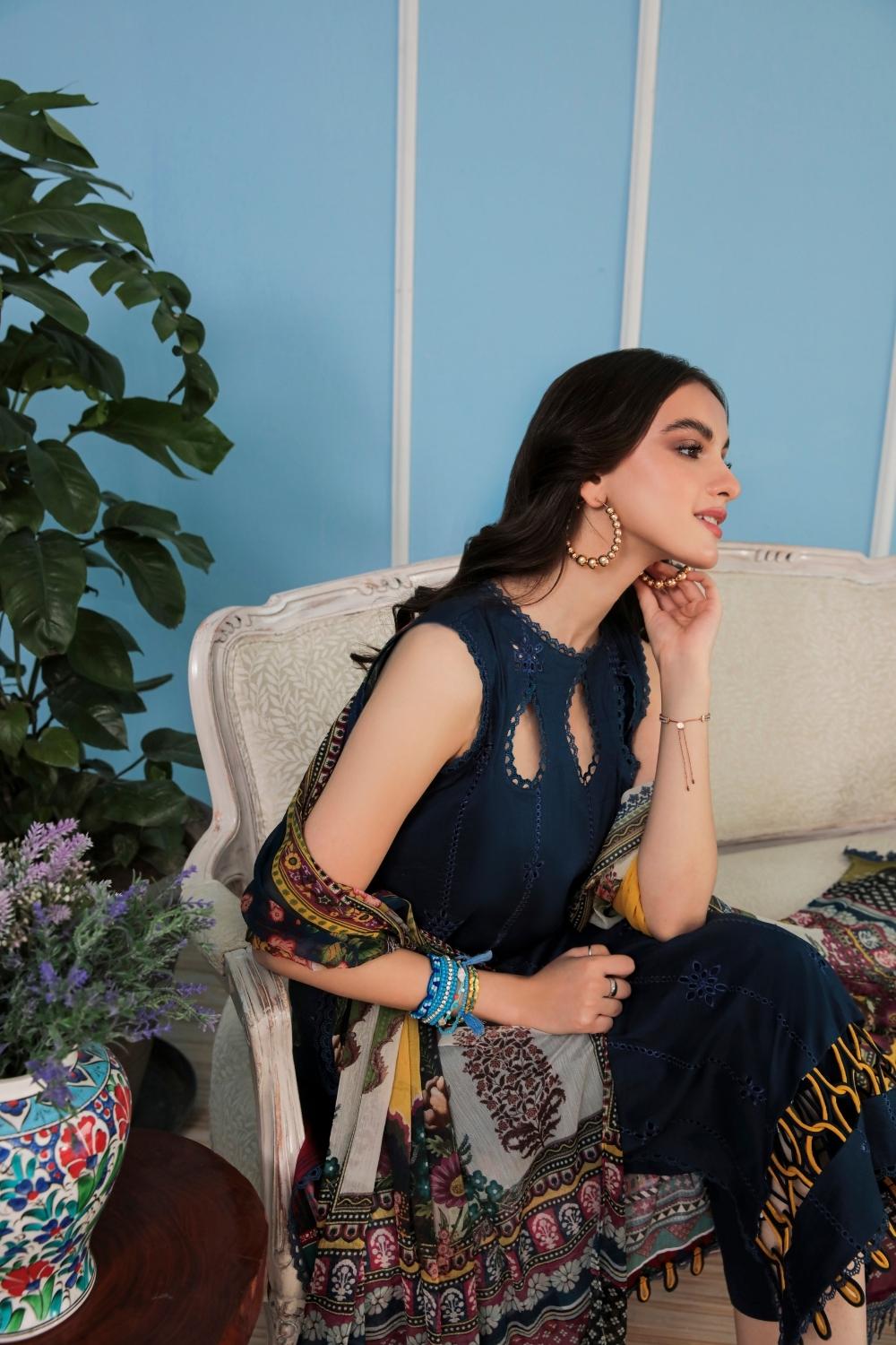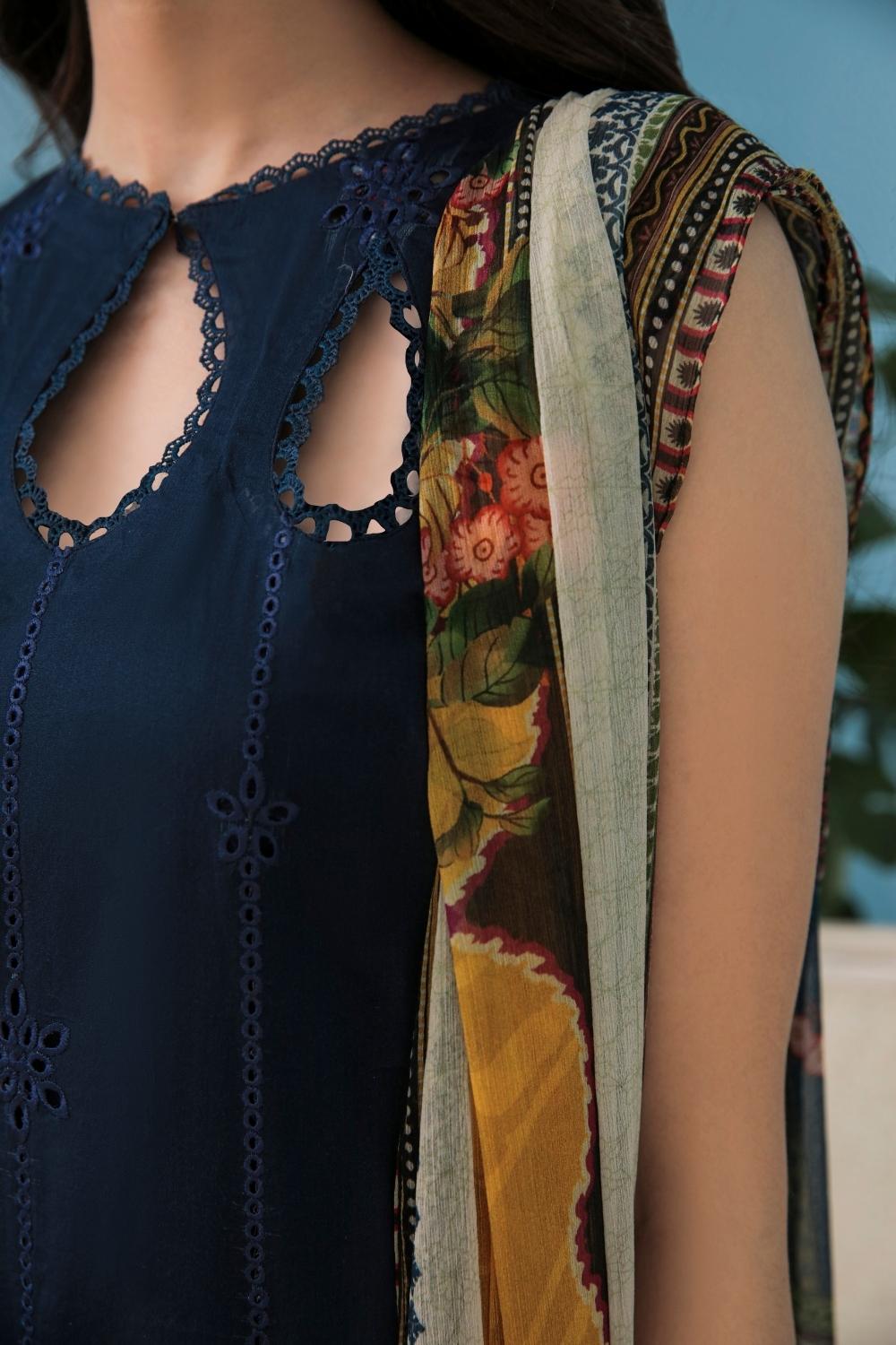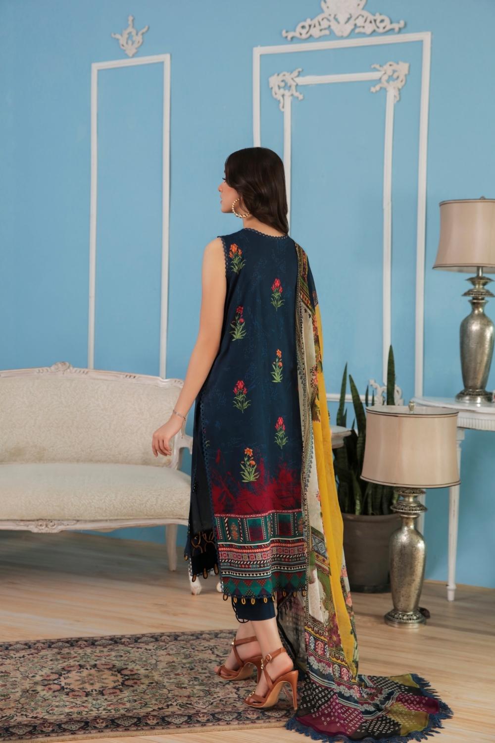 3PC Unstitched Printed+Embroidered Lawn Shirt | Printed Katonic Chiffon Dupatta | Cambric Dyed Cotton Trouser