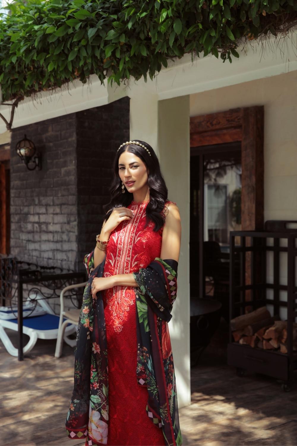 3 PC Unstitched | Schiffli Embroidered Shirt + Digital Printed Silk Dupatta + Dyed CambricTrouser