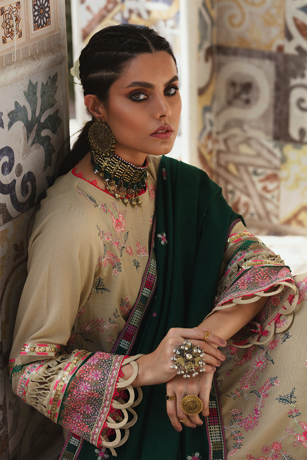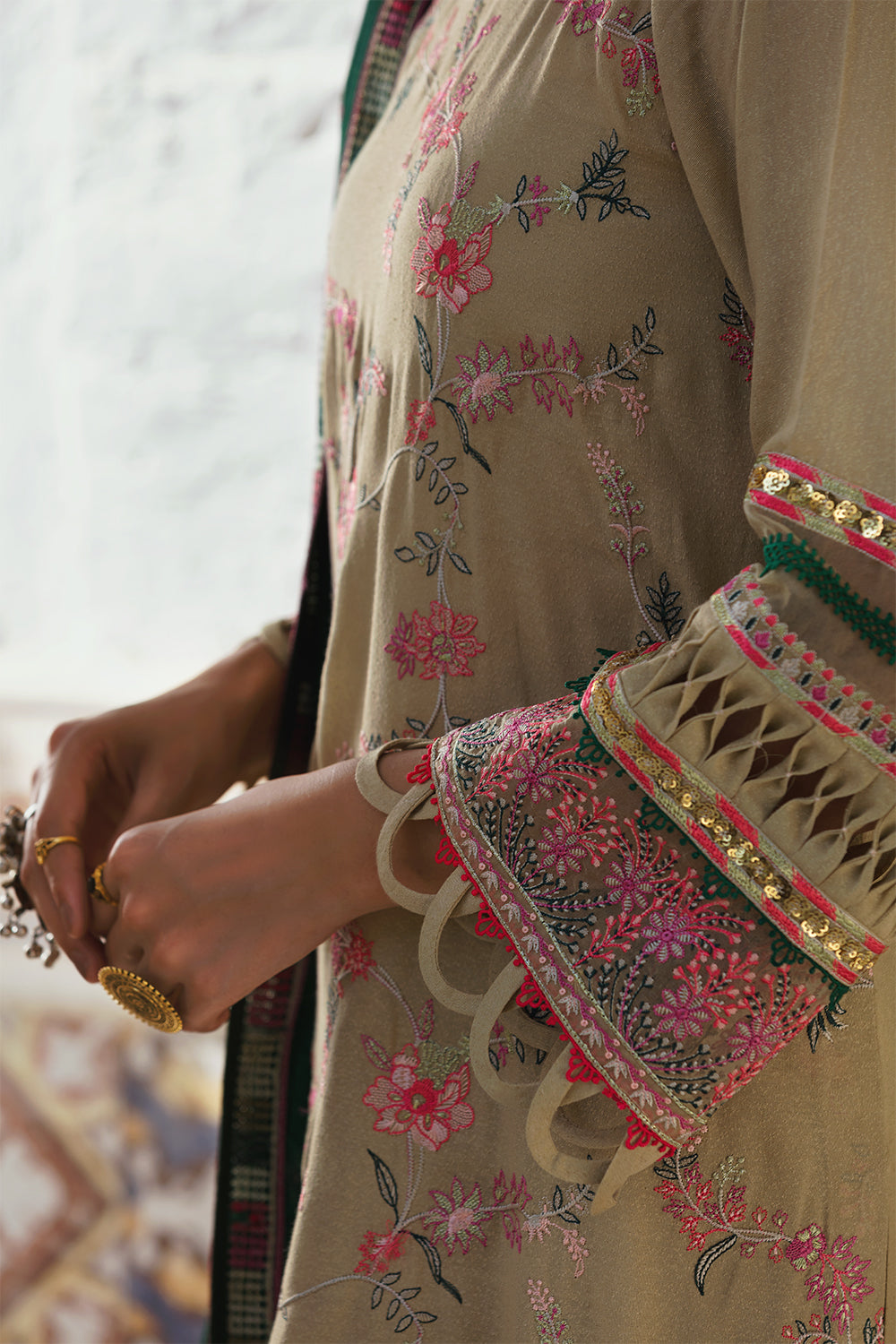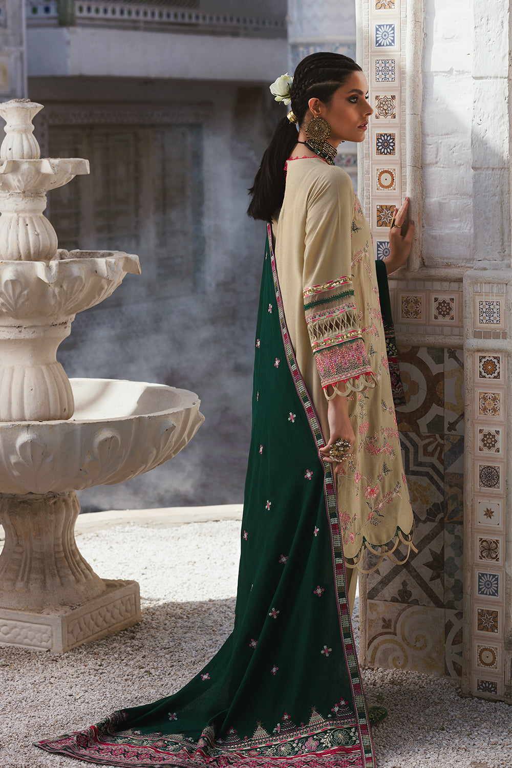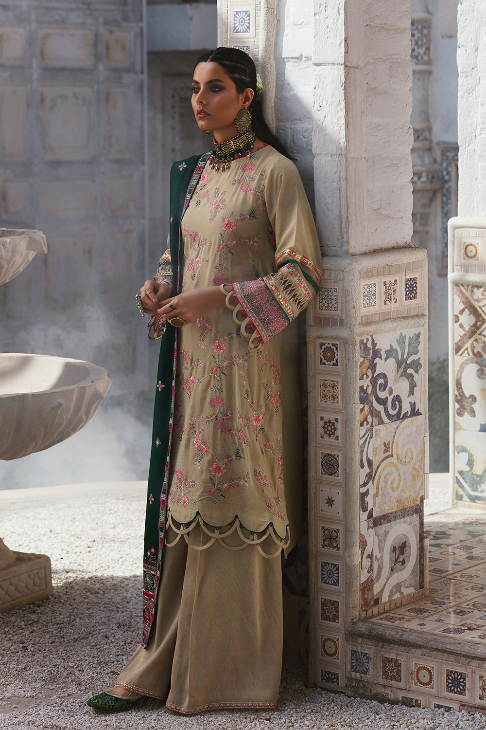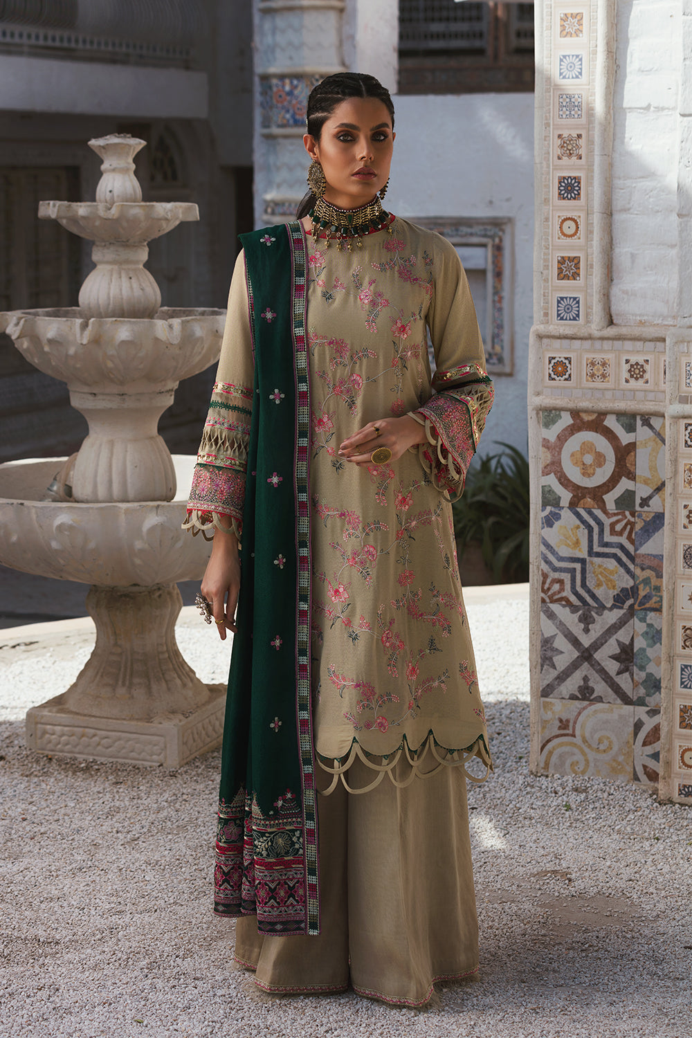 Stitched articles come with trousers tailored to match the unstitched trouser fabric provided. Please note that any appearance of shararas/ghararas in product images is for shoot purposes only unless otherwise specified in product details.