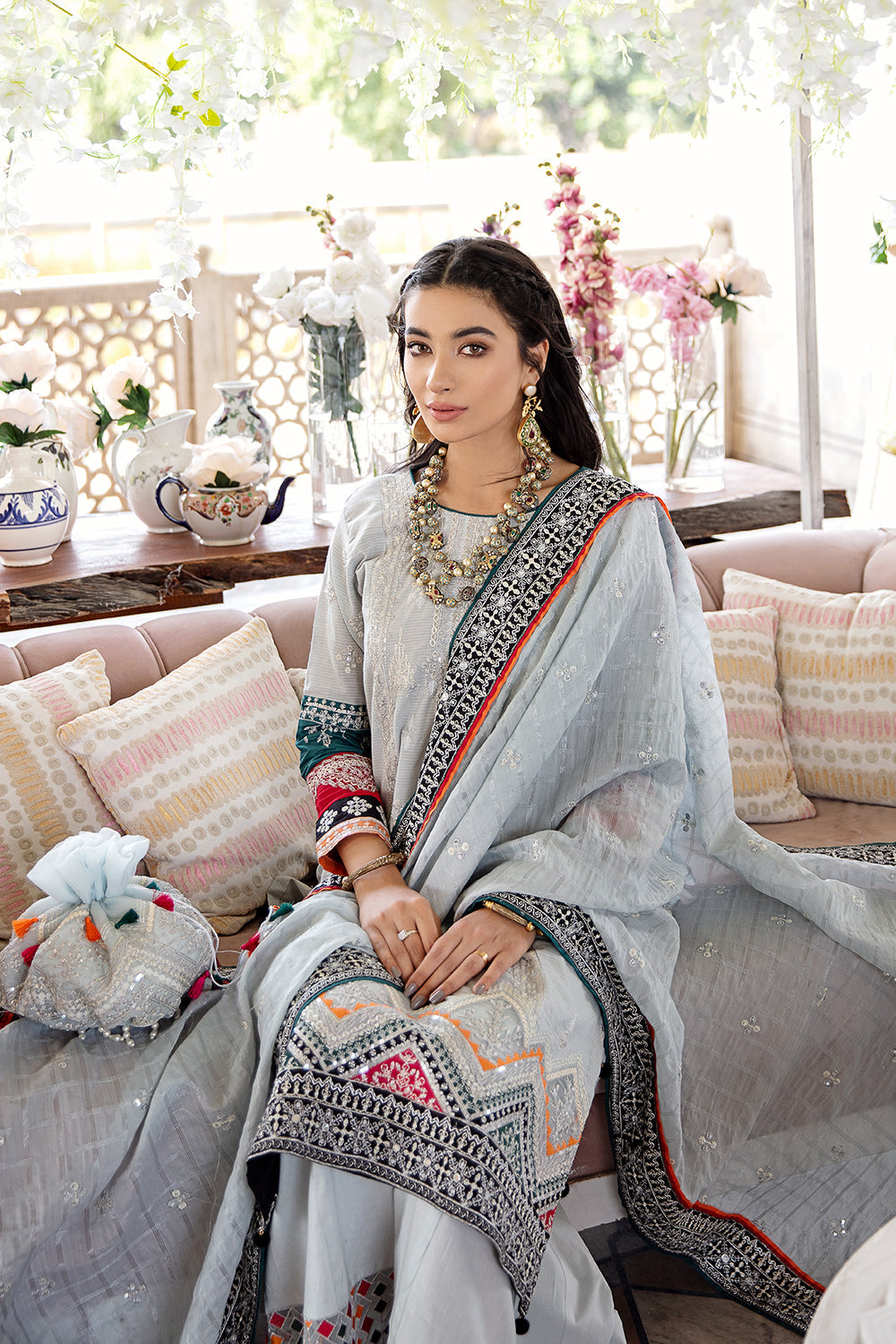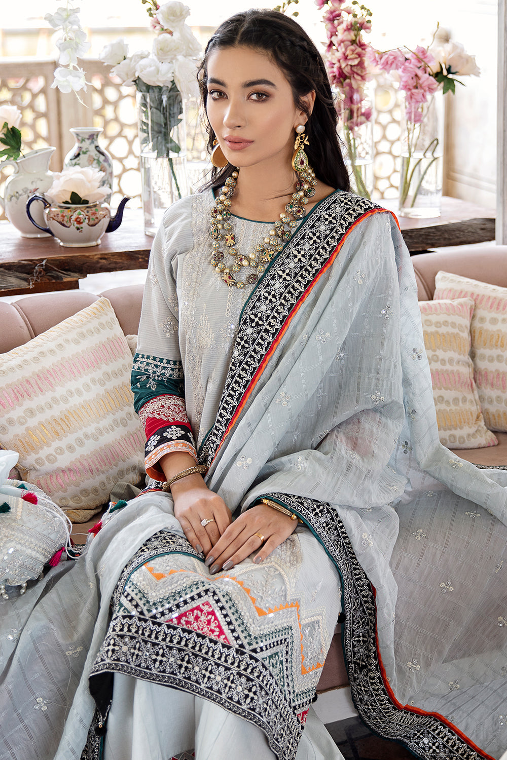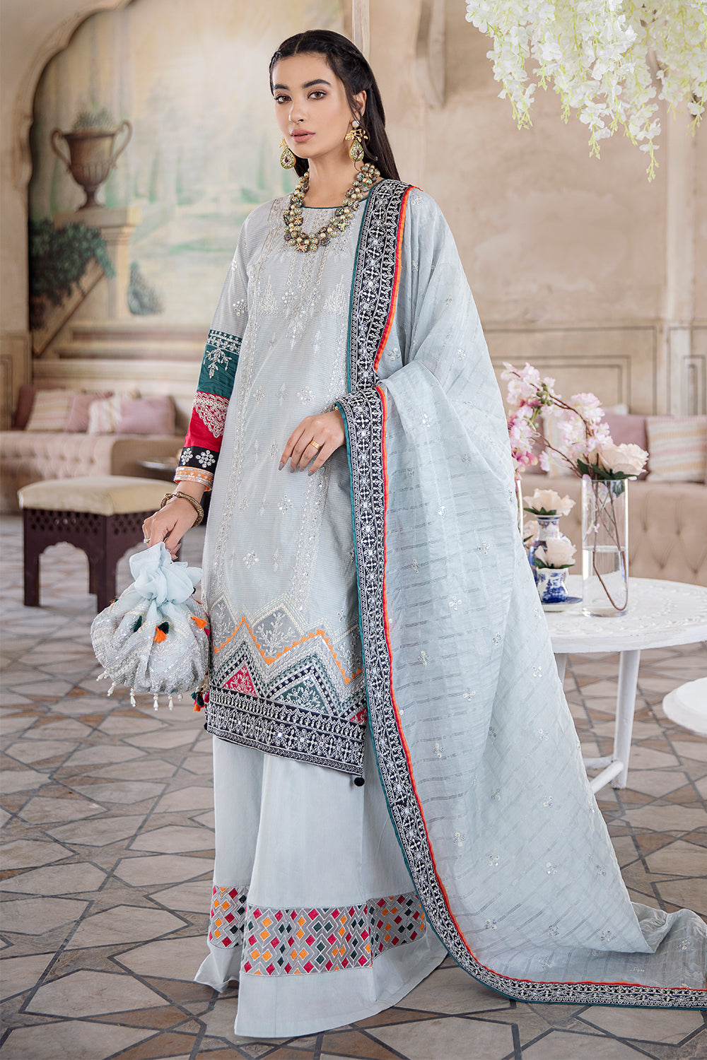 Stitched articles come with trousers tailored to match the unstitched trouser fabric provided. Please note that any appearance of shararas/ghararas in product images is for shoot purposes only unless otherwise specified in product details.