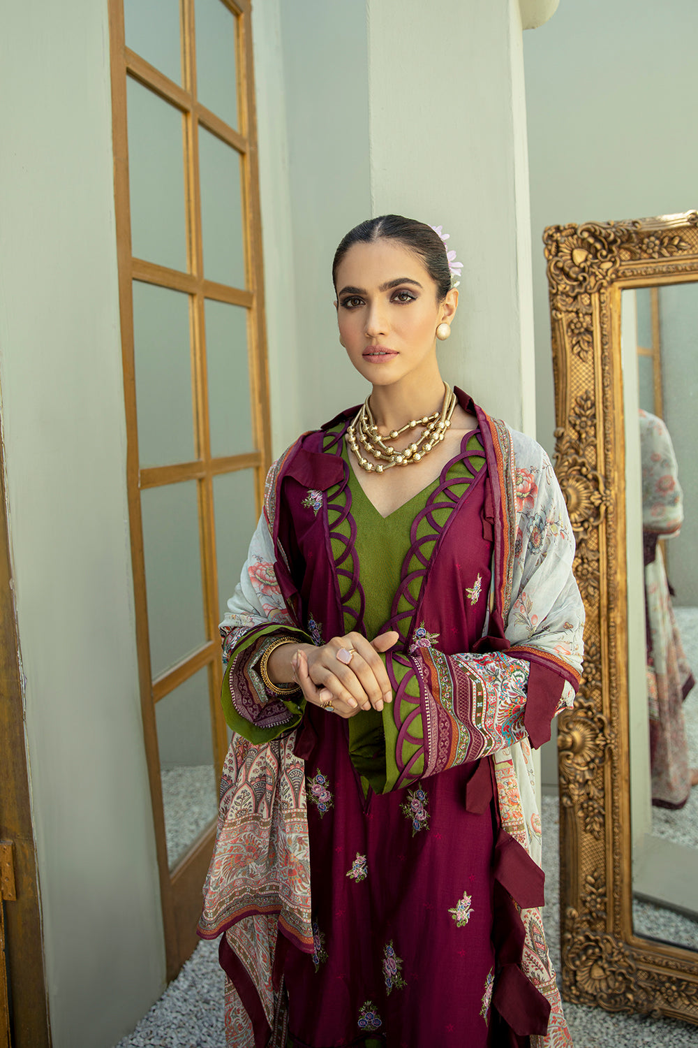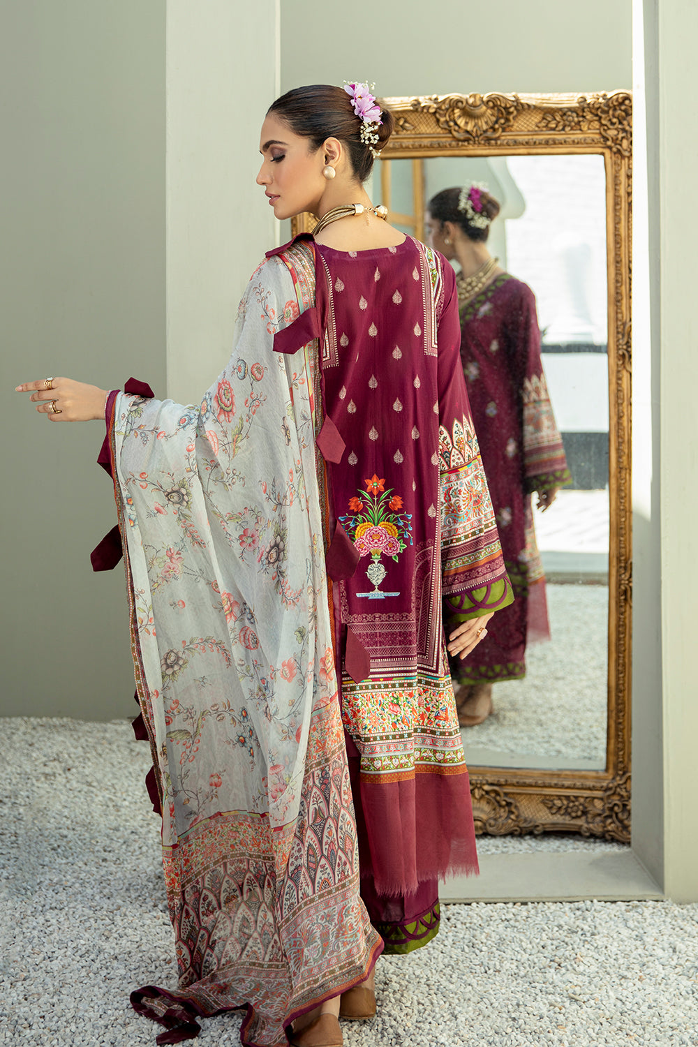Stitched articles come with trousers tailored to match the unstitched trouser fabric provided. Please note that any appearance of shararas/ghararas in product images is for shoot purposes only unless otherwise specified in product details.