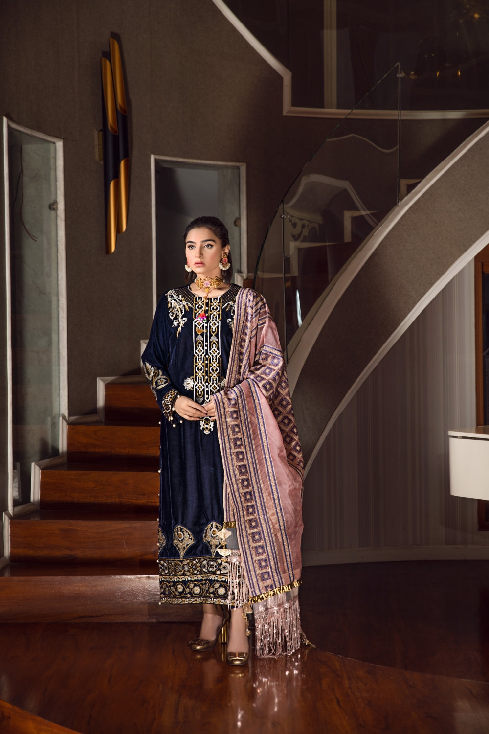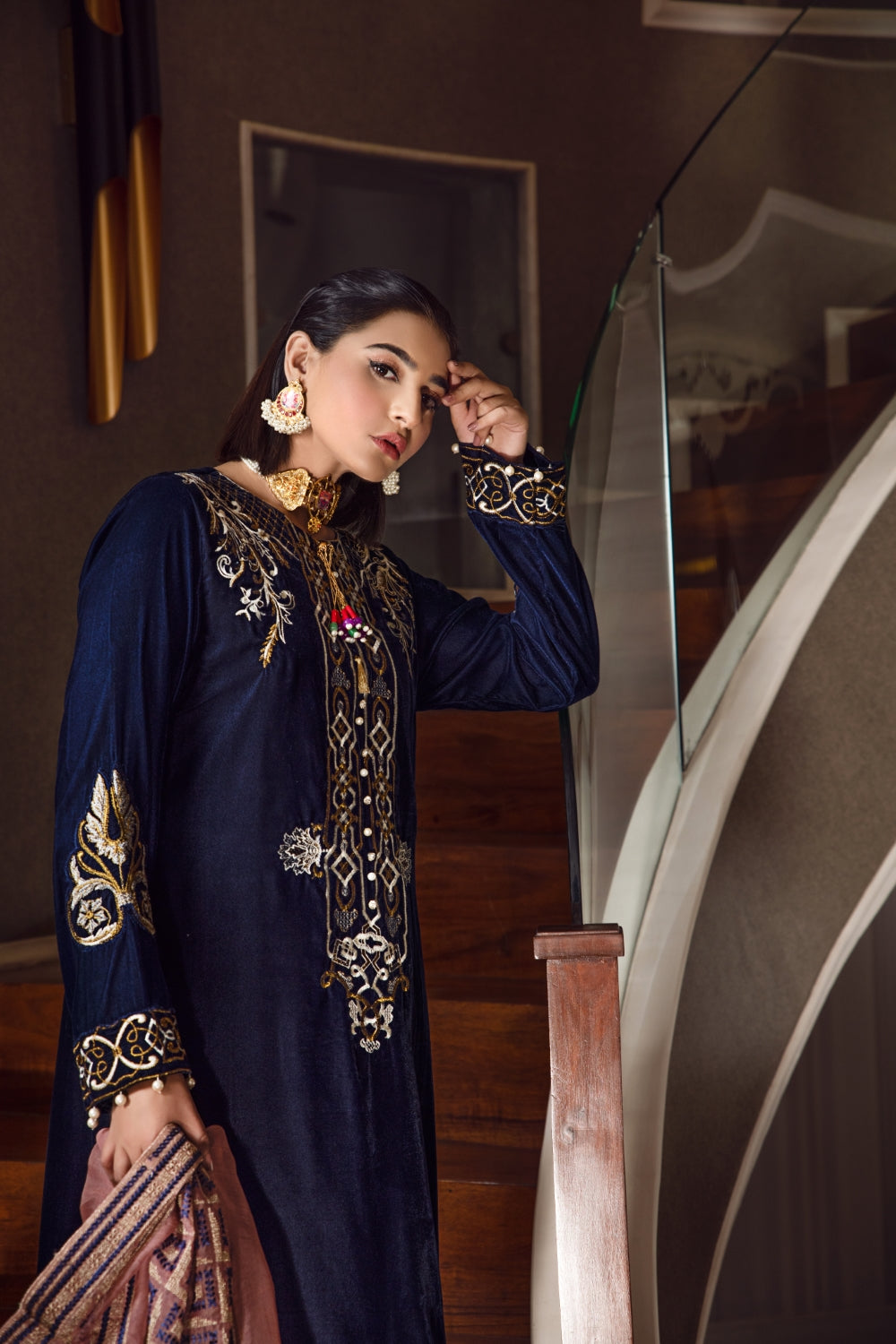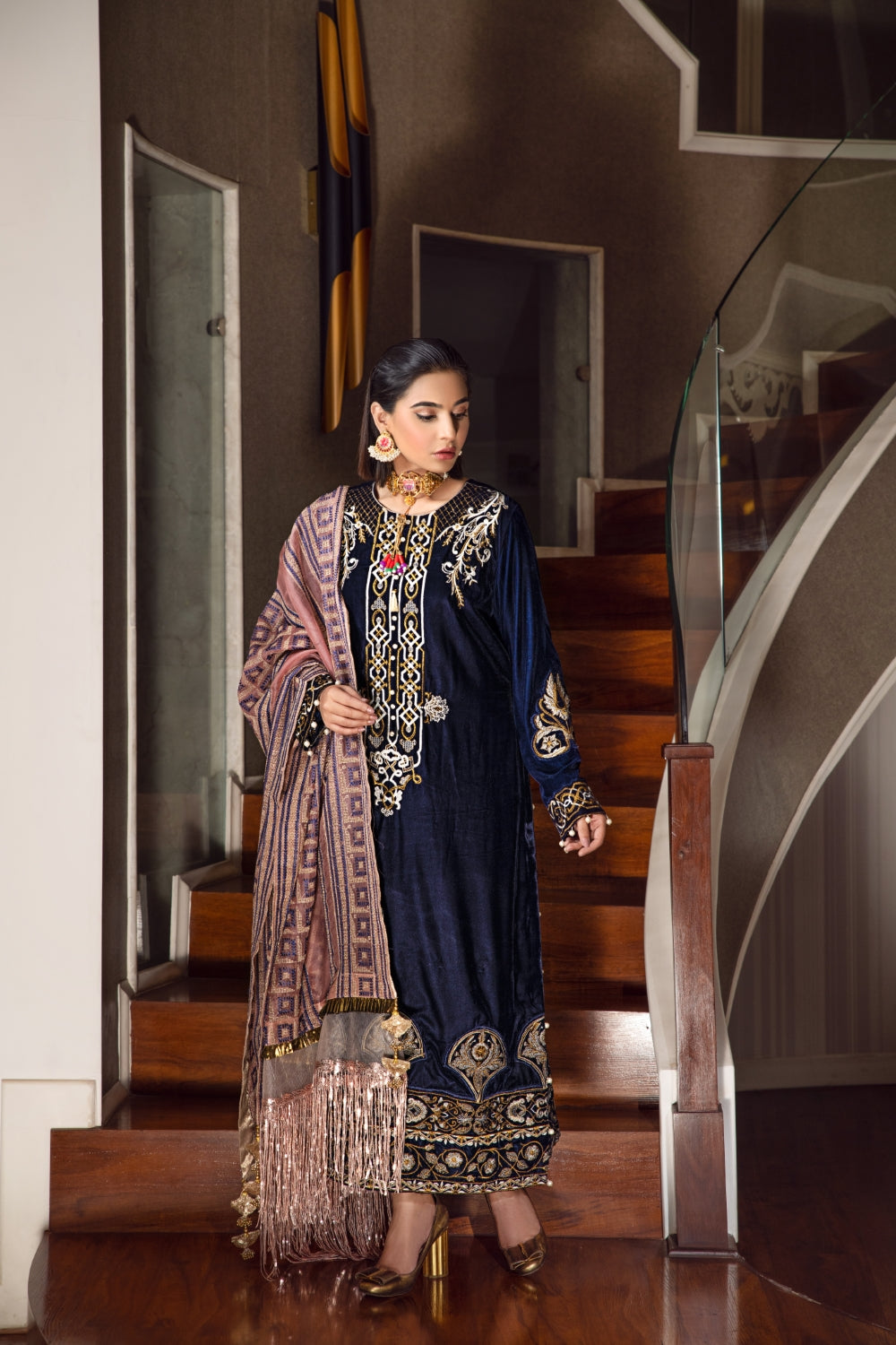 Velvet Embroidered 3Pc Withcopper Zari And Resham,