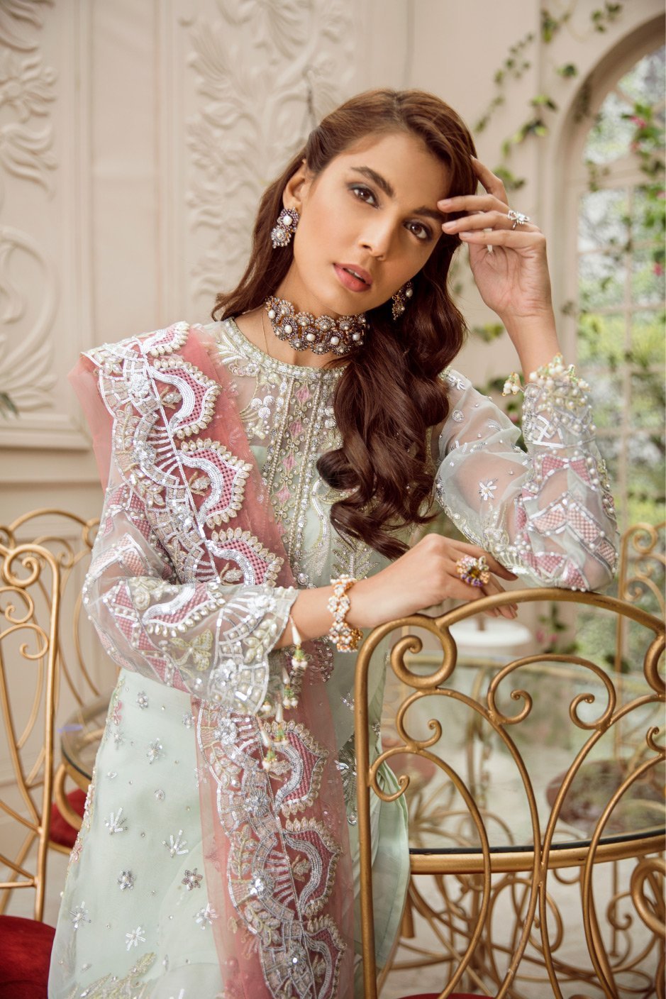 Description: Formal Dress with Hand Embroidered: Organza Body (Front, Back & Sleeves) and Daman Patch. Paired with Hand Embroidered Net Dupatta, Grip Trouser and Accessories