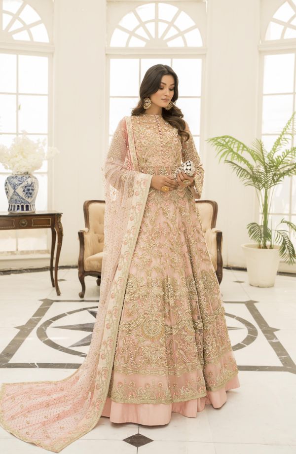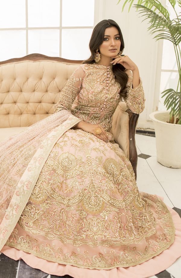 The *Gulbadan Wedding Dress* is a stunning ensemble that exudes elegance and grace. This dress is specifically designed for wedding occasions, offering a perfect blend of traditional and contemporary elements.