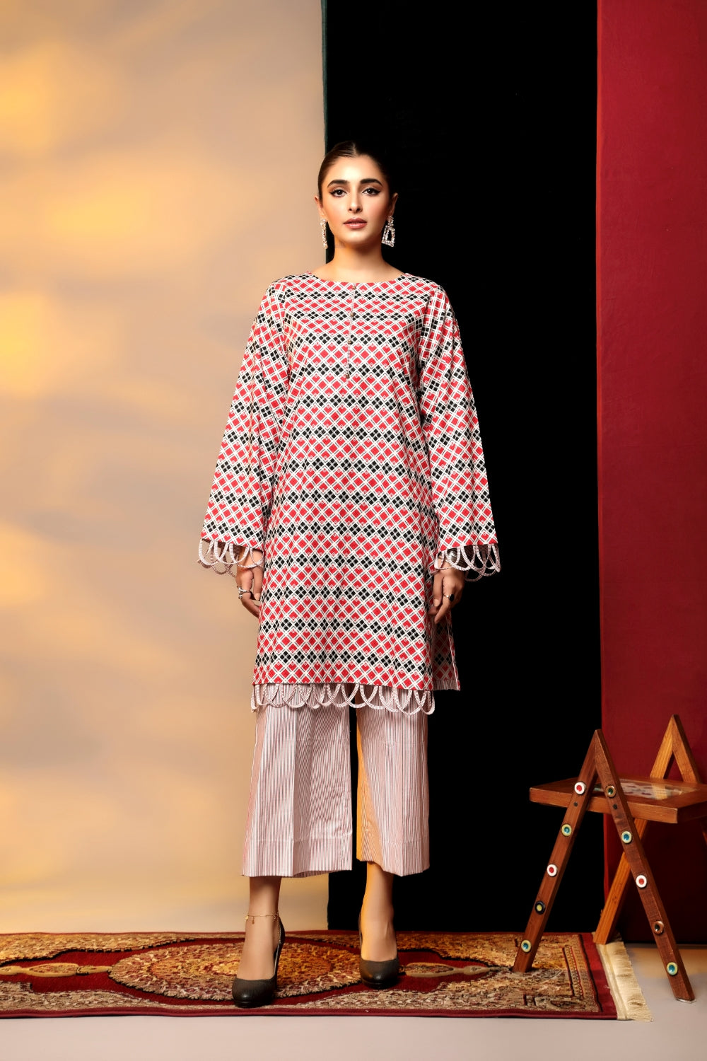 Stitched articles come with trousers tailored to match the unstitched trouser fabric provided. Please note that any appearance of shararas/ghararas in product images is for shoot purposes only unless otherwise specified in product details.
