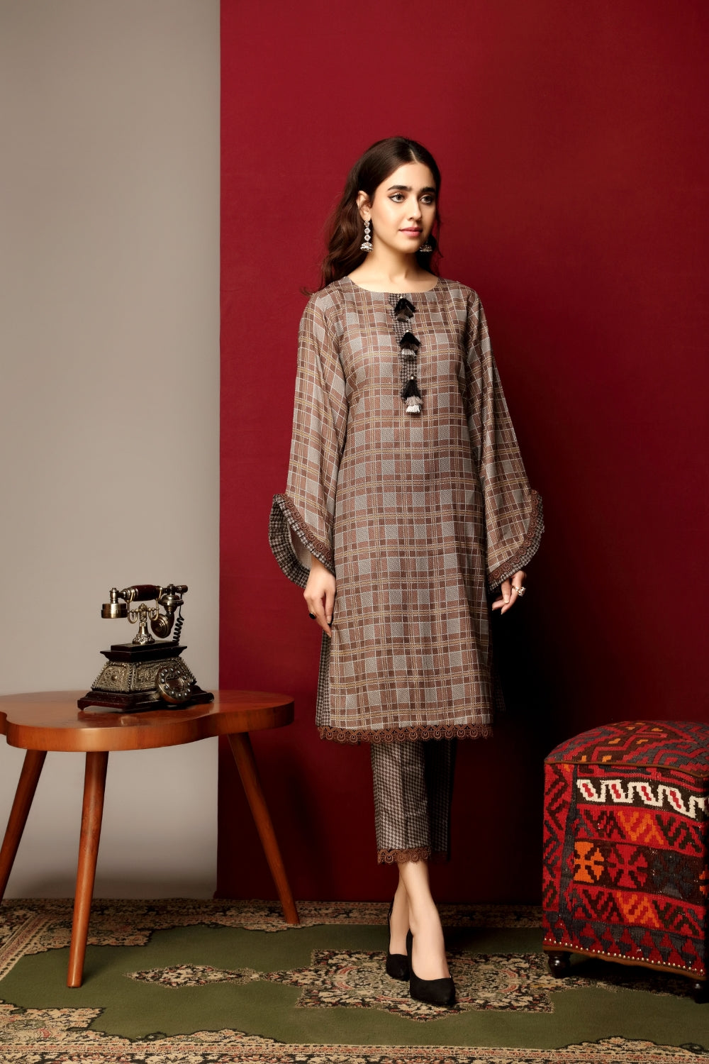Stitched articles come with trousers tailored to match the unstitched trouser fabric provided. Please note that any appearance of shararas/ghararas in product images is for shoot purposes only unless otherwise specified in product details.