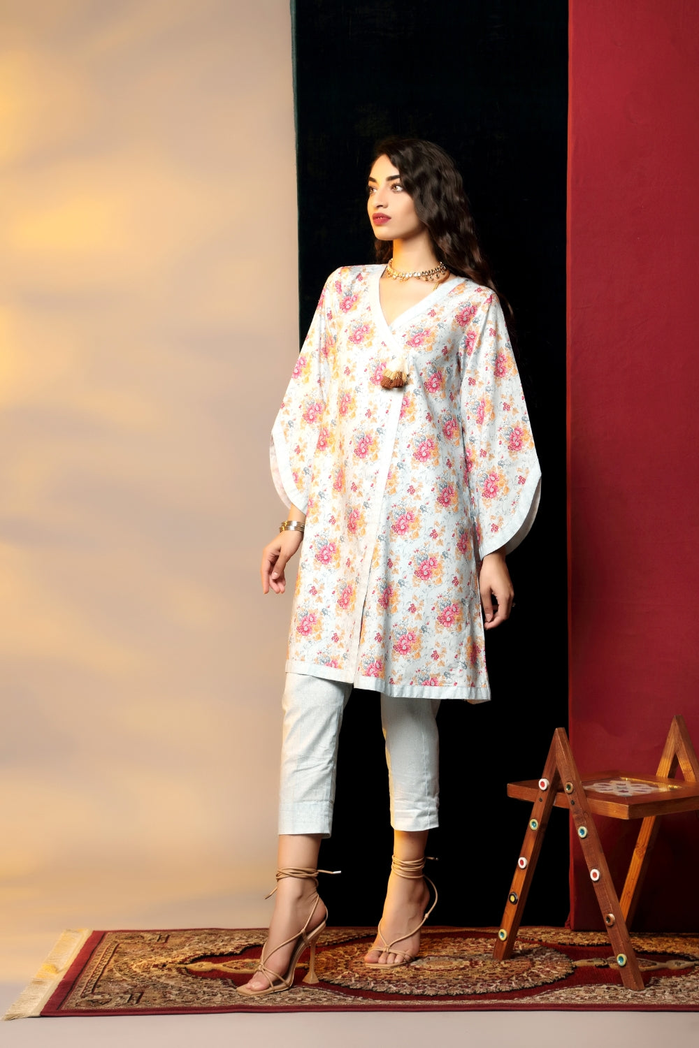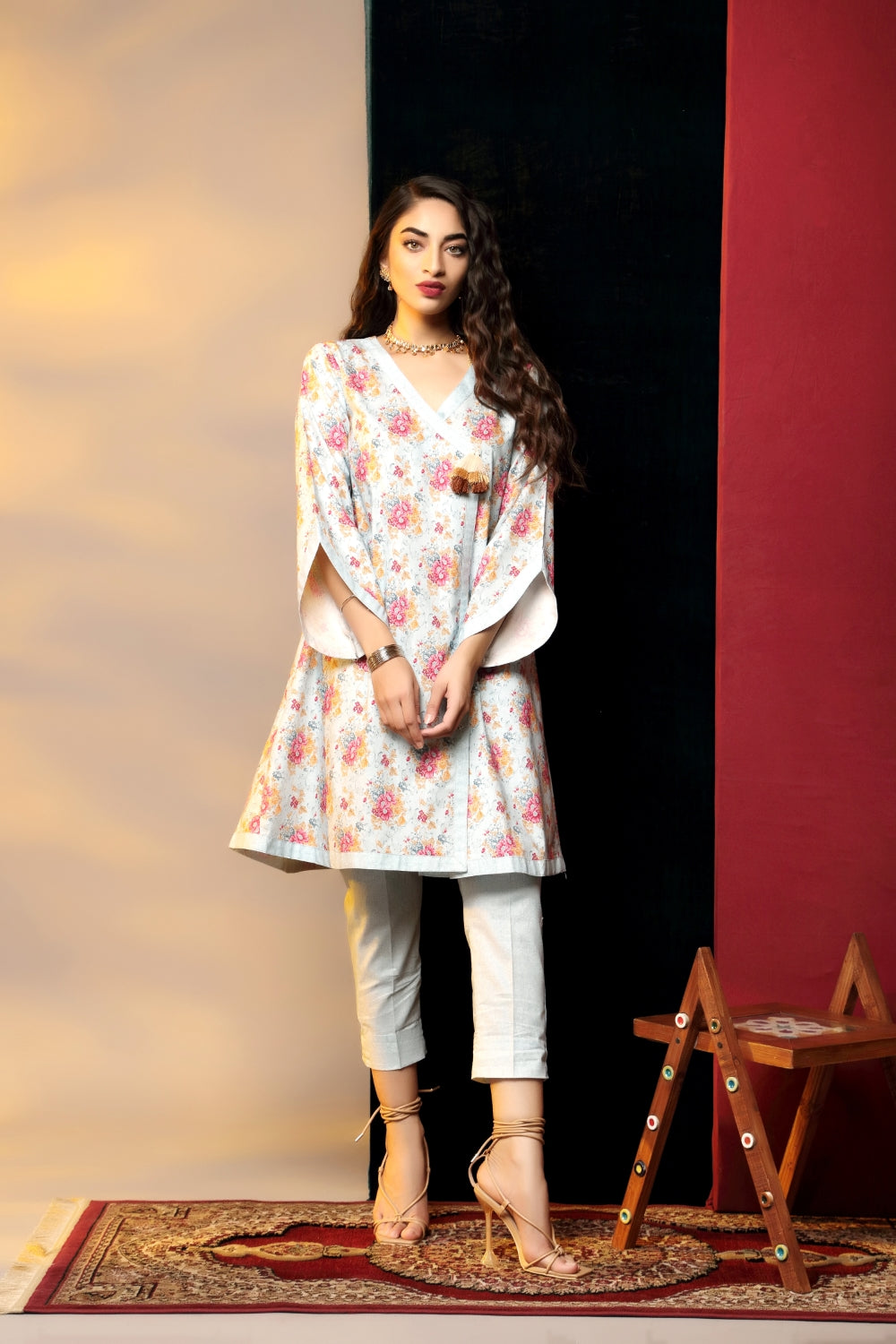 Stitched articles come with trousers tailored to match the unstitched trouser fabric provided. Please note that any appearance of shararas/ghararas in product images is for shoot purposes only unless otherwise specified in product details.