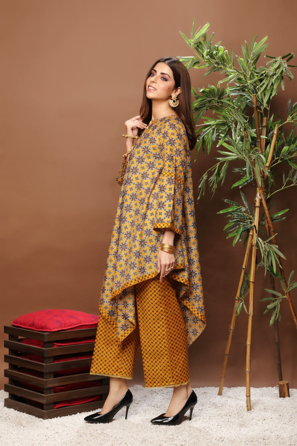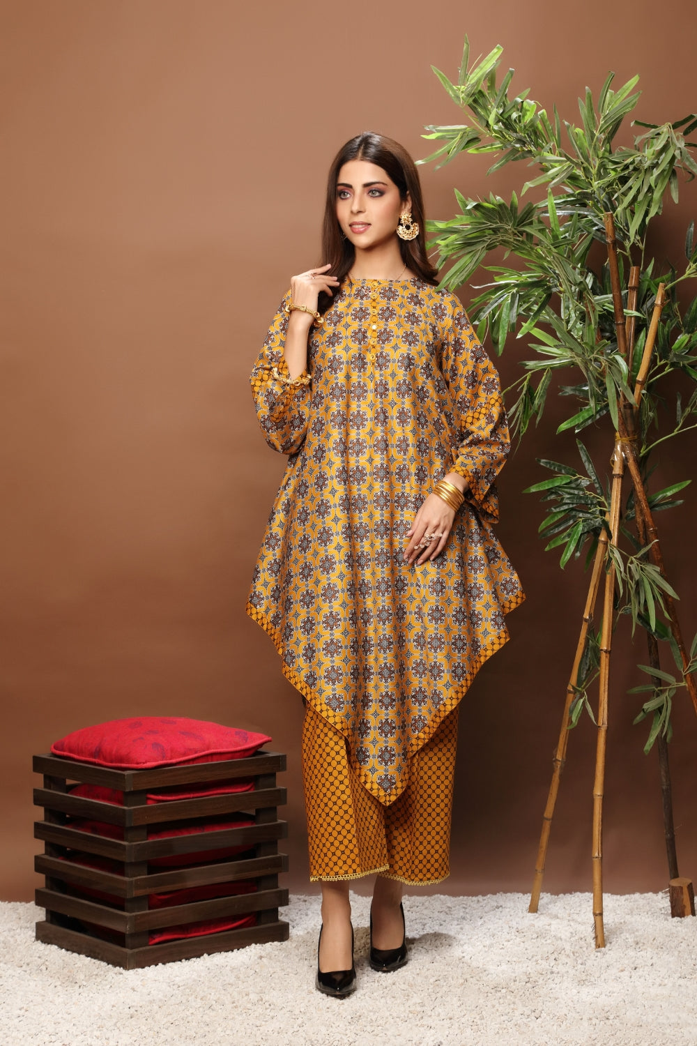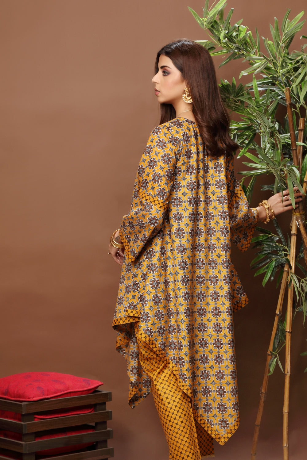 Stitched articles come with trousers tailored to match the unstitched trouser fabric provided. Please note that any appearance of shararas/ghararas in product images is for shoot purposes only unless otherwise specified in product details.