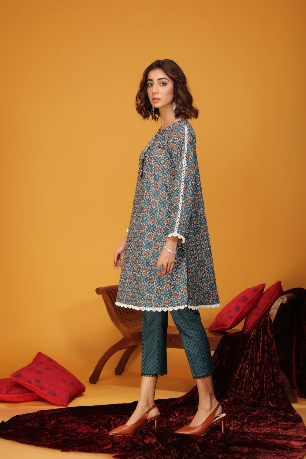 Stitched articles come with trousers tailored to match the unstitched trouser fabric provided. Please note that any appearance of shararas/ghararas in product images is for shoot purposes only unless otherwise specified in product details.