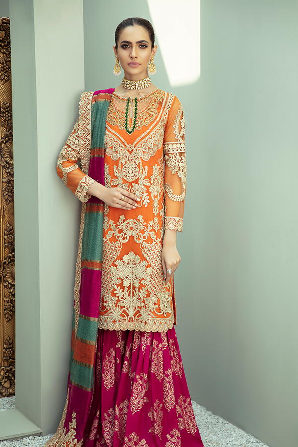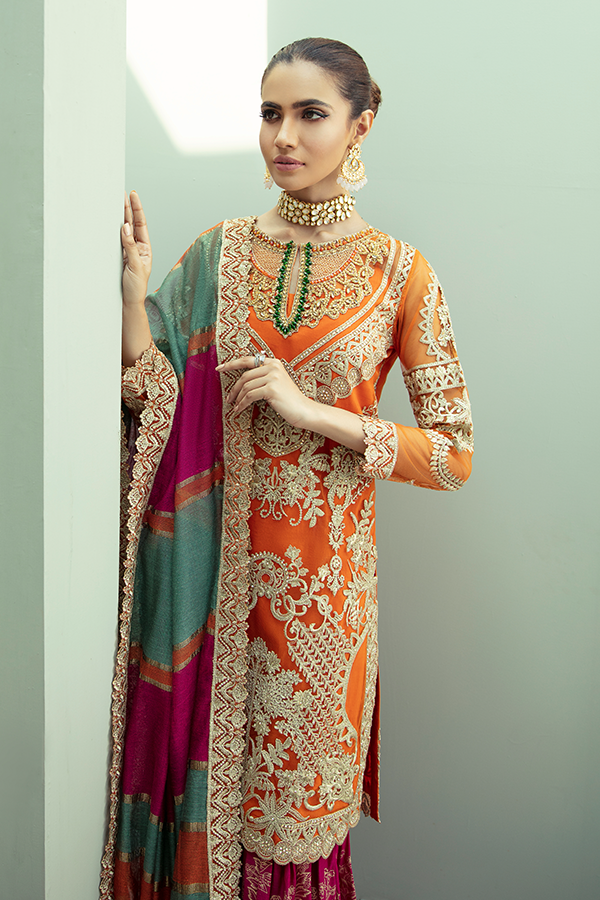 Stitched articles come with trousers tailored to match the unstitched trouser fabric provided. Please note that any appearance of shararas/ghararas in product images is for shoot purposes only unless otherwise specified in product details.
