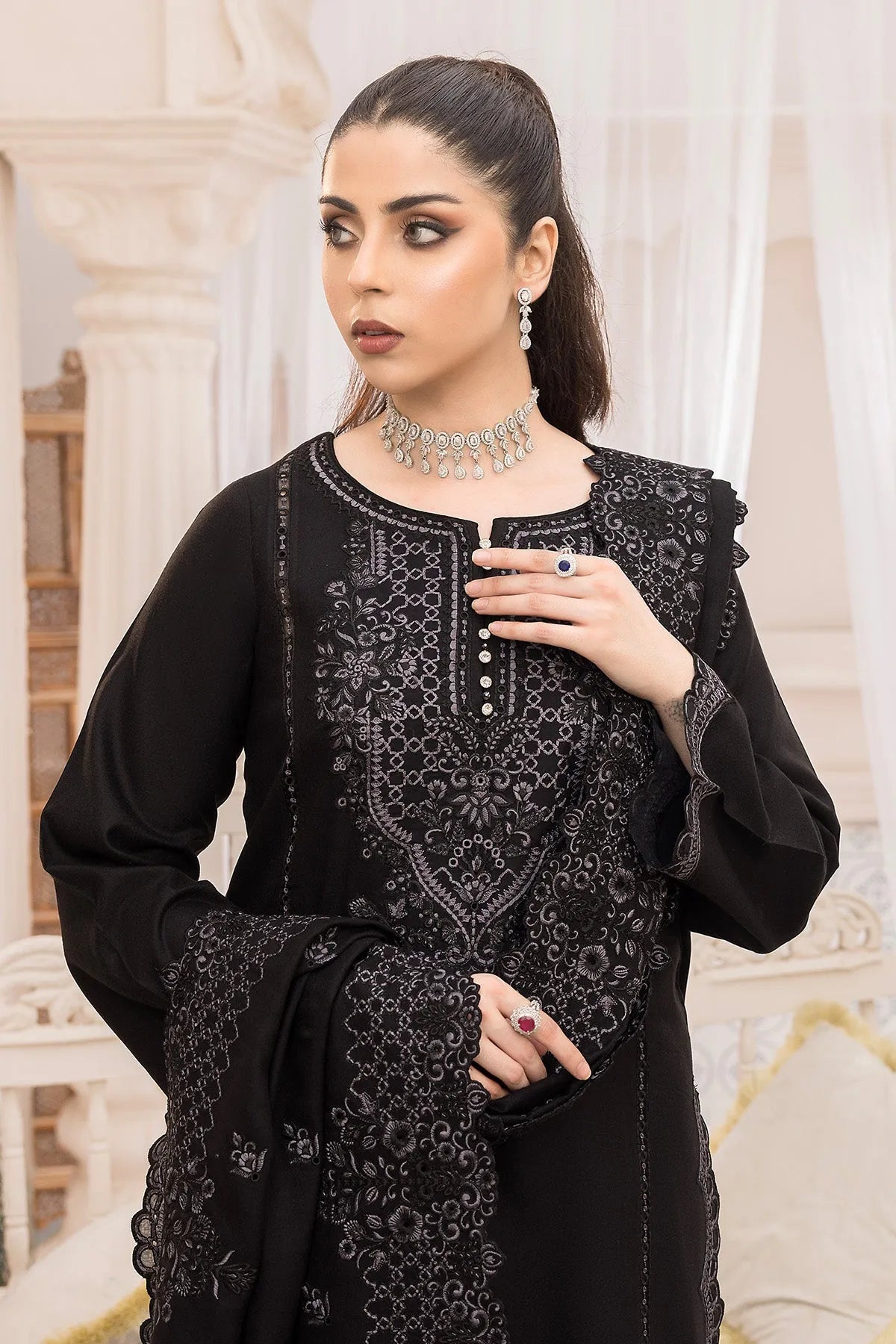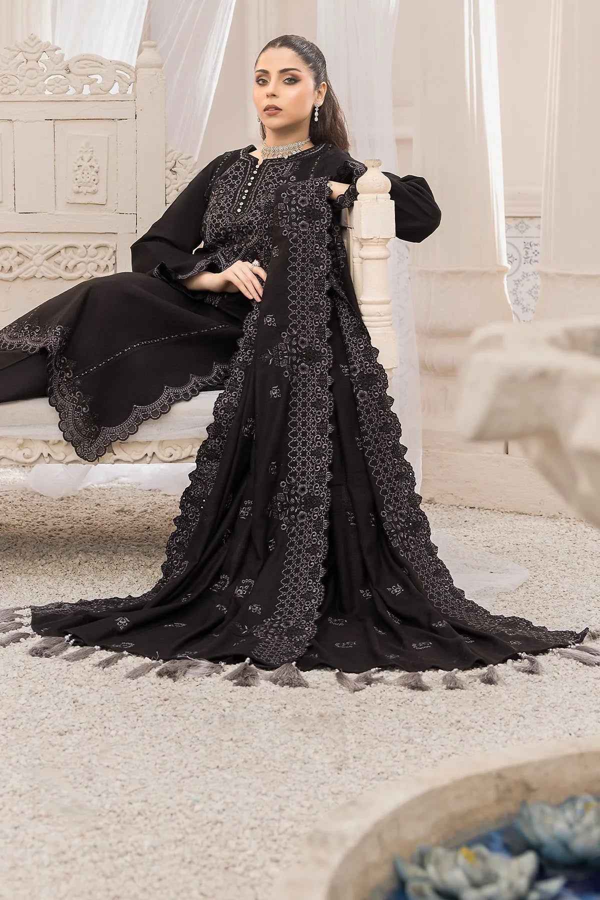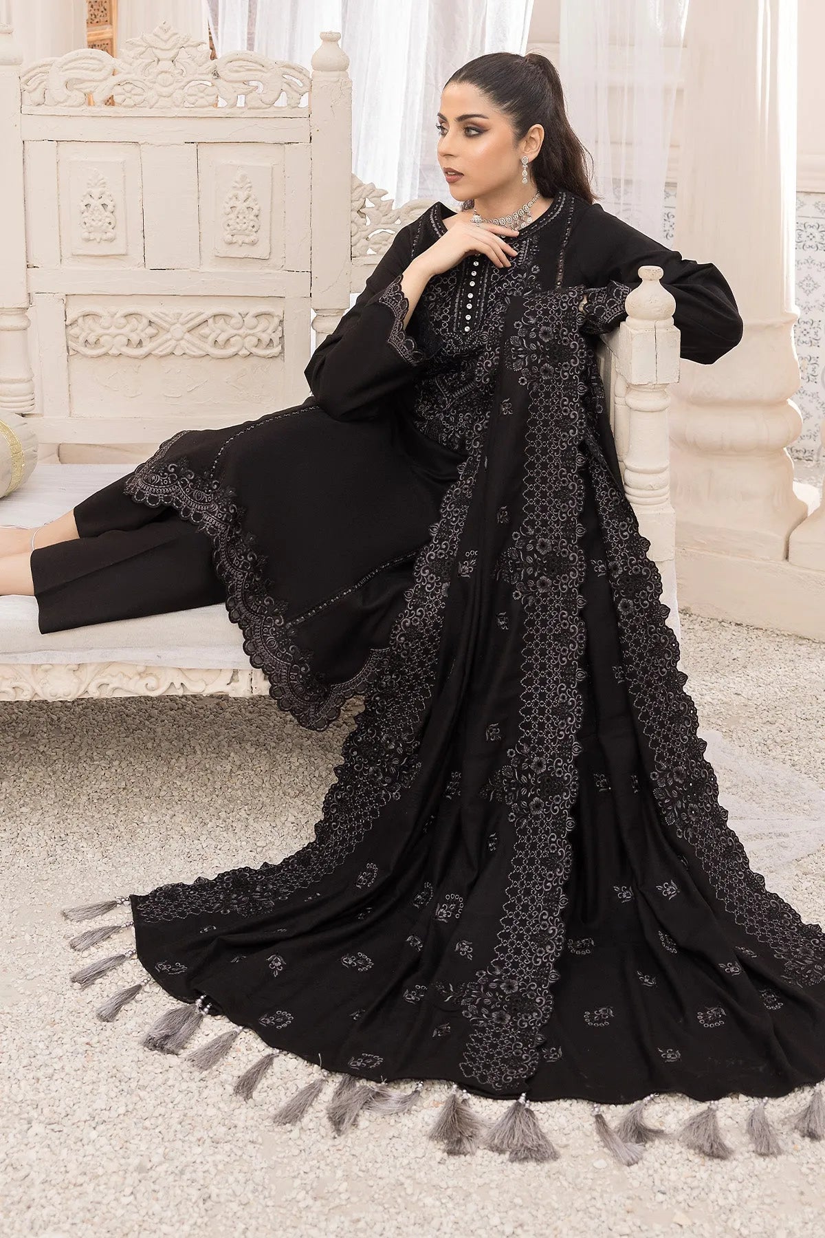 Stitched articles come with trousers tailored to match the unstitched trouser fabric provided. Please note that any appearance of shararas/ghararas in product images is for shoot purposes only unless otherwise specified in product details.