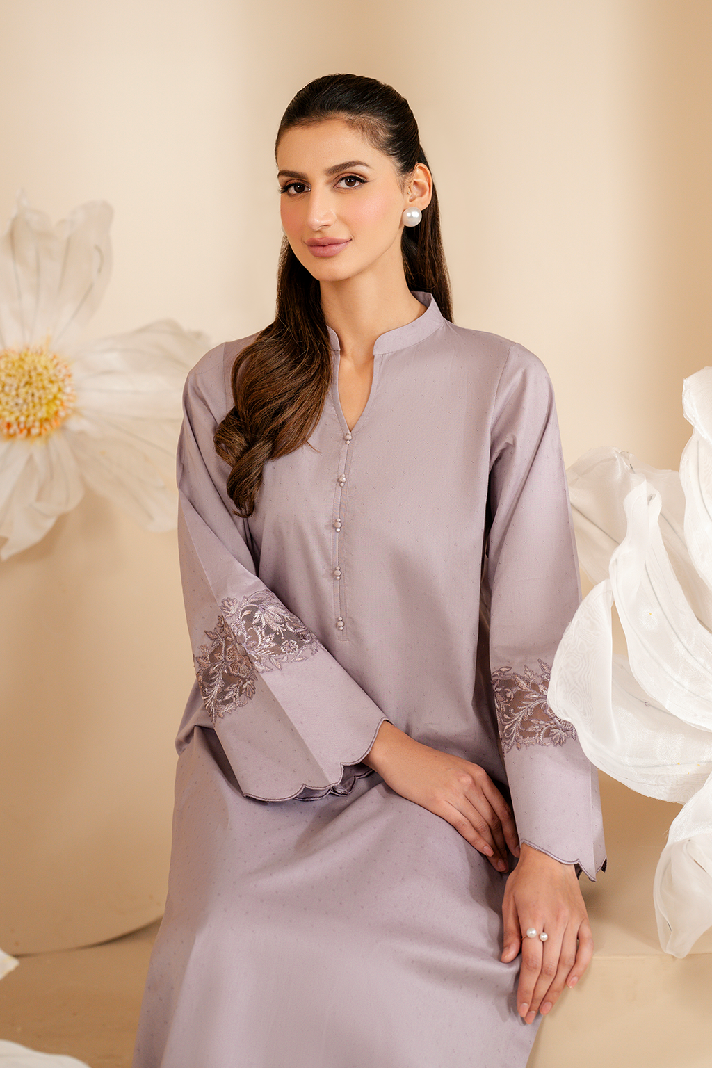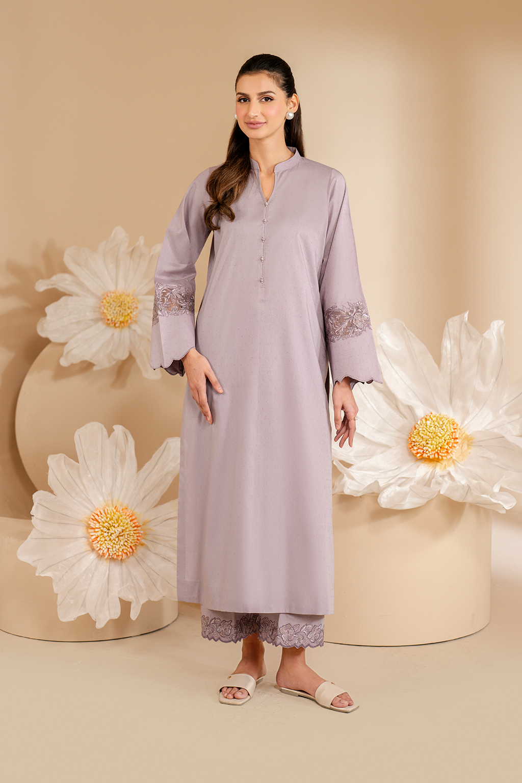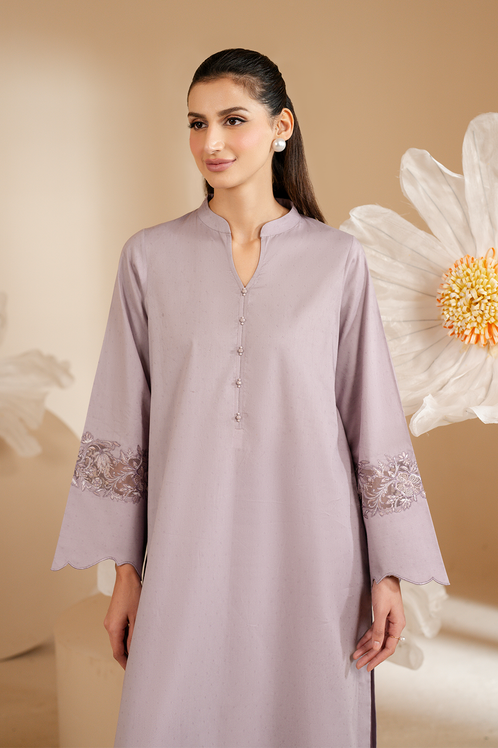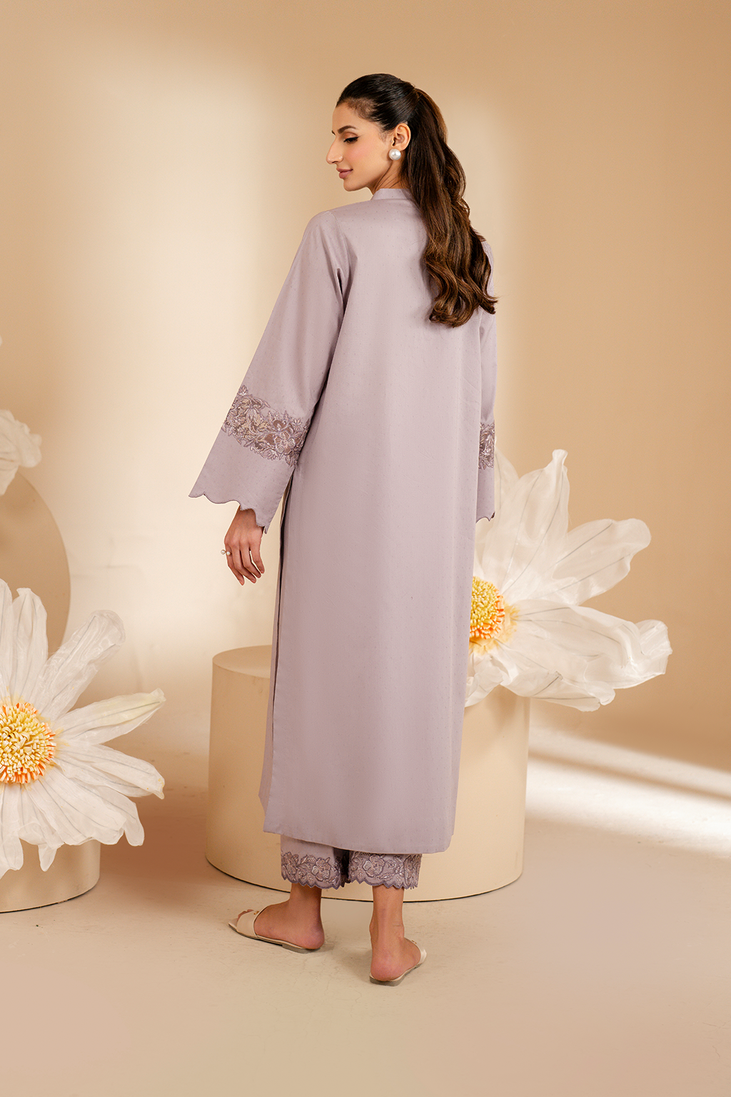 Stitched articles come with trousers tailored to match the unstitched trouser fabric provided. Please note that any appearance of shararas/ghararas in product images is for shoot purposes only unless otherwise specified in product details.
