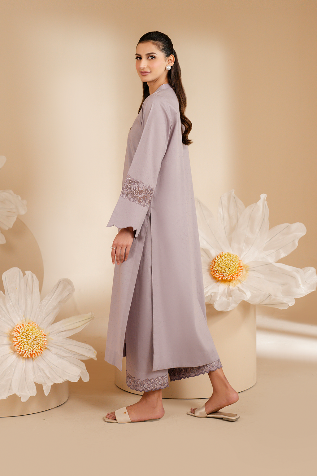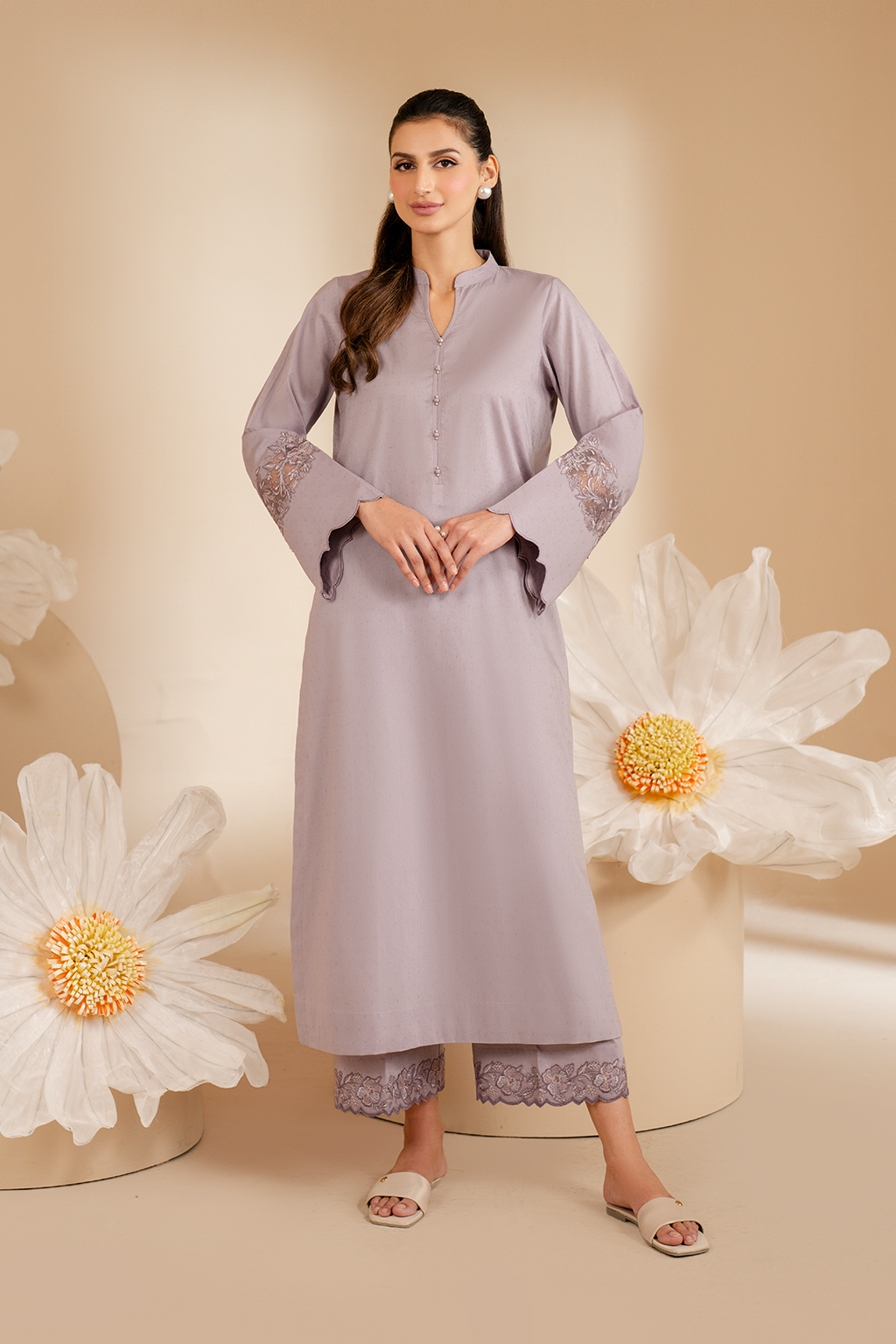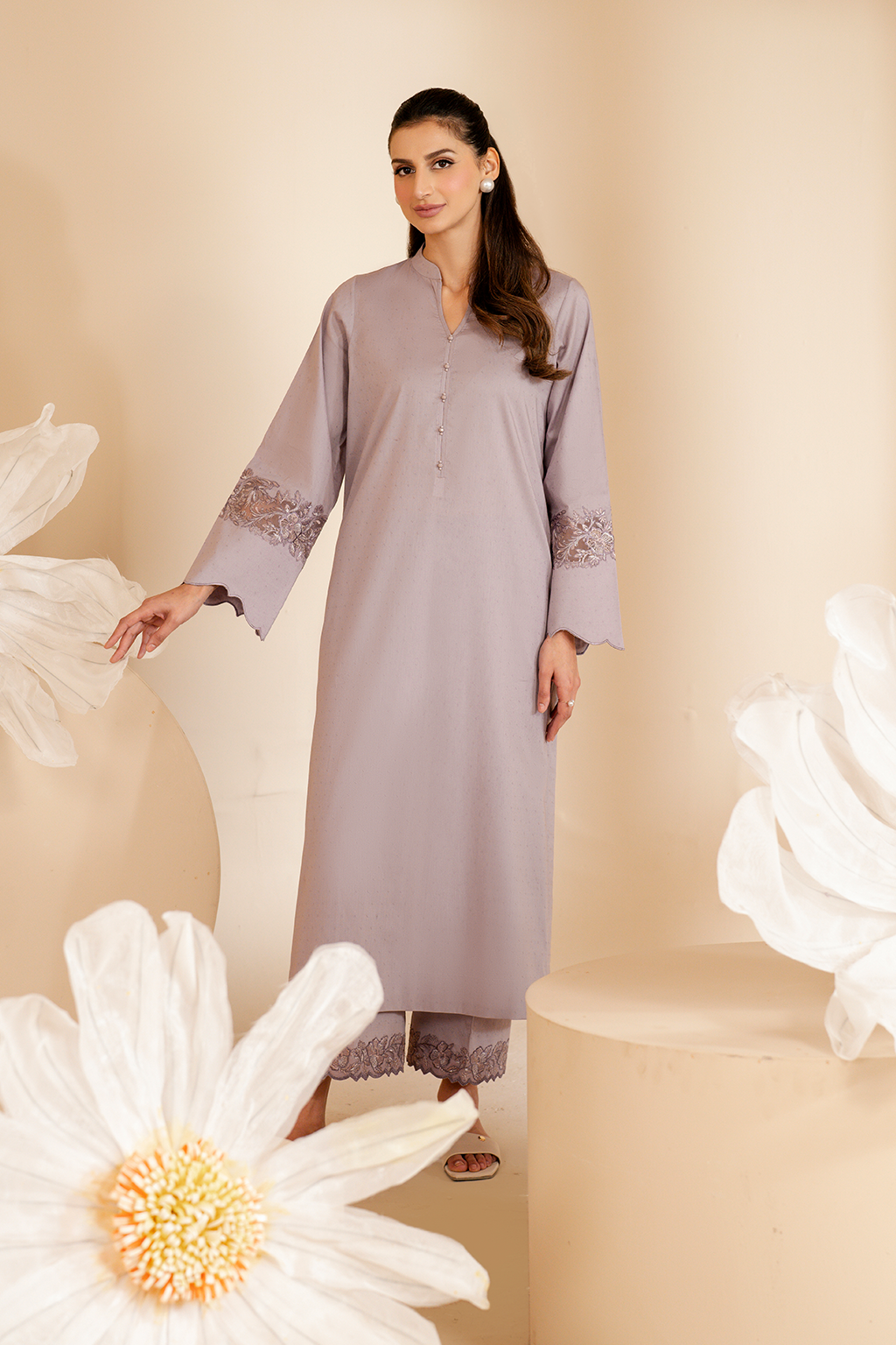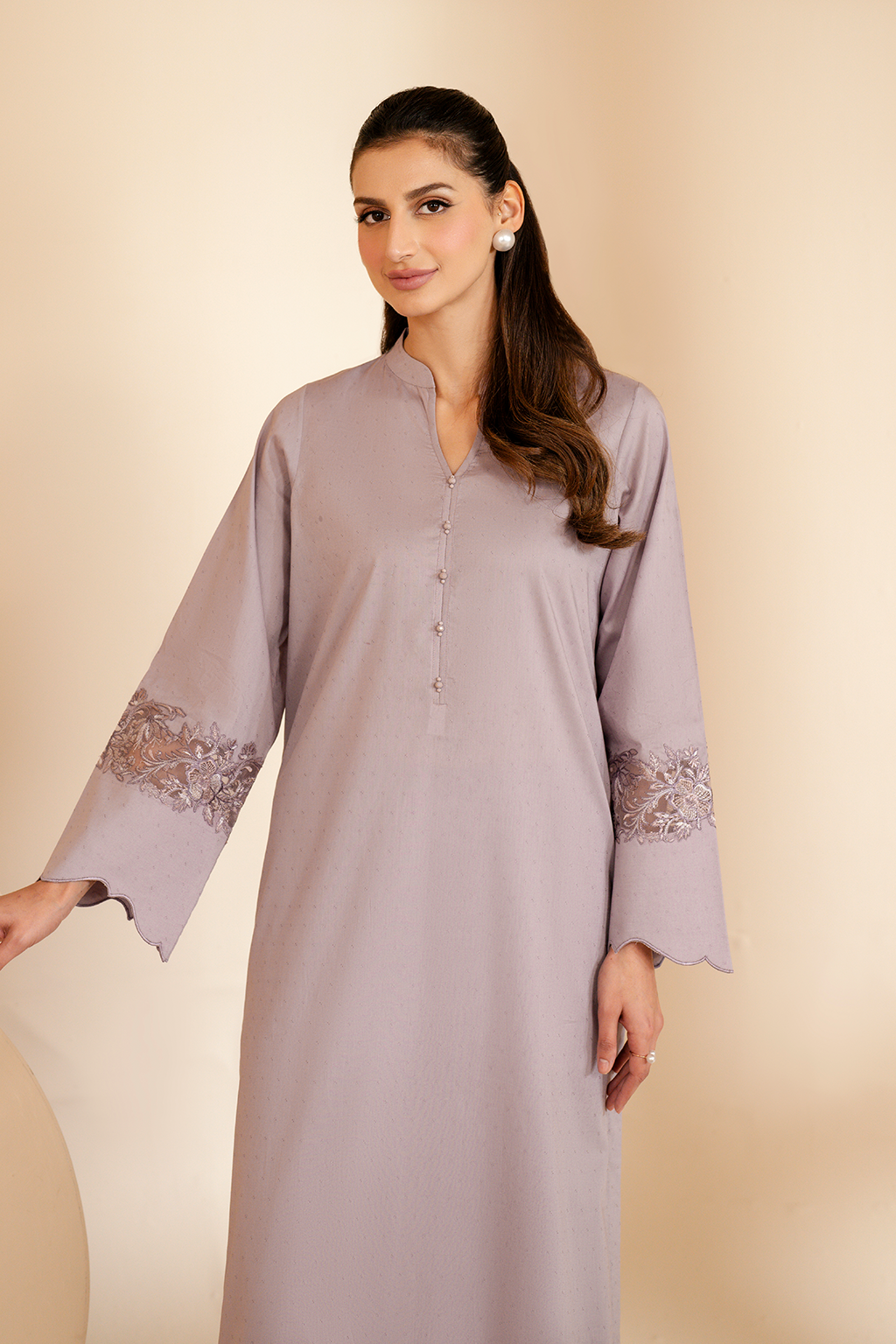 Stitched articles come with trousers tailored to match the unstitched trouser fabric provided. Please note that any appearance of shararas/ghararas in product images is for shoot purposes only unless otherwise specified in product details.
