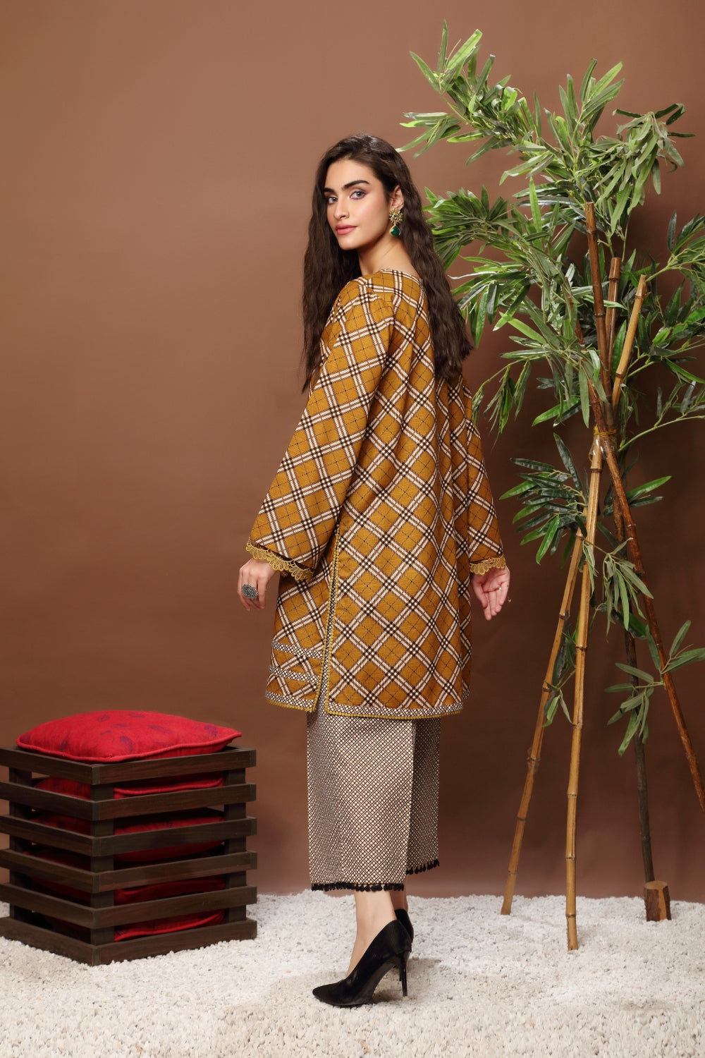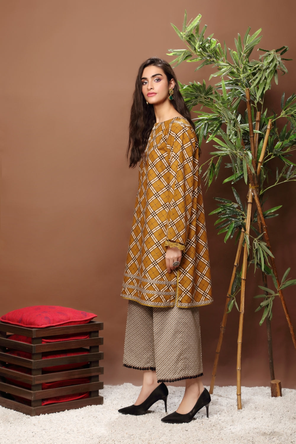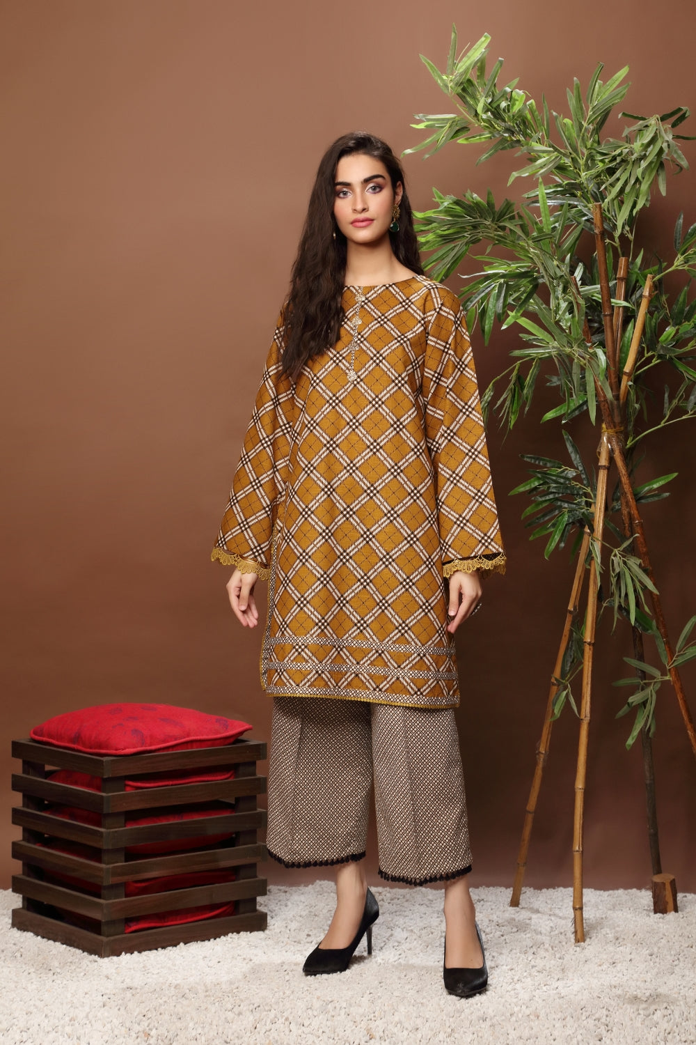 Stitched articles come with trousers tailored to match the unstitched trouser fabric provided. Please note that any appearance of shararas/ghararas in product images is for shoot purposes only unless otherwise specified in product details.