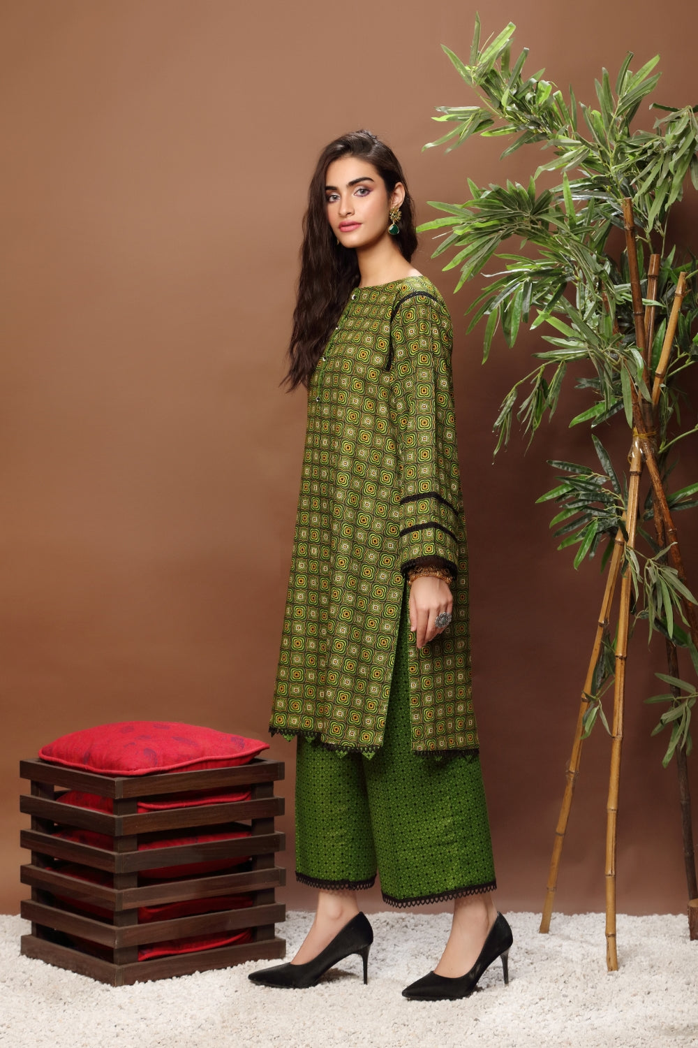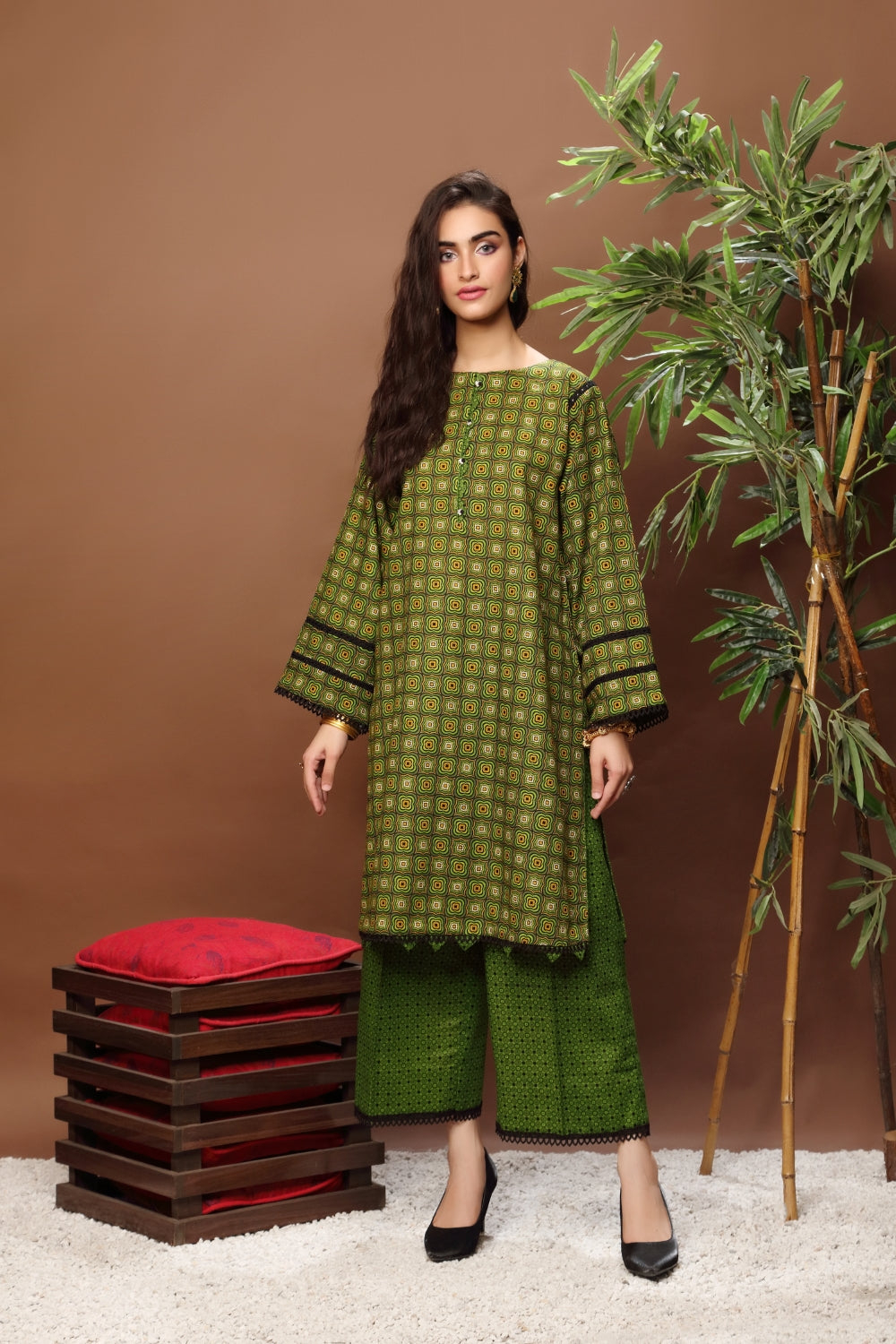 Stitched articles come with trousers tailored to match the unstitched trouser fabric provided. Please note that any appearance of shararas/ghararas in product images is for shoot purposes only unless otherwise specified in product details.