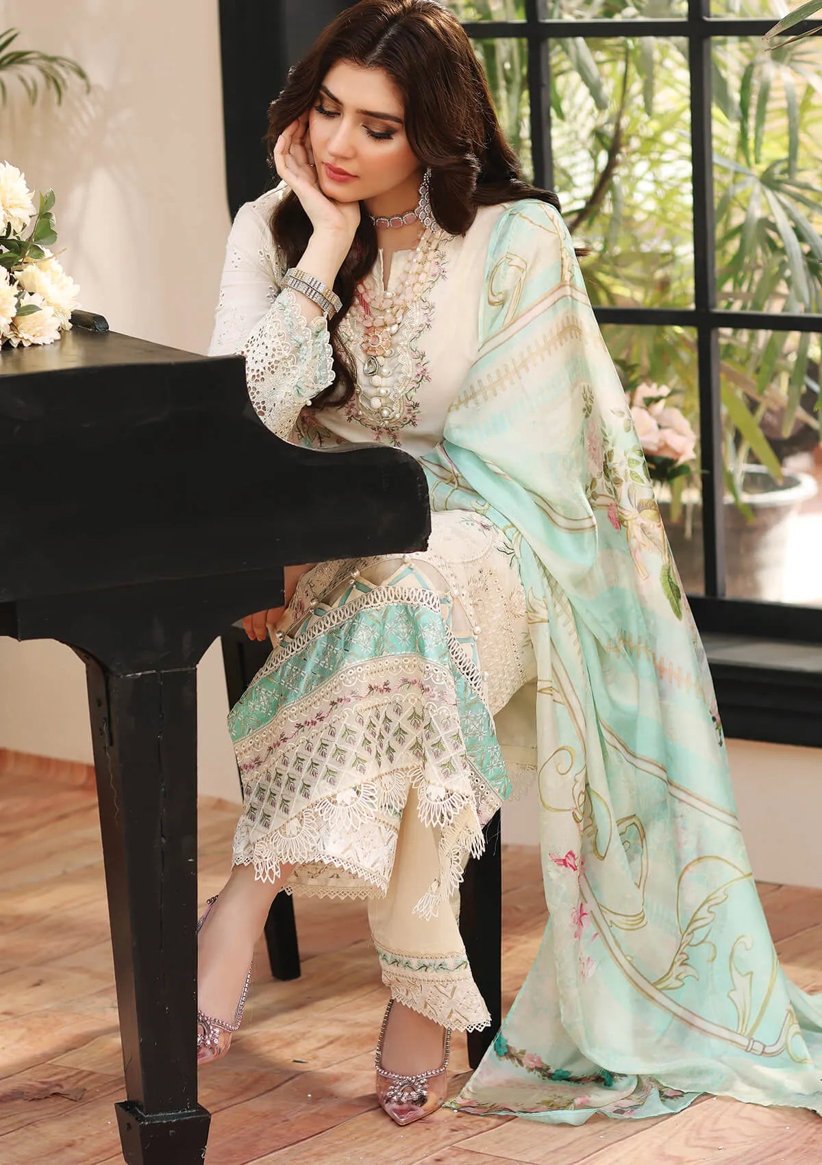 Stitched articles come with trousers tailored to match the unstitched trouser fabric provided. Please note that any appearance of shararas/ghararas in product images is for shoot purposes only unless otherwise specified in product details.