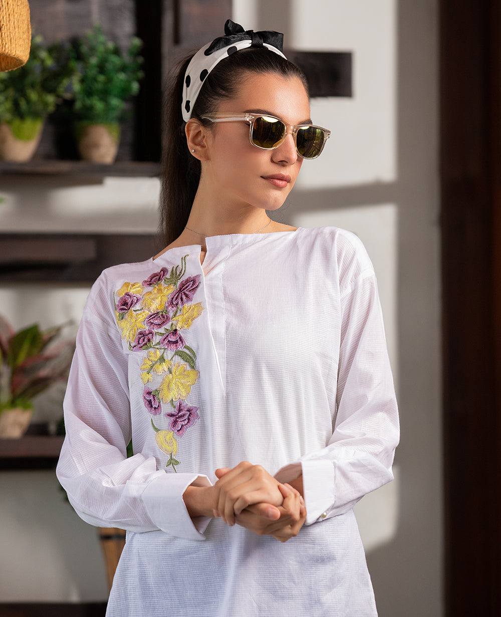Stitched articles come with trousers tailored to match the unstitched trouser fabric provided. Please note that any appearance of shararas/ghararas in product images is for shoot purposes only unless otherwise specified in product details.