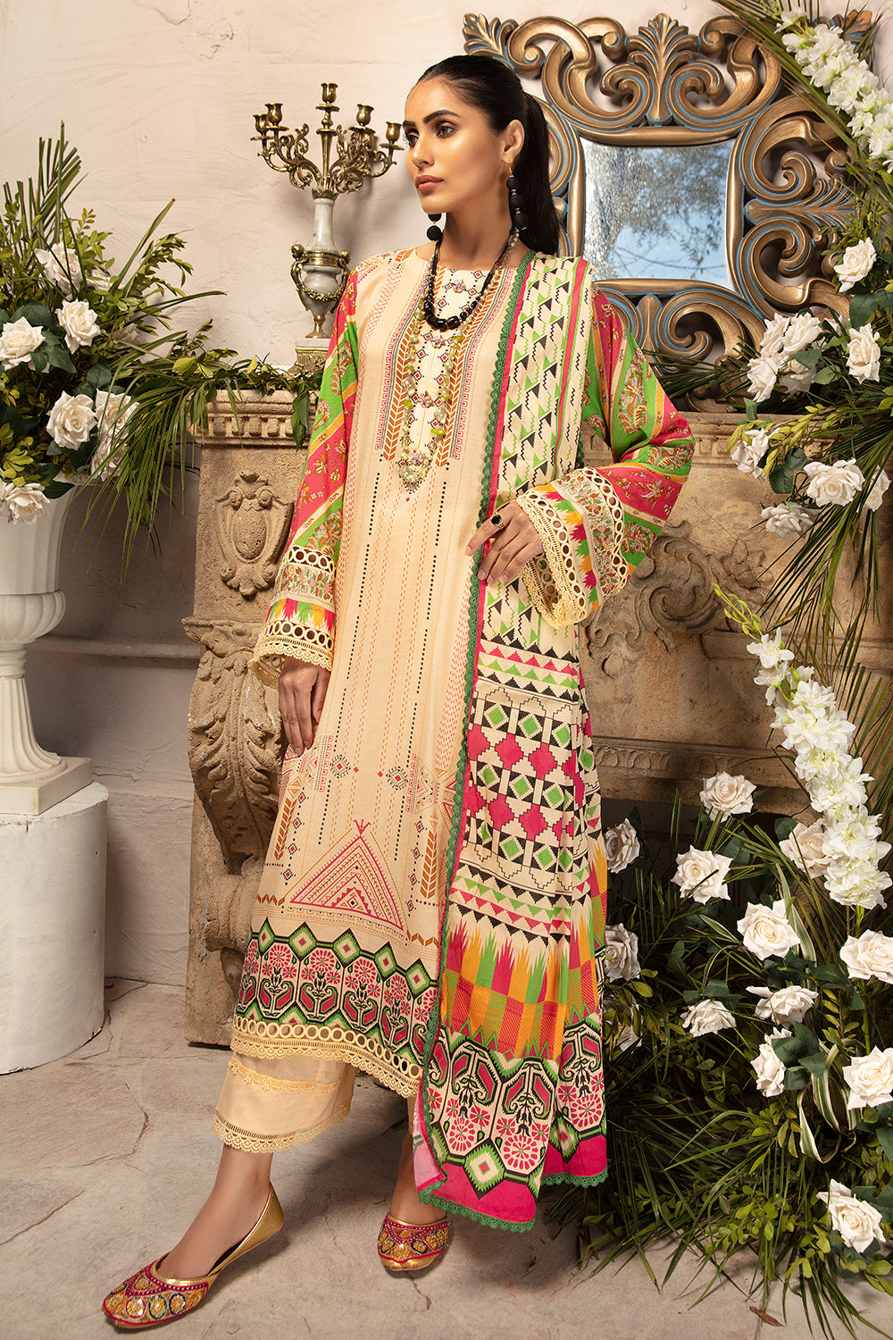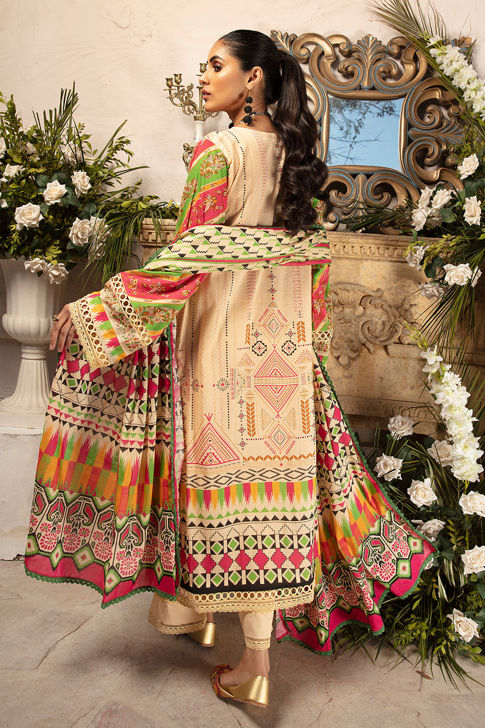 Stitched articles come with trousers tailored to match the unstitched trouser fabric provided. Please note that any appearance of shararas/ghararas in product images is for shoot purposes only unless otherwise specified in product details.