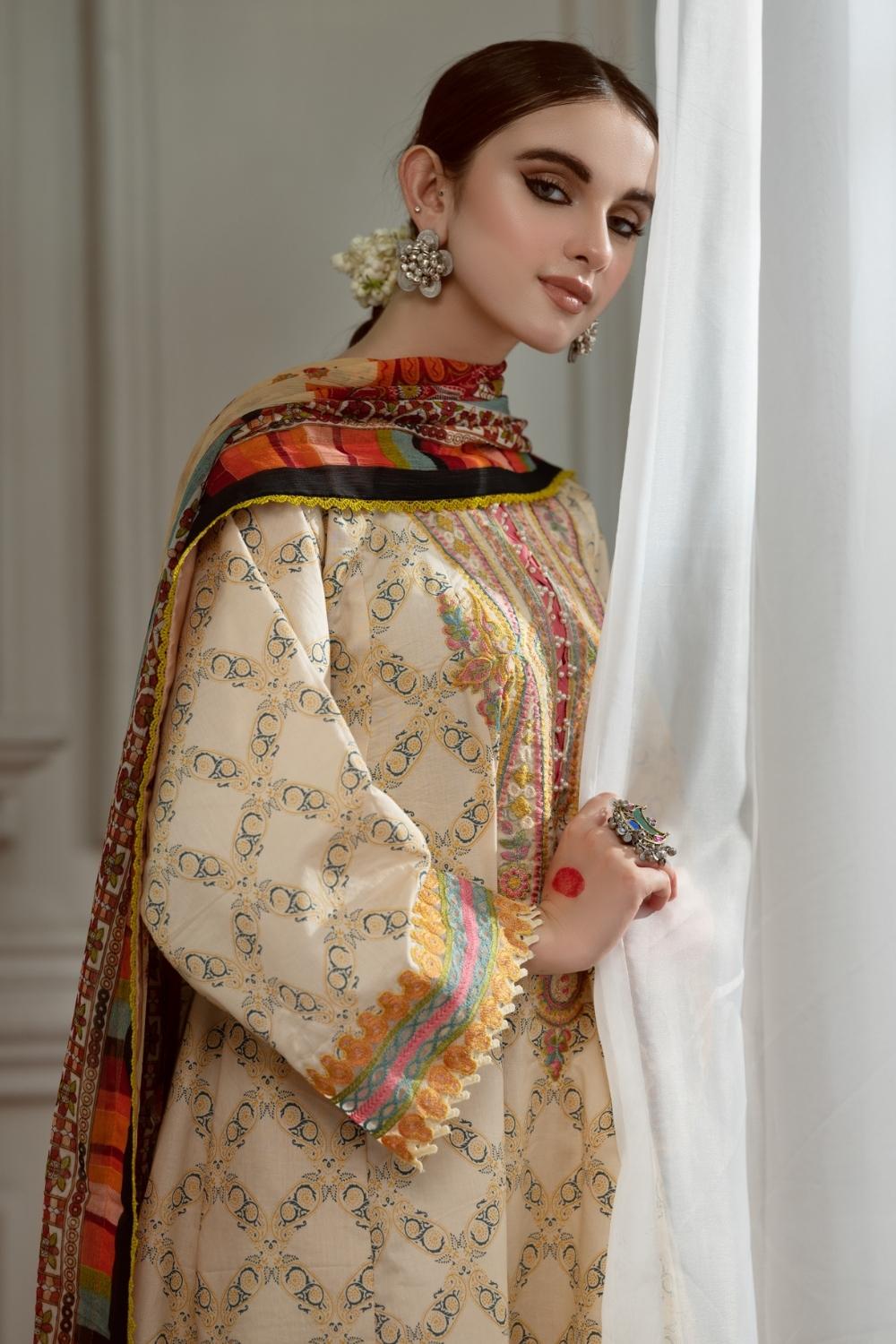 3PC Unstitched Printed+Embroidered Lawn Shirt | Chiffon Printed Dupatta | Cambric Dyed Trouser