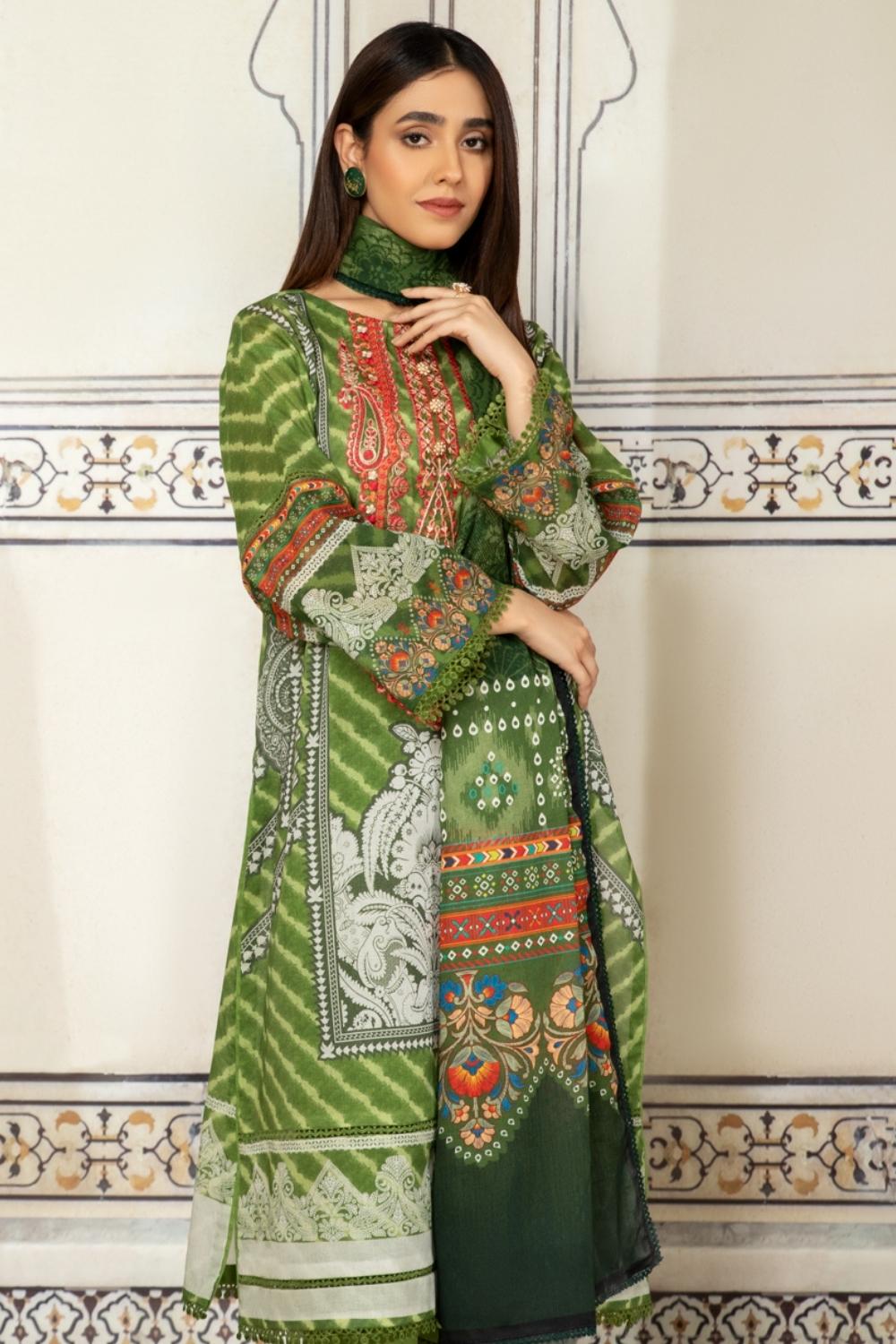 3PC Unstitched Printed+Embroidered Lawn Shirt | Cotton Net Printed Dupatta | Cambric Dyed Trouser