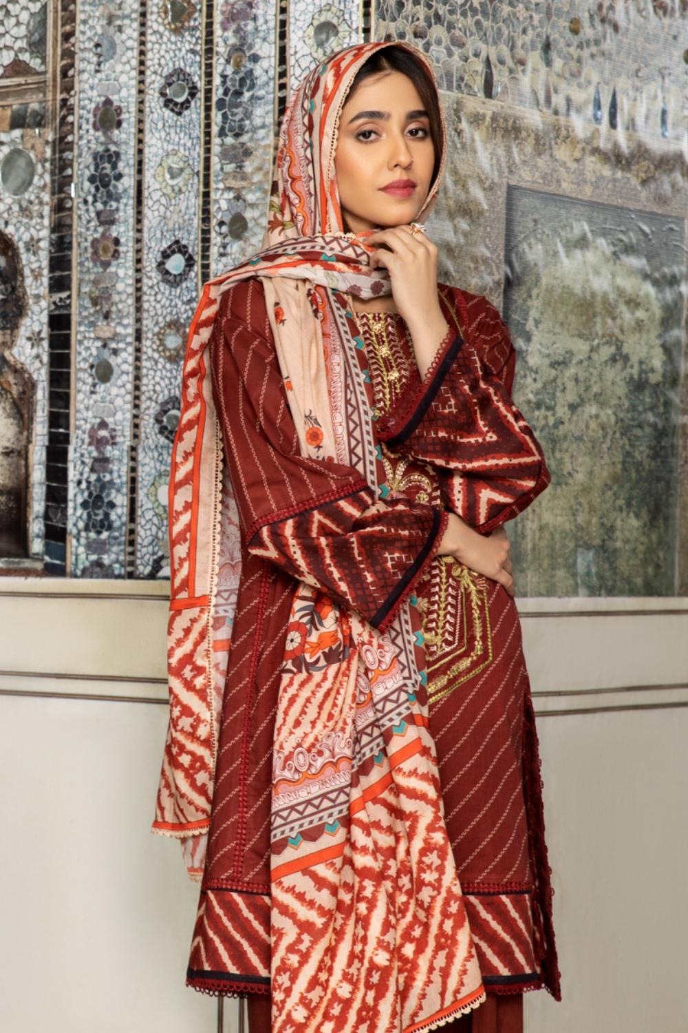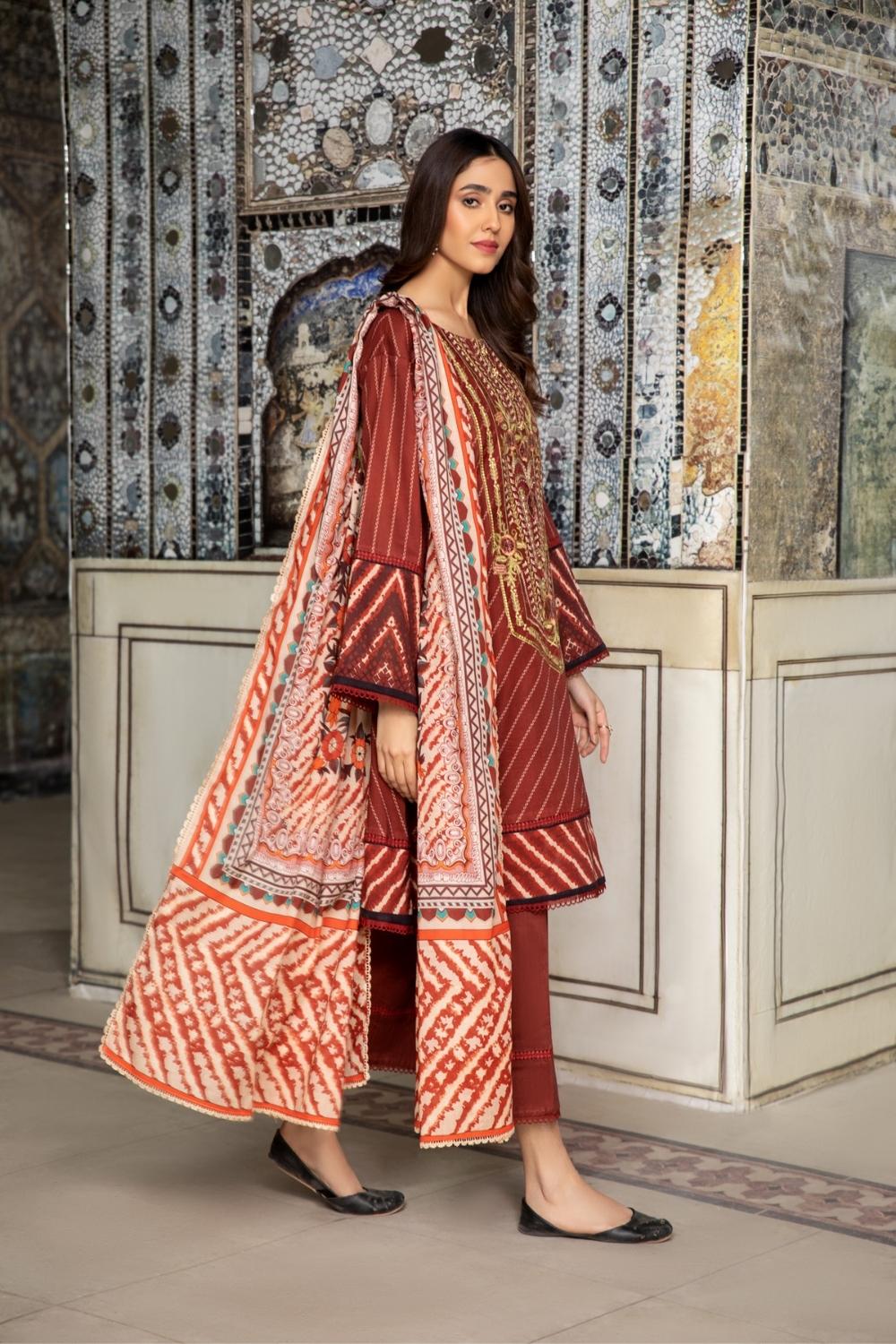 3PC Unstitched Printed+Embroidered Lawn Shirt | Cotton Net Printed Dupatta | Cambric Dyed Trouser