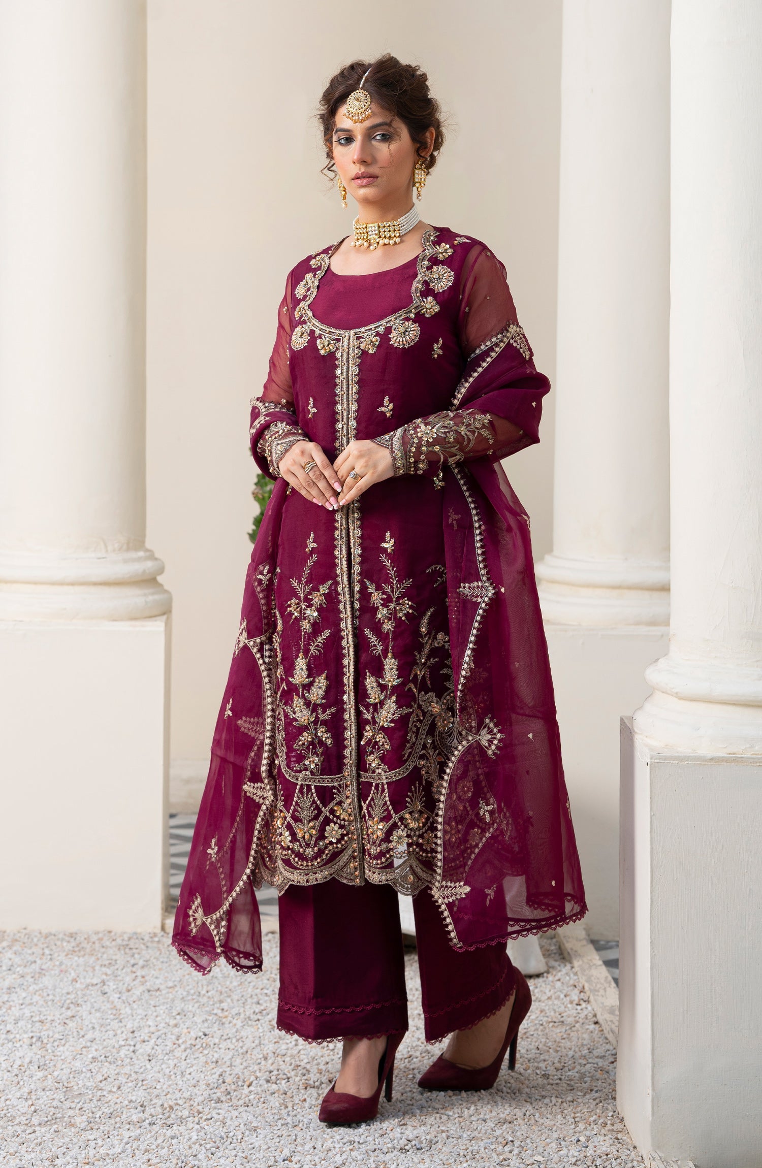 A lovely addition to your formal wardrobe. This gorgeous 3 piece suit features intricate embroidery and adda work on a strikingly beautiful magenta organza shirt. Paired with plain raw silk trousers and lovely organza embroidered dupatta.