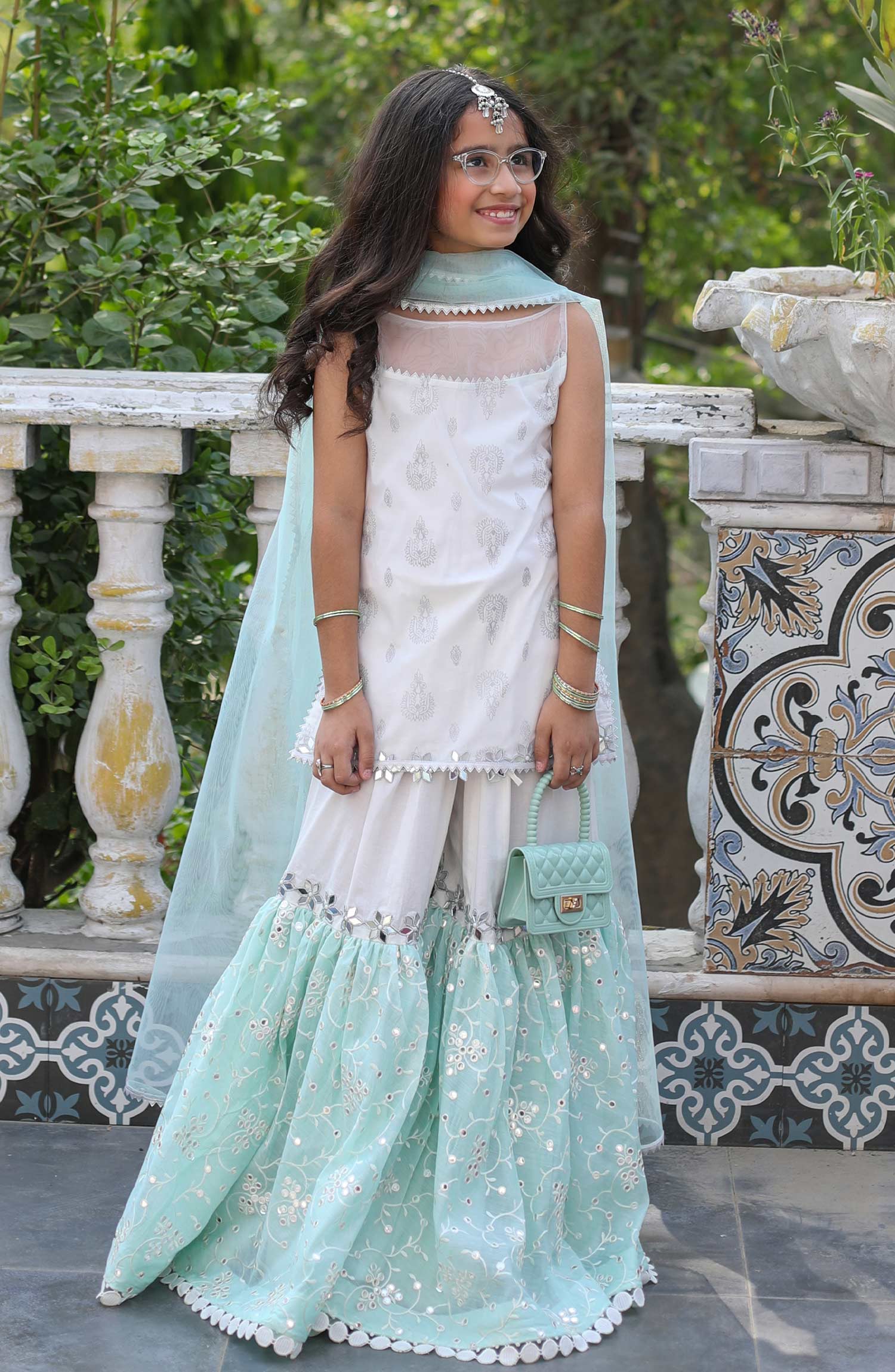 Stitched articles come with trousers tailored to match the unstitched trouser fabric provided. Please note that any appearance of shararas/ghararas in product images is for shoot purposes only unless otherwise specified in product details.